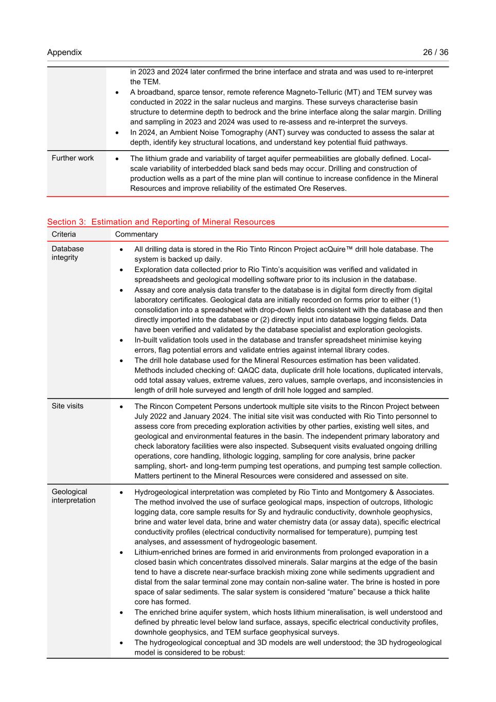 Appendix 26 / 36 RioTintoNonBusiness in 2023 and 2024 later confirmed the brine interface and strata and was used to re-interpret the TEM. • A broadband, sparce tensor, remote reference Magneto-Telluric (MT) and TEM survey was conducted in 2022 in the salar nucleus and margins. These surveys characterise basin structure to determine depth to bedrock and the brine interface along the salar margin. Drilling and sampling in 2023 and 2024 was used to re-assess and re-interpret the surveys. • In 2024, an Ambient Noise Tomography (ANT) survey was conducted to assess the salar at depth, identify key structural locations, and understand key potential fluid pathways. Further work • The lithium grade and variability of target aquifer permeabilities are globally defined. Local- scale variability of interbedded black sand beds may occur. Drilling and construction of production wells as a part of the mine plan will continue to increase confidence in the Mineral Resources and improve reliability of the estimated Ore Reserves. Section 3: Estimation and Reporting of Mineral Resources Criteria Commentary Database integrity • All drilling data is stored in the Rio Tinto Rincon Project acQuire™ drill hole database. The system is backed up daily. • Exploration data collected prior to Rio Tinto’s acquisition was verified and validated in spreadsheets and geological modelling software prior to its inclusion in the database. • Assay and core analysis data transfer to the database is in digital form directly from digital laboratory certificates. Geological data are initially recorded on forms prior to either (1) consolidation into a spreadsheet with drop-down fields consistent with the database and then directly imported into the database or (2) directly input into database logging fields. Data have been verified and validated by the database specialist and exploration geologists. • In-built validation tools used in the database and transfer spreadsheet minimise keying errors, flag potential errors and validate entries against internal library codes. • The drill hole database used for the Mineral Resources estimation has been validated. Methods included checking of: QAQC data, duplicate drill hole locations, duplicated intervals, odd total assay values, extreme values, zero values, sample overlaps, and inconsistencies in length of drill hole surveyed and length of drill hole logged and sampled. Site visits • The Rincon Competent Persons undertook multiple site visits to the Rincon Project between July 2022 and January 2024. The initial site visit was conducted with Rio Tinto personnel to assess core from preceding exploration activities by other parties, existing well sites, and geological and environmental features in the basin. The independent primary laboratory and check laboratory facilities were also inspected. Subsequent visits evaluated ongoing drilling operations, core handling, lithologic logging, sampling for core analysis, brine packer sampling, short- and long-term pumping test operations, and pumping test sample collection. Matters pertinent to the Mineral Resources were considered and assessed on site. Geological interpretation • Hydrogeological interpretation was completed by Rio Tinto and Montgomery & Associates. The method involved the use of surface geological maps, inspection of outcrops, lithologic logging data, core sample results for Sy and hydraulic conductivity, downhole geophysics, brine and water level data, brine and water chemistry data (or assay data), specific electrical conductivity profiles (electrical conductivity normalised for temperature), pumping test analyses, and assessment of hydrogeologic basement. • Lithium-enriched brines are formed in arid environments from prolonged evaporation in a closed basin which concentrates dissolved minerals. Salar margins at the edge of the basin tend to have a discrete near-surface brackish mixing zone while sediments upgradient and distal from the salar terminal zone may contain non-saline water. The brine is hosted in pore space of salar sediments. The salar system is considered “mature” because a thick halite core has formed. • The enriched brine aquifer system, which hosts lithium mineralisation, is well understood and defined by phreatic level below land surface, assays, specific electrical conductivity profiles, downhole geophysics, and TEM surface geophysical surveys. • The hydrogeological conceptual and 3D models are well understood; the 3D hydrogeological model is considered to be robust: