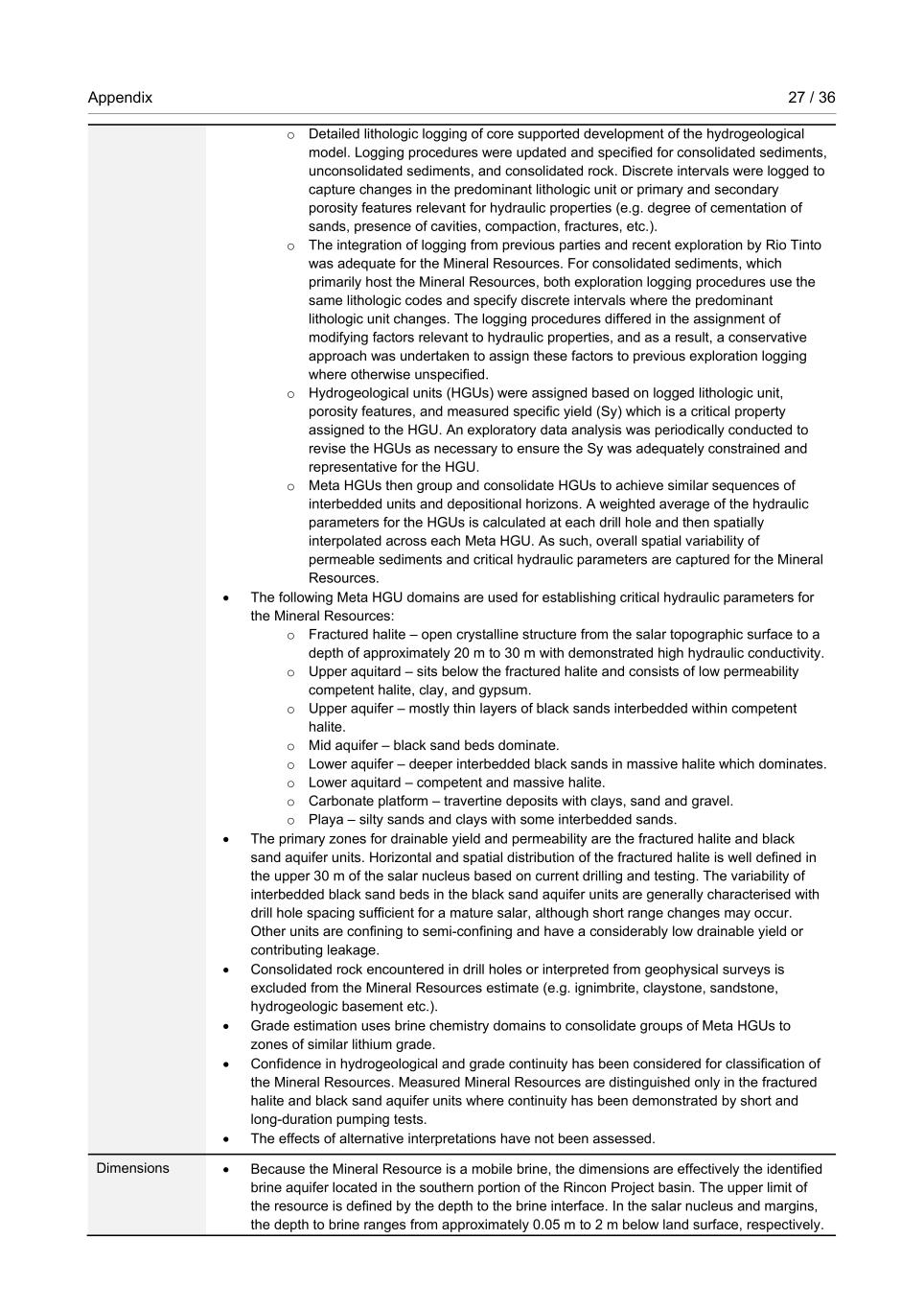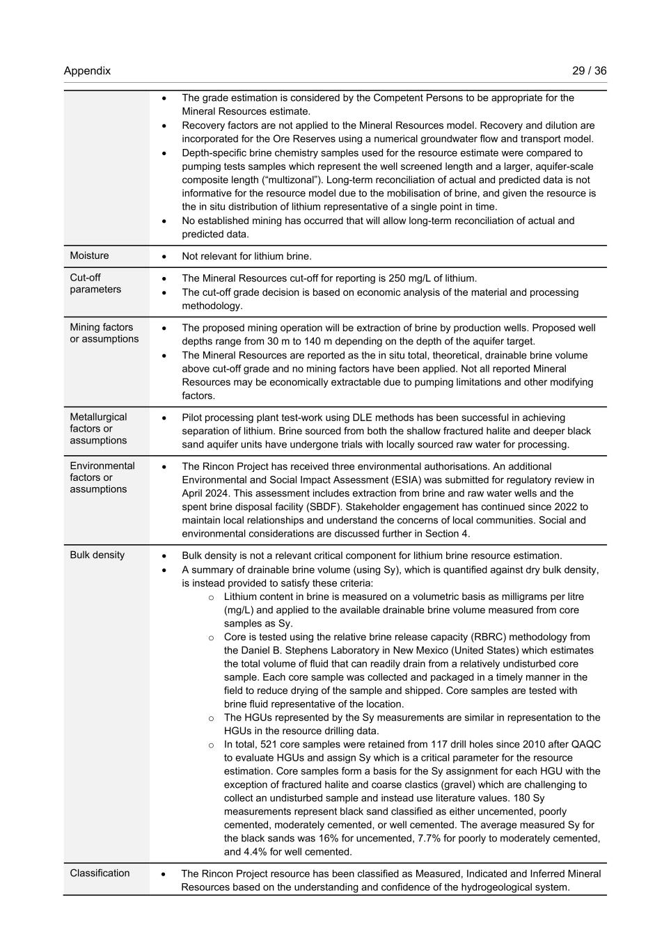 Appendix 29 / 36 RioTintoNonBusiness • The grade estimation is considered by the Competent Persons to be appropriate for the Mineral Resources estimate. • Recovery factors are not applied to the Mineral Resources model. Recovery and dilution are incorporated for the Ore Reserves using a numerical groundwater flow and transport model. • Depth-specific brine chemistry samples used for the resource estimate were compared to pumping tests samples which represent the well screened length and a larger, aquifer-scale composite length (“multizonal”). Long-term reconciliation of actual and predicted data is not informative for the resource model due to the mobilisation of brine, and given the resource is the in situ distribution of lithium representative of a single point in time. • No established mining has occurred that will allow long-term reconciliation of actual and predicted data. Moisture • Not relevant for lithium brine. Cut-off parameters • The Mineral Resources cut-off for reporting is 250 mg/L of lithium. • The cut-off grade decision is based on economic analysis of the material and processing methodology. Mining factors or assumptions • The proposed mining operation will be extraction of brine by production wells. Proposed well depths range from 30 m to 140 m depending on the depth of the aquifer target. • The Mineral Resources are reported as the in situ total, theoretical, drainable brine volume above cut-off grade and no mining factors have been applied. Not all reported Mineral Resources may be economically extractable due to pumping limitations and other modifying factors. Metallurgical factors or assumptions • Pilot processing plant test-work using DLE methods has been successful in achieving separation of lithium. Brine sourced from both the shallow fractured halite and deeper black sand aquifer units have undergone trials with locally sourced raw water for processing. Environmental factors or assumptions • The Rincon Project has received three environmental authorisations. An additional Environmental and Social Impact Assessment (ESIA) was submitted for regulatory review in April 2024. This assessment includes extraction from brine and raw water wells and the spent brine disposal facility (SBDF). Stakeholder engagement has continued since 2022 to maintain local relationships and understand the concerns of local communities. Social and environmental considerations are discussed further in Section 4. Bulk density • Bulk density is not a relevant critical component for lithium brine resource estimation. • A summary of drainable brine volume (using Sy), which is quantified against dry bulk density, is instead provided to satisfy these criteria: o Lithium content in brine is measured on a volumetric basis as milligrams per litre (mg/L) and applied to the available drainable brine volume measured from core samples as Sy. o Core is tested using the relative brine release capacity (RBRC) methodology from the Daniel B. Stephens Laboratory in New Mexico (United States) which estimates the total volume of fluid that can readily drain from a relatively undisturbed core sample. Each core sample was collected and packaged in a timely manner in the field to reduce drying of the sample and shipped. Core samples are tested with brine fluid representative of the location. o The HGUs represented by the Sy measurements are similar in representation to the HGUs in the resource drilling data. o In total, 521 core samples were retained from 117 drill holes since 2010 after QAQC to evaluate HGUs and assign Sy which is a critical parameter for the resource estimation. Core samples form a basis for the Sy assignment for each HGU with the exception of fractured halite and coarse clastics (gravel) which are challenging to collect an undisturbed sample and instead use literature values. 180 Sy measurements represent black sand classified as either uncemented, poorly cemented, moderately cemented, or well cemented. The average measured Sy for the black sands was 16% for uncemented, 7.7% for poorly to moderately cemented, and 4.4% for well cemented. Classification • The Rincon Project resource has been classified as Measured, Indicated and Inferred Mineral Resources based on the understanding and confidence of the hydrogeological system.