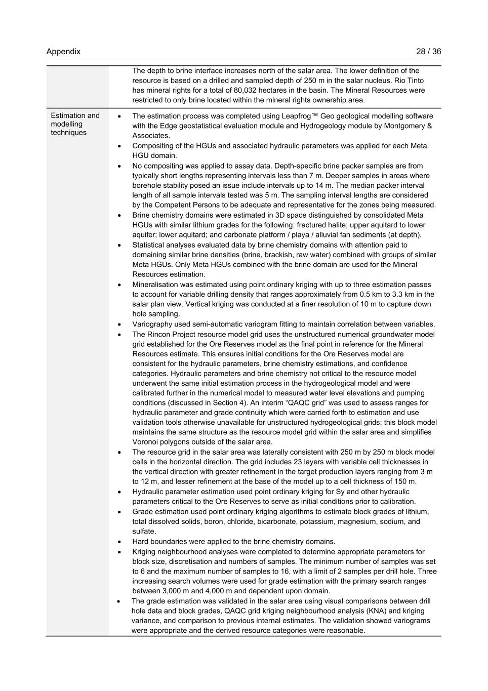 Appendix 28 / 36 RioTintoNonBusiness The depth to brine interface increases north of the salar area. The lower definition of the resource is based on a drilled and sampled depth of 250 m in the salar nucleus. Rio Tinto has mineral rights for a total of 80,032 hectares in the basin. The Mineral Resources were restricted to only brine located within the mineral rights ownership area. Estimation and modelling techniques • The estimation process was completed using Leapfrog™ Geo geological modelling software with the Edge geostatistical evaluation module and Hydrogeology module by Montgomery & Associates. • Compositing of the HGUs and associated hydraulic parameters was applied for each Meta HGU domain. • No compositing was applied to assay data. Depth-specific brine packer samples are from typically short lengths representing intervals less than 7 m. Deeper samples in areas where borehole stability posed an issue include intervals up to 14 m. The median packer interval length of all sample intervals tested was 5 m. The sampling interval lengths are considered by the Competent Persons to be adequate and representative for the zones being measured. • Brine chemistry domains were estimated in 3D space distinguished by consolidated Meta HGUs with similar lithium grades for the following: fractured halite; upper aquitard to lower aquifer; lower aquitard; and carbonate platform / playa / alluvial fan sediments (at depth). • Statistical analyses evaluated data by brine chemistry domains with attention paid to domaining similar brine densities (brine, brackish, raw water) combined with groups of similar Meta HGUs. Only Meta HGUs combined with the brine domain are used for the Mineral Resources estimation. • Mineralisation was estimated using point ordinary kriging with up to three estimation passes to account for variable drilling density that ranges approximately from 0.5 km to 3.3 km in the salar plan view. Vertical kriging was conducted at a finer resolution of 10 m to capture down hole sampling. • Variography used semi-automatic variogram fitting to maintain correlation between variables. • The Rincon Project resource model grid uses the unstructured numerical groundwater model grid established for the Ore Reserves model as the final point in reference for the Mineral Resources estimate. This ensures initial conditions for the Ore Reserves model are consistent for the hydraulic parameters, brine chemistry estimations, and confidence categories. Hydraulic parameters and brine chemistry not critical to the resource model underwent the same initial estimation process in the hydrogeological model and were calibrated further in the numerical model to measured water level elevations and pumping conditions (discussed in Section 4). An interim “QAQC grid” was used to assess ranges for hydraulic parameter and grade continuity which were carried forth to estimation and use validation tools otherwise unavailable for unstructured hydrogeological grids; this block model maintains the same structure as the resource model grid within the salar area and simplifies Voronoi polygons outside of the salar area. • The resource grid in the salar area was laterally consistent with 250 m by 250 m block model cells in the horizontal direction. The grid includes 23 layers with variable cell thicknesses in the vertical direction with greater refinement in the target production layers ranging from 3 m to 12 m, and lesser refinement at the base of the model up to a cell thickness of 150 m. • Hydraulic parameter estimation used point ordinary kriging for Sy and other hydraulic parameters critical to the Ore Reserves to serve as initial conditions prior to calibration. • Grade estimation used point ordinary kriging algorithms to estimate block grades of lithium, total dissolved solids, boron, chloride, bicarbonate, potassium, magnesium, sodium, and sulfate. • Hard boundaries were applied to the brine chemistry domains. • Kriging neighbourhood analyses were completed to determine appropriate parameters for block size, discretisation and numbers of samples. The minimum number of samples was set to 6 and the maximum number of samples to 16, with a limit of 2 samples per drill hole. Three increasing search volumes were used for grade estimation with the primary search ranges between 3,000 m and 4,000 m and dependent upon domain. • The grade estimation was validated in the salar area using visual comparisons between drill hole data and block grades, QAQC grid kriging neighbourhood analysis (KNA) and kriging variance, and comparison to previous internal estimates. The validation showed variograms were appropriate and the derived resource categories were reasonable.