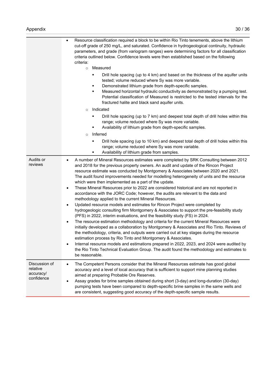 Appendix 30 / 36 RioTintoNonBusiness • Resource classification required a block to be within Rio Tinto tenements, above the lithium cut-off grade of 250 mg/L, and saturated. Confidence in hydrogeological continuity, hydraulic parameters, and grade (from variogram ranges) were determining factors for all classification criteria outlined below. Confidence levels were then established based on the following criteria: o Measured  Drill hole spacing (up to 4 km) and based on the thickness of the aquifer units tested; volume reduced where Sy was more variable.  Demonstrated lithium grade from depth-specific samples.  Measured horizontal hydraulic conductivity as demonstrated by a pumping test. Potential classification of Measured is restricted to the tested intervals for the fractured halite and black sand aquifer units. o Indicated  Drill hole spacing (up to 7 km) and deepest total depth of drill holes within this range; volume reduced where Sy was more variable.  Availability of lithium grade from depth-specific samples. o Inferred  Drill hole spacing (up to 10 km) and deepest total depth of drill holes within this range; volume reduced where Sy was more variable.  Availability of lithium grade from samples. Audits or reviews • A number of Mineral Resources estimates were completed by SRK Consulting between 2012 and 2018 for the previous property owners. An audit and update of the Rincon Project resource estimate was conducted by Montgomery & Associates between 2020 and 2021. The audit found improvements needed for modelling heterogeneity of units and the resource which were then implemented as a part of the update. • These Mineral Resources prior to 2022 are considered historical and are not reported in accordance with the JORC Code; however, the audits are relevant to the data and methodology applied to the current Mineral Resources. • Updated resource models and estimates for Rincon Project were completed by hydrogeologic consulting firm Montgomery & Associates to support the pre-feasibility study (PFS) in 2022, interim evaluations, and the feasibility study (FS) in 2024. • The resource estimation methodology and criteria for the current Mineral Resources were initially developed as a collaboration by Montgomery & Associates and Rio Tinto. Reviews of the methodology, criteria, and outputs were carried out at key stages during the resource estimation process by Rio Tinto and Montgomery & Associates. • Internal resource models and estimations prepared in 2022, 2023, and 2024 were audited by the Rio Tinto Technical Evaluation Group. The audit found the methodology and estimates to be reasonable. Discussion of relative accuracy/ confidence • The Competent Persons consider that the Mineral Resources estimate has good global accuracy and a level of local accuracy that is sufficient to support mine planning studies aimed at preparing Probable Ore Reserves. • Assay grades for brine samples obtained during short (3-day) and long-duration (30-day) pumping tests have been compared to depth-specific brine samples in the same wells and are consistent, suggesting good accuracy of the depth-specific sample results.