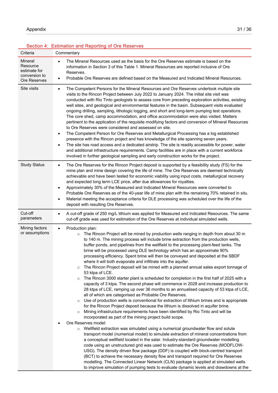 Appendix 31 / 36 RioTintoNonBusiness Section 4: Estimation and Reporting of Ore Reserves Criteria Commentary Mineral Resource estimate for conversion to Ore Reserves • The Mineral Resources used as the basis for the Ore Reserves estimate is based on the information in Section 3 of this Table 1. Mineral Resources are reported inclusive of Ore Reserves. • Probable Ore Reserves are defined based on the Measured and Indicated Mineral Resources. Site visits • The Competent Persons for the Mineral Resources and Ore Reserves undertook multiple site visits to the Rincon Project between July 2022 to January 2024. The initial site visit was conducted with Rio Tinto geologists to assess core from preceding exploration activities, existing well sites, and geological and environmental features in the basin. Subsequent visits evaluated ongoing drilling, sampling, lithologic logging, and short and long-term pumping test operations. The core shed, camp accommodation, and office accommodation were also visited. Matters pertinent to the application of the requisite modifying factors and conversion of Mineral Resources to Ore Reserves were considered and assessed on site. • The Competent Person for Ore Reserves and Metallurgical Processing has a log established presence with the Rincon project and has knowledge of the site spanning seven years. • The site has road access and a dedicated airstrip. The site is readily accessible for power, water and additional infrastructure requirements. Camp facilities are in place with a current workforce involved in further geological sampling and early construction works for the project. Study Status • The Ore Reserves for the Rincon Project deposit is supported by a feasibility study (FS) for the mine plan and mine design covering the life of mine. The Ore Reserves are deemed technically achievable and have been tested for economic viability using input costs, metallurgical recovery and expected long term LCE price, after due allowances for royalties. • Approximately 30% of the Measured and Indicated Mineral Resources were converted to Probable Ore Reserves as of the 40-year life of mine plan with the remaining 70% retained in situ. • Material meeting the acceptance criteria for DLE processing was scheduled over the life of the deposit with resulting Ore Reserves. Cut-off parameters • A cut-off grade of 250 mg/L lithium was applied for Measured and Indicated Resources. The same cut-off grade was used for estimation of the Ore Reserves at individual simulated wells. Mining factors or assumptions • Production plan: o The Rincon Project will be mined by production wells ranging in depth from about 30 m to 140 m. The mining process will include brine extraction from the production wells, buffer ponds, and pipelines from the wellfield to the processing plant-feed tanks. The brine will be processed using DLE technology which has an approximate 90% processing efficiency. Spent brine will then be conveyed and deposited at the SBDF where it will both evaporate and infiltrate into the aquifer. o The Rincon Project deposit will be mined with a planned annual sales export tonnage of 53 ktpa of LCE. o The Rincon 3000 starter plant is scheduled for completion in the first half of 2025 with a capacity of 3 ktpa. The second phase will commence in 2028 and increase production to 28 ktpa of LCE, ramping up over 36 months to an annualised capacity of 53 ktpa of LCE, all of which are categorised as Probable Ore Reserves. o Use of production wells is conventional for extraction of lithium brines and is appropriate for the Rincon Project deposit because the lithium is dissolved in aquifer brine. o Mining infrastructure requirements have been identified by Rio Tinto and will be incorporated as part of the mining project build scope. • Ore Reserves model: o Wellfield extraction was simulated using a numerical groundwater flow and solute transport model (numerical model) to simulate extraction of mineral concentrations from a conceptual wellfield located in the salar. Industry-standard groundwater modelling code using an unstructured grid was used to estimate the Ore Reserves (MODFLOW- USG). The density driven flow package (DDF) is coupled with block-centred transport (BCT) to achieve the necessary density flow and transport required for Ore Reserves modelling. The Connected Linear Network (CLN) package is applied at simulated wells to improve simulation of pumping tests to evaluate dynamic levels and drawdowns at the