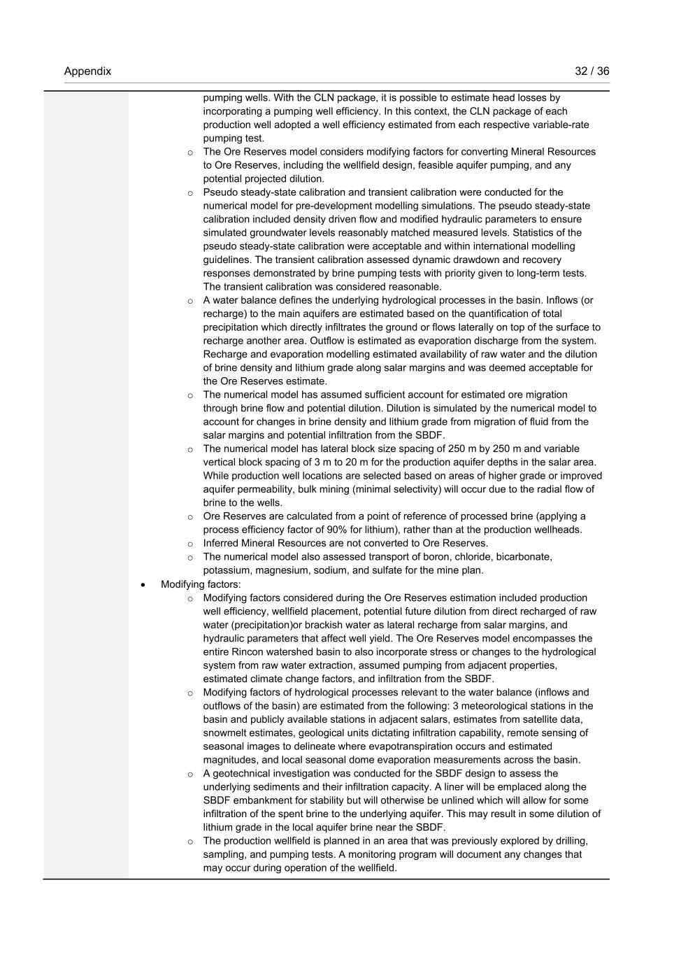 Appendix 32 / 36 RioTintoNonBusiness pumping wells. With the CLN package, it is possible to estimate head losses by incorporating a pumping well efficiency. In this context, the CLN package of each production well adopted a well efficiency estimated from each respective variable-rate pumping test. o The Ore Reserves model considers modifying factors for converting Mineral Resources to Ore Reserves, including the wellfield design, feasible aquifer pumping, and any potential projected dilution. o Pseudo steady-state calibration and transient calibration were conducted for the numerical model for pre-development modelling simulations. The pseudo steady-state calibration included density driven flow and modified hydraulic parameters to ensure simulated groundwater levels reasonably matched measured levels. Statistics of the pseudo steady-state calibration were acceptable and within international modelling guidelines. The transient calibration assessed dynamic drawdown and recovery responses demonstrated by brine pumping tests with priority given to long-term tests. The transient calibration was considered reasonable. o A water balance defines the underlying hydrological processes in the basin. Inflows (or recharge) to the main aquifers are estimated based on the quantification of total precipitation which directly infiltrates the ground or flows laterally on top of the surface to recharge another area. Outflow is estimated as evaporation discharge from the system. Recharge and evaporation modelling estimated availability of raw water and the dilution of brine density and lithium grade along salar margins and was deemed acceptable for the Ore Reserves estimate. o The numerical model has assumed sufficient account for estimated ore migration through brine flow and potential dilution. Dilution is simulated by the numerical model to account for changes in brine density and lithium grade from migration of fluid from the salar margins and potential infiltration from the SBDF. o The numerical model has lateral block size spacing of 250 m by 250 m and variable vertical block spacing of 3 m to 20 m for the production aquifer depths in the salar area. While production well locations are selected based on areas of higher grade or improved aquifer permeability, bulk mining (minimal selectivity) will occur due to the radial flow of brine to the wells. o Ore Reserves are calculated from a point of reference of processed brine (applying a process efficiency factor of 90% for lithium), rather than at the production wellheads. o Inferred Mineral Resources are not converted to Ore Reserves. o The numerical model also assessed transport of boron, chloride, bicarbonate, potassium, magnesium, sodium, and sulfate for the mine plan. • Modifying factors: o Modifying factors considered during the Ore Reserves estimation included production well efficiency, wellfield placement, potential future dilution from direct recharged of raw water (precipitation)or brackish water as lateral recharge from salar margins, and hydraulic parameters that affect well yield. The Ore Reserves model encompasses the entire Rincon watershed basin to also incorporate stress or changes to the hydrological system from raw water extraction, assumed pumping from adjacent properties, estimated climate change factors, and infiltration from the SBDF. o Modifying factors of hydrological processes relevant to the water balance (inflows and outflows of the basin) are estimated from the following: 3 meteorological stations in the basin and publicly available stations in adjacent salars, estimates from satellite data, snowmelt estimates, geological units dictating infiltration capability, remote sensing of seasonal images to delineate where evapotranspiration occurs and estimated magnitudes, and local seasonal dome evaporation measurements across the basin. o A geotechnical investigation was conducted for the SBDF design to assess the underlying sediments and their infiltration capacity. A liner will be emplaced along the SBDF embankment for stability but will otherwise be unlined which will allow for some infiltration of the spent brine to the underlying aquifer. This may result in some dilution of lithium grade in the local aquifer brine near the SBDF. o The production wellfield is planned in an area that was previously explored by drilling, sampling, and pumping tests. A monitoring program will document any changes that may occur during operation of the wellfield.