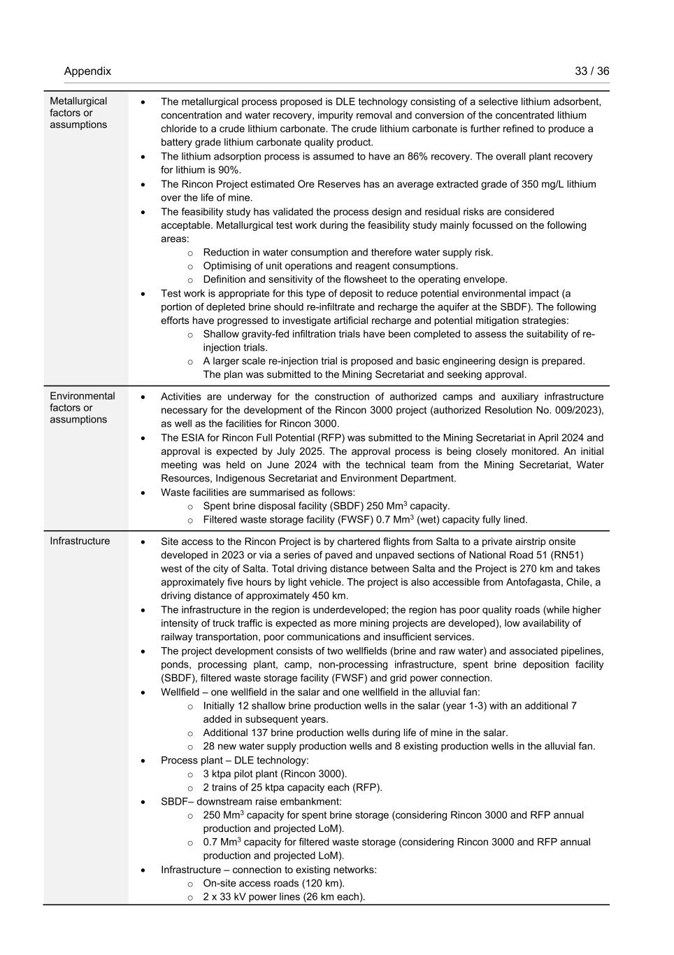 Appendix 33 / 36 RioTintoNonBusiness Metallurgical factors or assumptions • The metallurgical process proposed is DLE technology consisting of a selective lithium adsorbent, concentration and water recovery, impurity removal and conversion of the concentrated lithium chloride to a crude lithium carbonate. The crude lithium carbonate is further refined to produce a battery grade lithium carbonate quality product. • The lithium adsorption process is assumed to have an 86% recovery. The overall plant recovery for lithium is 90%. • The Rincon Project estimated Ore Reserves has an average extracted grade of 350 mg/L lithium over the life of mine. • The feasibility study has validated the process design and residual risks are considered acceptable. Metallurgical test work during the feasibility study mainly focussed on the following areas: o Reduction in water consumption and therefore water supply risk. o Optimising of unit operations and reagent consumptions. o Definition and sensitivity of the flowsheet to the operating envelope. • Test work is appropriate for this type of deposit to reduce potential environmental impact (a portion of depleted brine should re-infiltrate and recharge the aquifer at the SBDF). The following efforts have progressed to investigate artificial recharge and potential mitigation strategies: o Shallow gravity-fed infiltration trials have been completed to assess the suitability of re- injection trials. o A larger scale re-injection trial is proposed and basic engineering design is prepared. The plan was submitted to the Mining Secretariat and seeking approval. Environmental factors or assumptions • Activities are underway for the construction of authorized camps and auxiliary infrastructure necessary for the development of the Rincon 3000 project (authorized Resolution No. 009/2023), as well as the facilities for Rincon 3000. • The ESIA for Rincon Full Potential (RFP) was submitted to the Mining Secretariat in April 2024 and approval is expected by July 2025. The approval process is being closely monitored. An initial meeting was held on June 2024 with the technical team from the Mining Secretariat, Water Resources, Indigenous Secretariat and Environment Department. • Waste facilities are summarised as follows: o Spent brine disposal facility (SBDF) 250 Mm3 capacity. o Filtered waste storage facility (FWSF) 0.7 Mm3 (wet) capacity fully lined. Infrastructure • Site access to the Rincon Project is by chartered flights from Salta to a private airstrip onsite developed in 2023 or via a series of paved and unpaved sections of National Road 51 (RN51) west of the city of Salta. Total driving distance between Salta and the Project is 270 km and takes approximately five hours by light vehicle. The project is also accessible from Antofagasta, Chile, a driving distance of approximately 450 km. • The infrastructure in the region is underdeveloped; the region has poor quality roads (while higher intensity of truck traffic is expected as more mining projects are developed), low availability of railway transportation, poor communications and insufficient services. • The project development consists of two wellfields (brine and raw water) and associated pipelines, ponds, processing plant, camp, non-processing infrastructure, spent brine deposition facility (SBDF), filtered waste storage facility (FWSF) and grid power connection. • Wellfield – one wellfield in the salar and one wellfield in the alluvial fan: o Initially 12 shallow brine production wells in the salar (year 1-3) with an additional 7 added in subsequent years. o Additional 137 brine production wells during life of mine in the salar. o 28 new water supply production wells and 8 existing production wells in the alluvial fan. • Process plant – DLE technology: o 3 ktpa pilot plant (Rincon 3000). o 2 trains of 25 ktpa capacity each (RFP). • SBDF– downstream raise embankment: o 250 Mm3 capacity for spent brine storage (considering Rincon 3000 and RFP annual production and projected LoM). o 0.7 Mm3 capacity for filtered waste storage (considering Rincon 3000 and RFP annual production and projected LoM). • Infrastructure – connection to existing networks: o On-site access roads (120 km). o 2 x 33 kV power lines (26 km each).