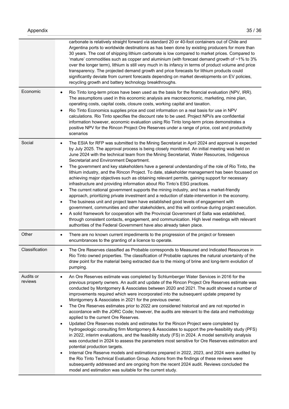 Appendix 35 / 36 RioTintoNonBusiness carbonate is relatively straight forward via standard 20 or 40-foot containers out of Chile and Argentina ports to worldwide destinations as has been done by existing producers for more than 30 years. The cost of shipping lithium carbonate is low compared to market prices. Compared to ‘mature’ commodities such as copper and aluminium (with forecast demand growth of ~1% to 3% over the longer term), lithium is still very much in its infancy in terms of product volume and price transparency. The projected demand growth and price forecasts for lithium products could significantly deviate from current forecasts depending on market developments on EV policies, recycling growth and battery technology breakthroughs. Economic • Rio Tinto long-term prices have been used as the basis for the financial evaluation (NPV, IRR). The assumptions used in this economic analysis are macroeconomic, marketing, mine plan, operating costs, capital costs, closure costs, working capital and taxation. • Rio Tinto Economics supplies price and cost information on a real basis for use in NPV calculations. Rio Tinto specifies the discount rate to be used. Project NPVs are confidential information however, economic evaluation using Rio Tinto long-term prices demonstrates a positive NPV for the Rincon Project Ore Reserves under a range of price, cost and productivity scenarios Social • The ESIA for RFP was submitted to the Mining Secretariat in April 2024 and approval is expected by July 2025. The approval process is being closely monitored. An initial meeting was held on June 2024 with the technical team from the Mining Secretariat, Water Resources, Indigenous Secretariat and Environment Department. • The government and key stakeholders have a general understanding of the role of Rio Tinto, the lithium industry, and the Rincon Project. To date, stakeholder management has been focussed on achieving major objectives such as obtaining relevant permits, gaining support for necessary infrastructure and providing information about Rio Tinto’s ESG practices. • The current national government supports the mining industry, and has a market-friendly approach, prioritizing private investment and a reduction of state-intervention in the economy. • The business unit and project team have established good levels of engagement with government, communities and other stakeholders, and this will continue during project execution. • A solid framework for cooperation with the Provincial Government of Salta was established, through consistent contacts, engagement, and communication. High level meetings with relevant authorities of the Federal Government have also already taken place. Other • There are no known current impediments to the progression of the project or foreseen encumbrances to the granting of a licence to operate. Classification • The Ore Reserves classified as Probable corresponds to Measured and Indicated Resources in Rio Tinto owned properties. The classification of Probable captures the natural uncertainty of the draw point for the material being extracted due to the mixing of brine and long-term evolution of pumping. Audits or reviews • An Ore Reserves estimate was completed by Schlumberger Water Services in 2016 for the previous property owners. An audit and update of the Rincon Project Ore Reserves estimate was conducted by Montgomery & Associates between 2020 and 2021. The audit showed a number of improvements required which were incorporated into the subsequent update prepared by Montgomery & Associates in 2021 for the previous owner. • The Ore Reserves estimates prior to 2022 are considered historical and are not reported in accordance with the JORC Code; however, the audits are relevant to the data and methodology applied to the current Ore Reserves. • Updated Ore Reserves models and estimates for the Rincon Project were completed by hydrogeologic consulting firm Montgomery & Associates to support the pre-feasibility study (PFS) in 2022, interim evaluations, and the feasibility study (FS) in 2024. A model sensitivity analysis was conducted in 2024 to assess the parameters most sensitive for Ore Reserves estimation and potential production targets. • Internal Ore Reserve models and estimations prepared in 2022, 2023, and 2024 were audited by the Rio Tinto Technical Evaluation Group. Actions from the findings of these reviews were subsequently addressed and are ongoing from the recent 2024 audit. Reviews concluded the model and estimation was suitable for the current study.