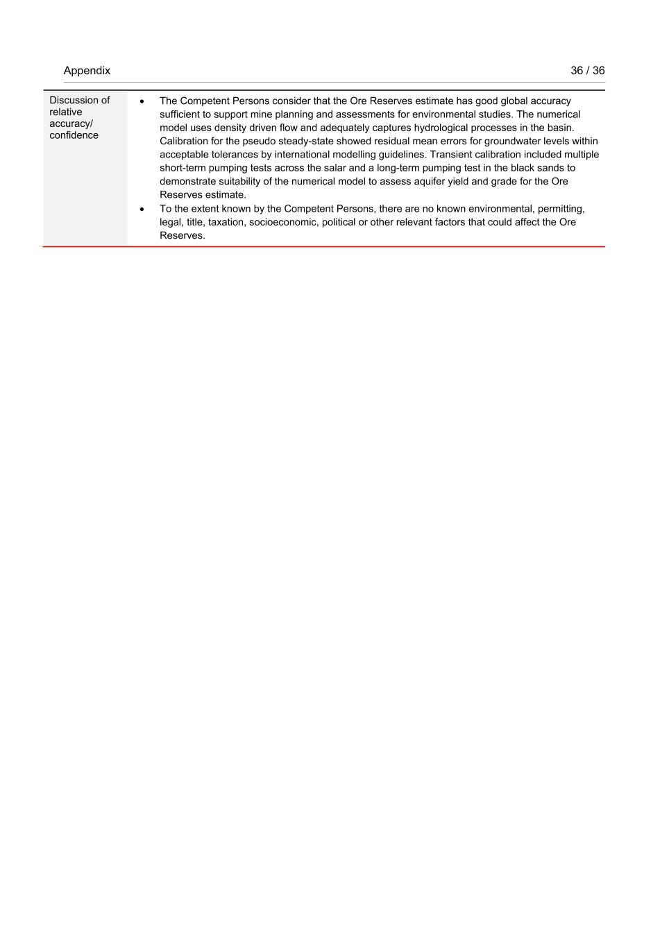 Appendix 36 / 36 RioTintoNonBusiness Discussion of relative accuracy/ confidence • The Competent Persons consider that the Ore Reserves estimate has good global accuracy sufficient to support mine planning and assessments for environmental studies. The numerical model uses density driven flow and adequately captures hydrological processes in the basin. Calibration for the pseudo steady-state showed residual mean errors for groundwater levels within acceptable tolerances by international modelling guidelines. Transient calibration included multiple short-term pumping tests across the salar and a long-term pumping test in the black sands to demonstrate suitability of the numerical model to assess aquifer yield and grade for the Ore Reserves estimate. • To the extent known by the Competent Persons, there are no known environmental, permitting, legal, title, taxation, socioeconomic, political or other relevant factors that could affect the Ore Reserves.