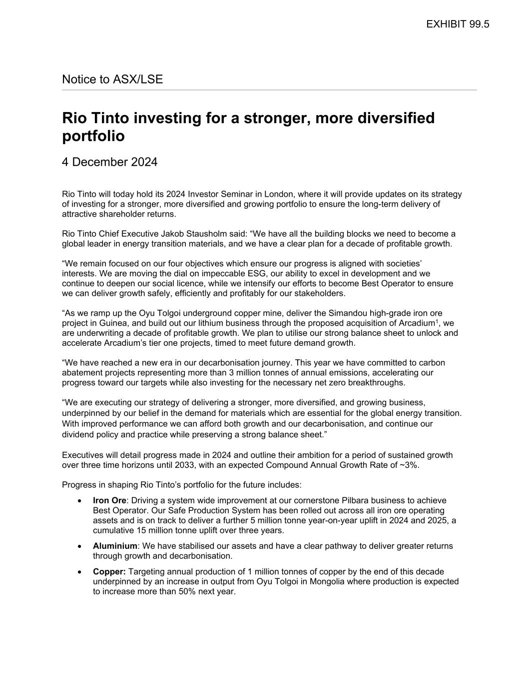 Notice to ASX/LSE Rio Tinto investing for a stronger, more diversified portfolio 4 December 2024 Rio Tinto will today hold its 2024 Investor Seminar in London, where it will provide updates on its strategy of investing for a stronger, more diversified and growing portfolio to ensure the long-term delivery of attractive shareholder returns. Rio Tinto Chief Executive Jakob Stausholm said: “We have all the building blocks we need to become a global leader in energy transition materials, and we have a clear plan for a decade of profitable growth. “We remain focused on our four objectives which ensure our progress is aligned with societies’ interests. We are moving the dial on impeccable ESG, our ability to excel in development and we continue to deepen our social licence, while we intensify our efforts to become Best Operator to ensure we can deliver growth safely, efficiently and profitably for our stakeholders. “As we ramp up the Oyu Tolgoi underground copper mine, deliver the Simandou high-grade iron ore project in Guinea, and build out our lithium business through the proposed acquisition of Arcadium1, we are underwriting a decade of profitable growth. We plan to utilise our strong balance sheet to unlock and accelerate Arcadium’s tier one projects, timed to meet future demand growth. “We have reached a new era in our decarbonisation journey. This year we have committed to carbon abatement projects representing more than 3 million tonnes of annual emissions, accelerating our progress toward our targets while also investing for the necessary net zero breakthroughs. “We are executing our strategy of delivering a stronger, more diversified, and growing business, underpinned by our belief in the demand for materials which are essential for the global energy transition. With improved performance we can afford both growth and our decarbonisation, and continue our dividend policy and practice while preserving a strong balance sheet.” Executives will detail progress made in 2024 and outline their ambition for a period of sustained growth over three time horizons until 2033, with an expected Compound Annual Growth Rate of ~3%. Progress in shaping Rio Tinto’s portfolio for the future includes: • Iron Ore: Driving a system wide improvement at our cornerstone Pilbara business to achieve Best Operator. Our Safe Production System has been rolled out across all iron ore operating assets and is on track to deliver a further 5 million tonne year-on-year uplift in 2024 and 2025, a cumulative 15 million tonne uplift over three years. • Aluminium: We have stabilised our assets and have a clear pathway to deliver greater returns through growth and decarbonisation. • Copper: Targeting annual production of 1 million tonnes of copper by the end of this decade underpinned by an increase in output from Oyu Tolgoi in Mongolia where production is expected to increase more than 50% next year. EXHIBIT 99.5