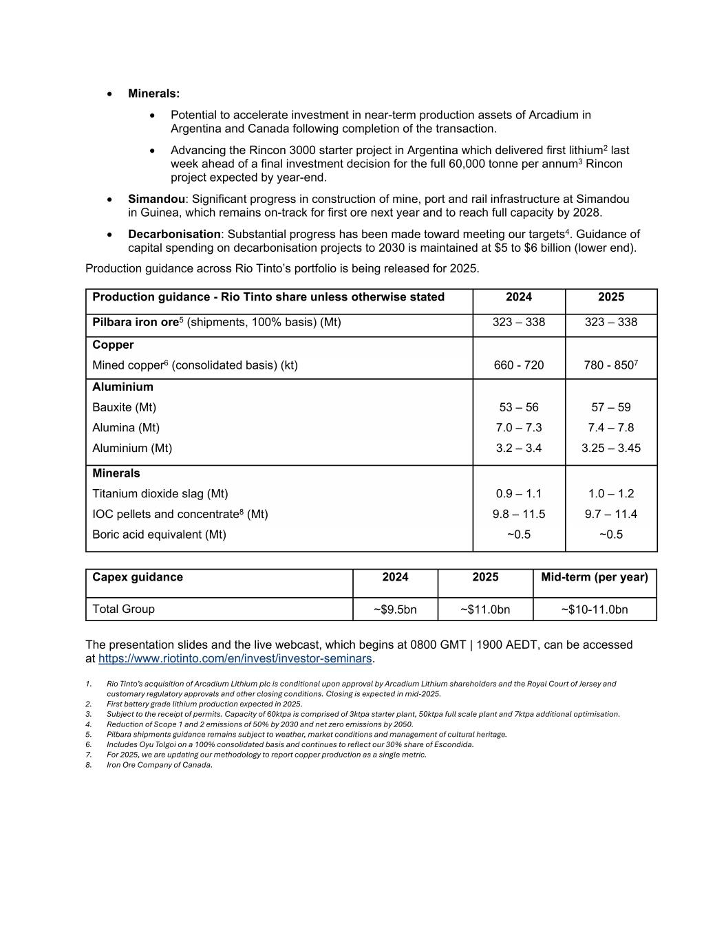 • Minerals: • Potential to accelerate investment in near-term production assets of Arcadium in Argentina and Canada following completion of the transaction. • Advancing the Rincon 3000 starter project in Argentina which delivered first lithium2 last week ahead of a final investment decision for the full 60,000 tonne per annum3 Rincon project expected by year-end. • Simandou: Significant progress in construction of mine, port and rail infrastructure at Simandou in Guinea, which remains on-track for first ore next year and to reach full capacity by 2028. • Decarbonisation: Substantial progress has been made toward meeting our targets4. Guidance of capital spending on decarbonisation projects to 2030 is maintained at $5 to $6 billion (lower end). Production guidance across Rio Tinto’s portfolio is being released for 2025. Production guidance - Rio Tinto share unless otherwise stated 2024 2025 Pilbara iron ore5 (shipments, 100% basis) (Mt) 323 – 338 323 – 338 Copper Mined copper6 (consolidated basis) (kt) 660 - 720 780 - 8507 Aluminium Bauxite (Mt) Alumina (Mt) Aluminium (Mt) 53 – 56 7.0 – 7.3 3.2 – 3.4 57 – 59 7.4 – 7.8 3.25 – 3.45 Minerals Titanium dioxide slag (Mt) IOC pellets and concentrate8 (Mt) Boric acid equivalent (Mt) 0.9 – 1.1 9.8 – 11.5 ~0.5 1.0 – 1.2 9.7 – 11.4 ~0.5 Capex guidance 2024 2025 Mid-term (per year) Total Group ~$9.5bn ~$11.0bn ~$10-11.0bn The presentation slides and the live webcast, which begins at 0800 GMT | 1900 AEDT, can be accessed at https://www.riotinto.com/en/invest/investor-seminars. 1. Rio Tinto’s acquisition of Arcadium Lithium plc is conditional upon approval by Arcadium Lithium shareholders and the Royal Court of Jersey and customary regulatory approvals and other closing conditions. Closing is expected in mid-2025. 2. First battery grade lithium production expected in 2025. 3. Subject to the receipt of permits. Capacity of 60ktpa is comprised of 3ktpa starter plant, 50ktpa full scale plant and 7ktpa additional optimisation. 4. Reduction of Scope 1 and 2 emissions of 50% by 2030 and net zero emissions by 2050. 5. Pilbara shipments guidance remains subject to weather, market conditions and management of cultural heritage. 6. Includes Oyu Tolgoi on a 100% consolidated basis and continues to reflect our 30% share of Escondida. 7. For 2025, we are updating our methodology to report copper production as a single metric. 8. Iron Ore Company of Canada.