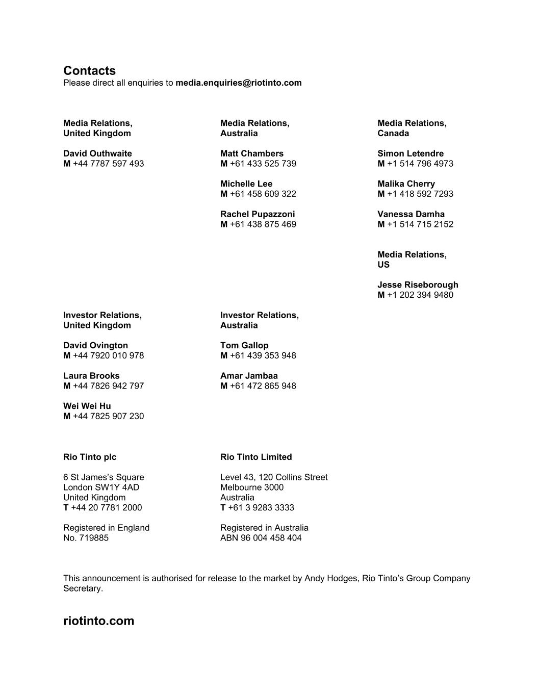 Contacts Please direct all enquiries to media.enquiries@riotinto.com Media Relations, United Kingdom David Outhwaite M +44 7787 597 493 Media Relations, Australia Matt Chambers M +61 433 525 739 Michelle Lee M +61 458 609 322 Rachel Pupazzoni M +61 438 875 469 Media Relations, Canada Simon Letendre M +1 514 796 4973 Malika Cherry M +1 418 592 7293 Vanessa Damha M +1 514 715 2152 Media Relations, US Jesse Riseborough M +1 202 394 9480 Investor Relations, United Kingdom David Ovington M +44 7920 010 978 Laura Brooks M +44 7826 942 797 Wei Wei Hu M +44 7825 907 230 Investor Relations, Australia Tom Gallop M +61 439 353 948 Amar Jambaa M +61 472 865 948 Rio Tinto plc 6 St James’s Square London SW1Y 4AD United Kingdom T +44 20 7781 2000 Registered in England No. 719885 Rio Tinto Limited Level 43, 120 Collins Street Melbourne 3000 Australia T +61 3 9283 3333 Registered in Australia ABN 96 004 458 404 This announcement is authorised for release to the market by Andy Hodges, Rio Tinto’s Group Company Secretary. riotinto.com