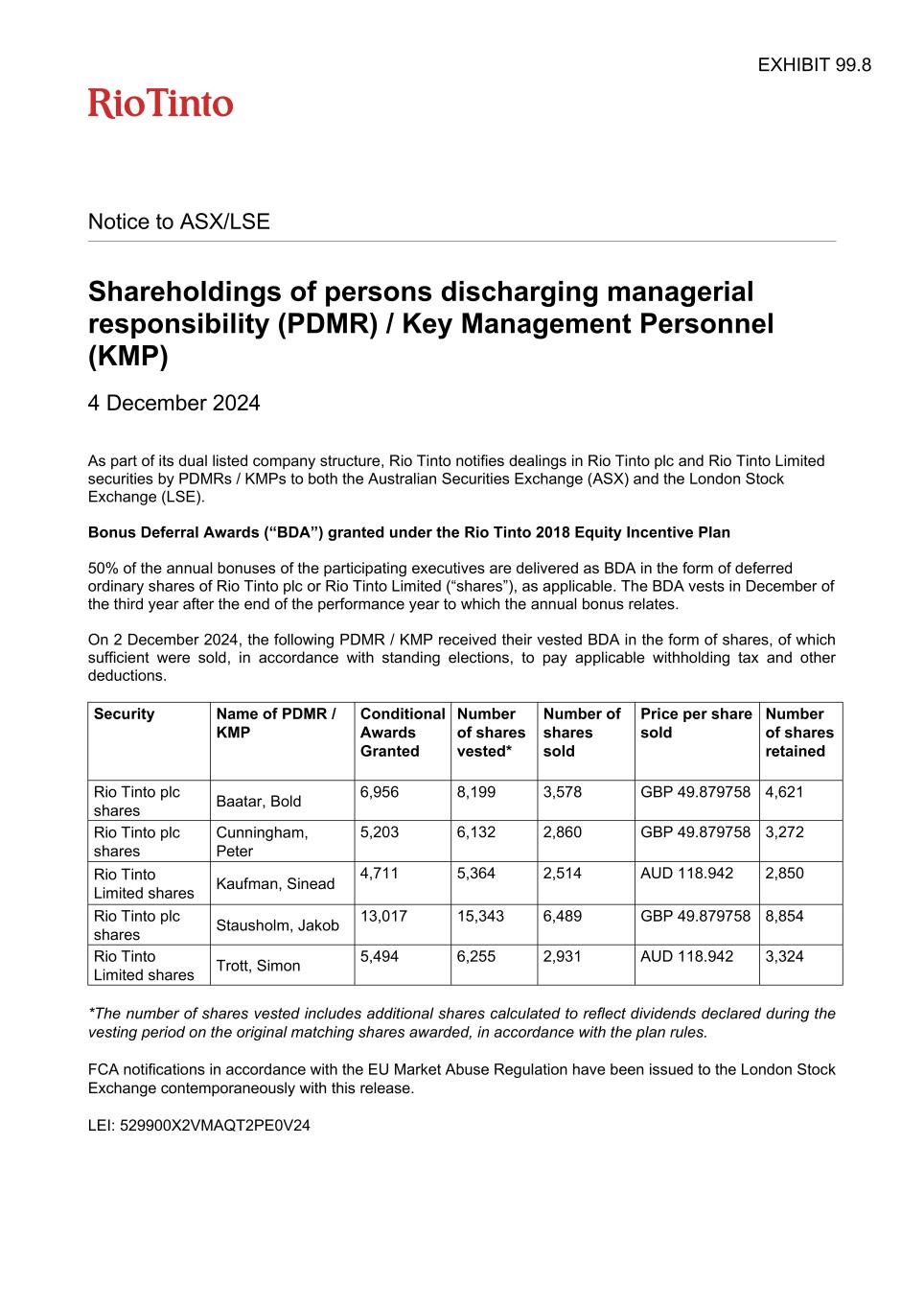 Notice to ASX/LSE Shareholdings of persons discharging managerial responsibility (PDMR) / Key Management Personnel (KMP) 4 December 2024 As part of its dual listed company structure, Rio Tinto notifies dealings in Rio Tinto plc and Rio Tinto Limited securities by PDMRs / KMPs to both the Australian Securities Exchange (ASX) and the London Stock Exchange (LSE). Bonus Deferral Awards (“BDA”) granted under the Rio Tinto 2018 Equity Incentive Plan 50% of the annual bonuses of the participating executives are delivered as BDA in the form of deferred ordinary shares of Rio Tinto plc or Rio Tinto Limited (“shares”), as applicable. The BDA vests in December of the third year after the end of the performance year to which the annual bonus relates. On 2 December 2024, the following PDMR / KMP received their vested BDA in the form of shares, of which sufficient were sold, in accordance with standing elections, to pay applicable withholding tax and other deductions. Security Name of PDMR / KMP Conditional Awards Granted Number of shares vested* Number of shares sold Price per share sold Number of shares retained Rio Tinto plc shares Baatar, Bold 6,956 8,199 3,578 GBP 49.879758 4,621 Rio Tinto plc shares Cunningham, Peter 5,203 6,132 2,860 GBP 49.879758 3,272 Rio Tinto Limited shares Kaufman, Sinead 4,711 5,364 2,514 AUD 118.942 2,850 Rio Tinto plc shares Stausholm, Jakob 13,017 15,343 6,489 GBP 49.879758 8,854 Rio Tinto Limited shares Trott, Simon 5,494 6,255 2,931 AUD 118.942 3,324 *The number of shares vested includes additional shares calculated to reflect dividends declared during the vesting period on the original matching shares awarded, in accordance with the plan rules. FCA notifications in accordance with the EU Market Abuse Regulation have been issued to the London Stock Exchange contemporaneously with this release. LEI: 529900X2VMAQT2PE0V24 EXHIBIT 99.8