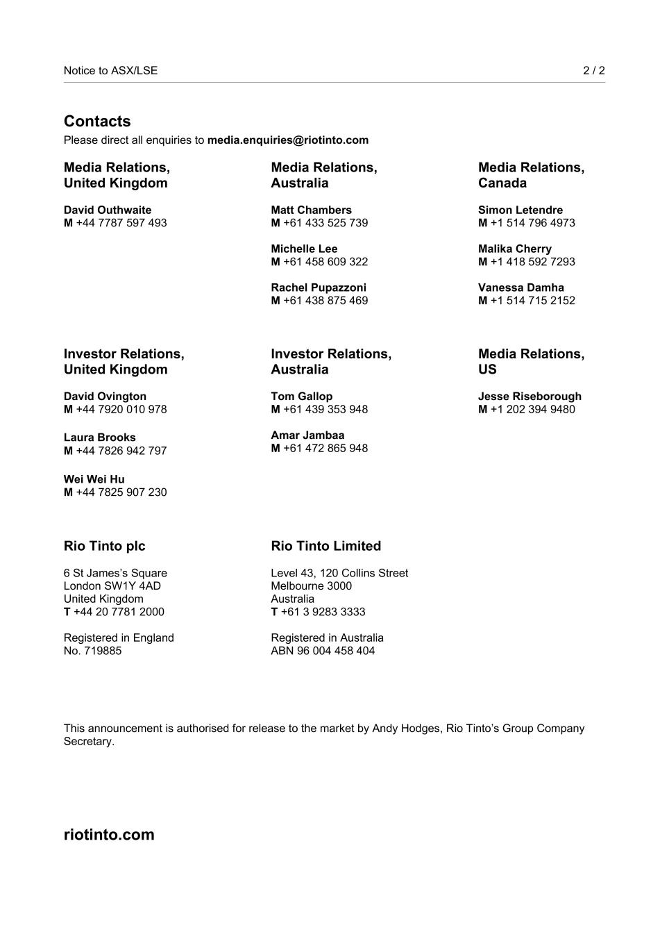 Notice to ASX/LSE 2 / 2 Contacts Please direct all enquiries to media.enquiries@riotinto.com Media Relations, United Kingdom David Outhwaite M +44 7787 597 493 Media Relations, Australia Matt Chambers M +61 433 525 739 Michelle Lee M +61 458 609 322 Rachel Pupazzoni M +61 438 875 469 Media Relations, Canada Simon Letendre M +1 514 796 4973 Malika Cherry M +1 418 592 7293 Vanessa Damha M +1 514 715 2152 Investor Relations, United Kingdom David Ovington M +44 7920 010 978 Laura Brooks M +44 7826 942 797 Wei Wei Hu M +44 7825 907 230 Investor Relations, Australia Tom Gallop M +61 439 353 948 Amar Jambaa M +61 472 865 948 Media Relations, US Jesse Riseborough M +1 202 394 9480 Rio Tinto plc 6 St James’s Square London SW1Y 4AD United Kingdom T +44 20 7781 2000 Registered in England No. 719885 Rio Tinto Limited Level 43, 120 Collins Street Melbourne 3000 Australia T +61 3 9283 3333 Registered in Australia ABN 96 004 458 404 This announcement is authorised for release to the market by Andy Hodges, Rio Tinto’s Group Company Secretary. riotinto.com