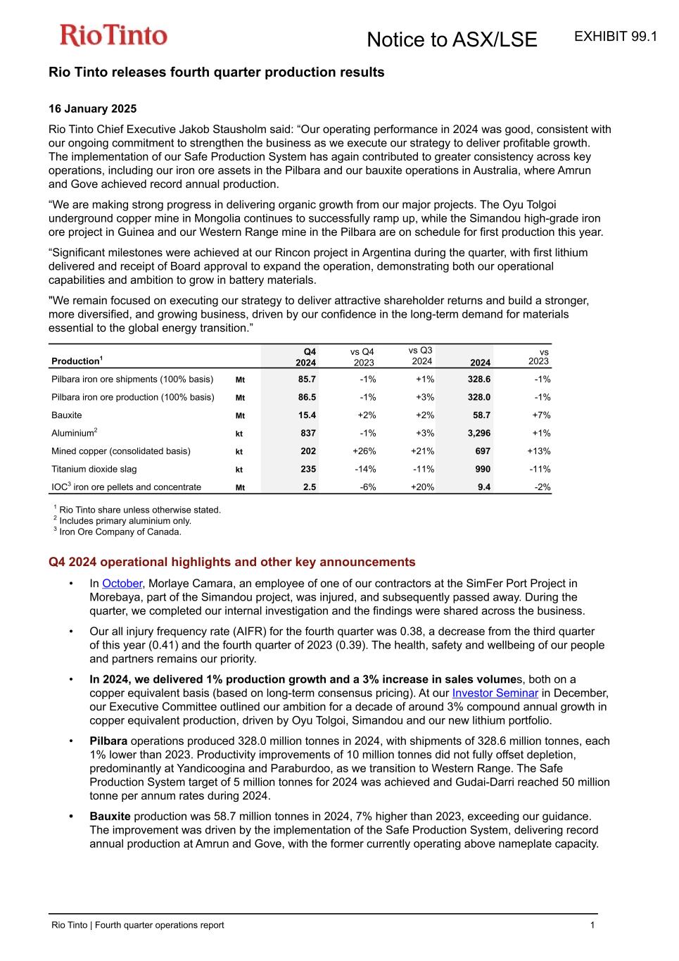 Rio Tinto releases fourth quarter production results 16 January 2025 Rio Tinto Chief Executive Jakob Stausholm said: “Our operating performance in 2024 was good, consistent with our ongoing commitment to strengthen the business as we execute our strategy to deliver profitable growth. The implementation of our Safe Production System has again contributed to greater consistency across key operations, including our iron ore assets in the Pilbara and our bauxite operations in Australia, where Amrun and Gove achieved record annual production. “We are making strong progress in delivering organic growth from our major projects. The Oyu Tolgoi underground copper mine in Mongolia continues to successfully ramp up, while the Simandou high-grade iron ore project in Guinea and our Western Range mine in the Pilbara are on schedule for first production this year. “Significant milestones were achieved at our Rincon project in Argentina during the quarter, with first lithium delivered and receipt of Board approval to expand the operation, demonstrating both our operational capabilities and ambition to grow in battery materials. "We remain focused on executing our strategy to deliver attractive shareholder returns and build a stronger, more diversified, and growing business, driven by our confidence in the long-term demand for materials essential to the global energy transition.” Production1 Q4 2024 vs Q4 2023 vs Q3 2024 2024 vs 2023 Pilbara iron ore shipments (100% basis) Mt 85.7 -1 % +1 % 328.6 -1 % Pilbara iron ore production (100% basis) Mt 86.5 -1 % +3 % 328.0 -1 % Bauxite Mt 15.4 +2 % +2 % 58.7 +7 % Aluminium2 kt 837 -1 % +3 % 3,296 +1 % Mined copper (consolidated basis) kt 202 +26 % +21 % 697 +13 % Titanium dioxide slag kt 235 -14 % -11 % 990 -11 % IOC3 iron ore pellets and concentrate Mt 2.5 -6 % +20 % 9.4 -2 % 1 Rio Tinto share unless otherwise stated. 2 Includes primary aluminium only. 3 Iron Ore Company of Canada. Q4 2024 operational highlights and other key announcements • In October, Morlaye Camara, an employee of one of our contractors at the SimFer Port Project in Morebaya, part of the Simandou project, was injured, and subsequently passed away. During the quarter, we completed our internal investigation and the findings were shared across the business. • Our all injury frequency rate (AIFR) for the fourth quarter was 0.38, a decrease from the third quarter of this year (0.41) and the fourth quarter of 2023 (0.39). The health, safety and wellbeing of our people and partners remains our priority. • In 2024, we delivered 1% production growth and a 3% increase in sales volumes, both on a copper equivalent basis (based on long-term consensus pricing). At our Investor Seminar in December, our Executive Committee outlined our ambition for a decade of around 3% compound annual growth in copper equivalent production, driven by Oyu Tolgoi, Simandou and our new lithium portfolio. • Pilbara operations produced 328.0 million tonnes in 2024, with shipments of 328.6 million tonnes, each 1% lower than 2023. Productivity improvements of 10 million tonnes did not fully offset depletion, predominantly at Yandicoogina and Paraburdoo, as we transition to Western Range. The Safe Production System target of 5 million tonnes for 2024 was achieved and Gudai-Darri reached 50 million tonne per annum rates during 2024. • Bauxite production was 58.7 million tonnes in 2024, 7% higher than 2023, exceeding our guidance. The improvement was driven by the implementation of the Safe Production System, delivering record annual production at Amrun and Gove, with the former currently operating above nameplate capacity. Notice to ASX/LSE Rio Tinto | Fourth quarter operations report 1 EXHIBIT 99.1