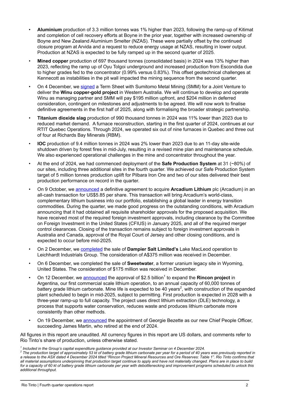 • Aluminium production of 3.3 million tonnes was 1% higher than 2023, following the ramp-up of Kitimat and completion of cell recovery efforts at Boyne in the prior year, together with increased ownership of Boyne and New Zealand Aluminium Smelter (NZAS). These were partially offset by the continued closure program at Arvida and a request to reduce energy usage at NZAS, resulting in lower output. Production at NZAS is expected to be fully ramped up in the second quarter of 2025. • Mined copper production of 697 thousand tonnes (consolidated basis) in 2024 was 13% higher than 2023, reflecting the ramp up of Oyu Tolgoi underground and increased production from Escondida due to higher grades fed to the concentrator (0.99% versus 0.83%). This offset geotechnical challenges at Kennecott as instabilities in the pit wall impacted the mining sequence from the second quarter. • On 4 December, we signed a Term Sheet with Sumitomo Metal Mining (SMM) for a Joint Venture to deliver the Winu copper-gold project in Western Australia. We will continue to develop and operate Winu as managing partner and SMM will pay $195 million upfront, and $204 million in deferred consideration, contingent on milestones and adjustments to be agreed. We will now work to finalise definitive agreements in the first half of 2025, along with formalising the broader strategic partnership. • Titanium dioxide slag production of 990 thousand tonnes in 2024 was 11% lower than 2023 due to reduced market demand. A furnace reconstruction, starting in the first quarter of 2024, continues at our RTIT Quebec Operations. Through 2024, we operated six out of nine furnaces in Quebec and three out of four at Richards Bay Minerals (RBM). • IOC production of 9.4 million tonnes in 2024 was 2% lower than 2023 due to an 11-day site-wide shutdown driven by forest fires in mid-July, resulting in a revised mine plan and maintenance schedule. We also experienced operational challenges in the mine and concentrator throughout the year. • At the end of 2024, we had commenced deployment of the Safe Production System at 31 (~80%) of our sites, including three additional sites in the fourth quarter. We achieved our Safe Production System target of 5 million tonnes production uplift for Pilbara Iron Ore and two of our sites delivered their best production performance on record in the quarter. • On 9 October, we announced a definitive agreement to acquire Arcadium Lithium plc (Arcadium) in an all-cash transaction for US$5.85 per share. This transaction will bring Arcadium’s world-class, complementary lithium business into our portfolio, establishing a global leader in energy transition commodities. During the quarter, we made good progress on the outstanding conditions, with Arcadium announcing that it had obtained all requisite shareholder approvals for the proposed acquisition. We have received most of the required foreign investment approvals, including clearance by the Committee on Foreign Investment in the United States (CFIUS) in January 2025, and all of the required merger control clearances. Closing of the transaction remains subject to foreign investment approvals in Australia and Canada, approval of the Royal Court of Jersey and other closing conditions, and is expected to occur before mid-2025. • On 2 December, we completed the sale of Dampier Salt Limited’s Lake MacLeod operation to Leichhardt Industrials Group. The consideration of A$375 million was received in December. • On 6 December, we completed the sale of Sweetwater, a former uranium legacy site in Wyoming, United States. The consideration of $175 million was received in December. • On 12 December, we announced the approval of $2.5 billion1 to expand the Rincon project in Argentina, our first commercial scale lithium operation, to an annual capacity of 60,000 tonnes of battery grade lithium carbonate. Mine life is expected to be 40 years2, with construction of the expanded plant scheduled to begin in mid-2025, subject to permitting. First production is expected in 2028 with a three-year ramp-up to full capacity. The project uses direct lithium extraction (DLE) technology, a process that supports water conservation, reduces waste and produces lithium carbonate more consistently than other methods. • On 19 December, we announced the appointment of Georgie Bezette as our new Chief People Officer, succeeding James Martin, who retired at the end of 2024. All figures in this report are unaudited. All currency figures in this report are US dollars, and comments refer to Rio Tinto’s share of production, unless otherwise stated. 1 Included in the Group’s capital expenditure guidance provided at our Investor Seminar on 4 December 2024. 2 The production target of approximately 53 kt of battery grade lithium carbonate per year for a period of 40 years was previously reported in a release to the ASX dated 4 December 2024 titled “Rincon Project Mineral Resources and Ore Reserves: Table 1”. Rio Tinto confirms that all material assumptions underpinning that production target continue to apply and have not materially changed. Plans are in place to build for a capacity of 60 kt of battery grade lithium carbonate per year with debottlenecking and improvement programs scheduled to unlock this additional throughput. Rio Tinto | Fourth quarter operations report 2