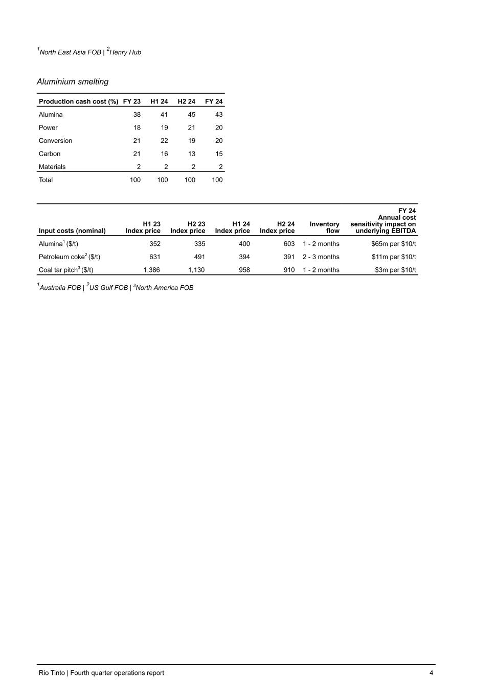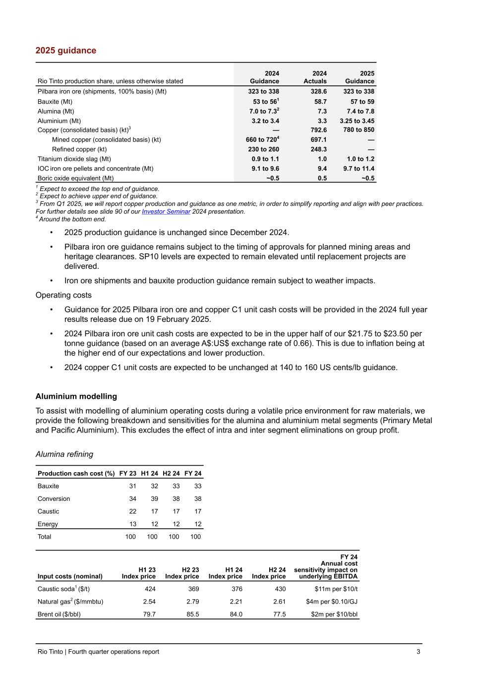2025 guidance Rio Tinto production share, unless otherwise stated 2024 Guidance 2024 Actuals 2025 Guidance Pilbara iron ore (shipments, 100% basis) (Mt) 323 to 338 328.6 323 to 338 Bauxite (Mt) 53 to 561 58.7 57 to 59 Alumina (Mt) 7.0 to 7.32 7.3 7.4 to 7.8 Aluminium (Mt) 3.2 to 3.4 3.3 3.25 to 3.45 Copper (consolidated basis) (kt)3 — 792.6 780 to 850 Mined copper (consolidated basis) (kt) 660 to 7204 697.1 — Refined copper (kt) 230 to 260 248.3 — Titanium dioxide slag (Mt) 0.9 to 1.1 1.0 1.0 to 1.2 IOC iron ore pellets and concentrate (Mt) 9.1 to 9.6 9.4 9.7 to 11.4 Boric oxide equivalent (Mt) ~0.5 0.5 ~0.5 1 Expect to exceed the top end of guidance. 2 Expect to achieve upper end of guidance. 3 From Q1 2025, we will report copper production and guidance as one metric, in order to simplify reporting and align with peer practices. For further details see slide 90 of our Investor Seminar 2024 presentation. 4 Around the bottom end. • 2025 production guidance is unchanged since December 2024. • Pilbara iron ore guidance remains subject to the timing of approvals for planned mining areas and heritage clearances. SP10 levels are expected to remain elevated until replacement projects are delivered. • Iron ore shipments and bauxite production guidance remain subject to weather impacts. Operating costs • Guidance for 2025 Pilbara iron ore and copper C1 unit cash costs will be provided in the 2024 full year results release due on 19 February 2025. • 2024 Pilbara iron ore unit cash costs are expected to be in the upper half of our $21.75 to $23.50 per tonne guidance (based on an average A$:US$ exchange rate of 0.66). This is due to inflation being at the higher end of our expectations and lower production. • 2024 copper C1 unit costs are expected to be unchanged at 140 to 160 US cents/lb guidance. Aluminium modelling To assist with modelling of aluminium operating costs during a volatile price environment for raw materials, we provide the following breakdown and sensitivities for the alumina and aluminium metal segments (Primary Metal and Pacific Aluminium). This excludes the effect of intra and inter segment eliminations on group profit. Alumina refining Production cash cost (%) FY 23 H1 24 H2 24 FY 24 Bauxite 31 32 33 33 Conversion 34 39 38 38 Caustic 22 17 17 17 Energy 13 12 12 12 Total 100 100 100 100 Input costs (nominal) H1 23 Index price H2 23 Index price H1 24 Index price H2 24 Index price FY 24 Annual cost sensitivity impact on underlying EBITDA Caustic soda1 ($/t) 424 369 376 430 $11m per $10/t Natural gas2 ($/mmbtu) 2.54 2.79 2.21 2.61 $4m per $0.10/GJ Brent oil ($/bbl) 79.7 85.5 84.0 77.5 $2m per $10/bbl Rio Tinto | Fourth quarter operations report 3