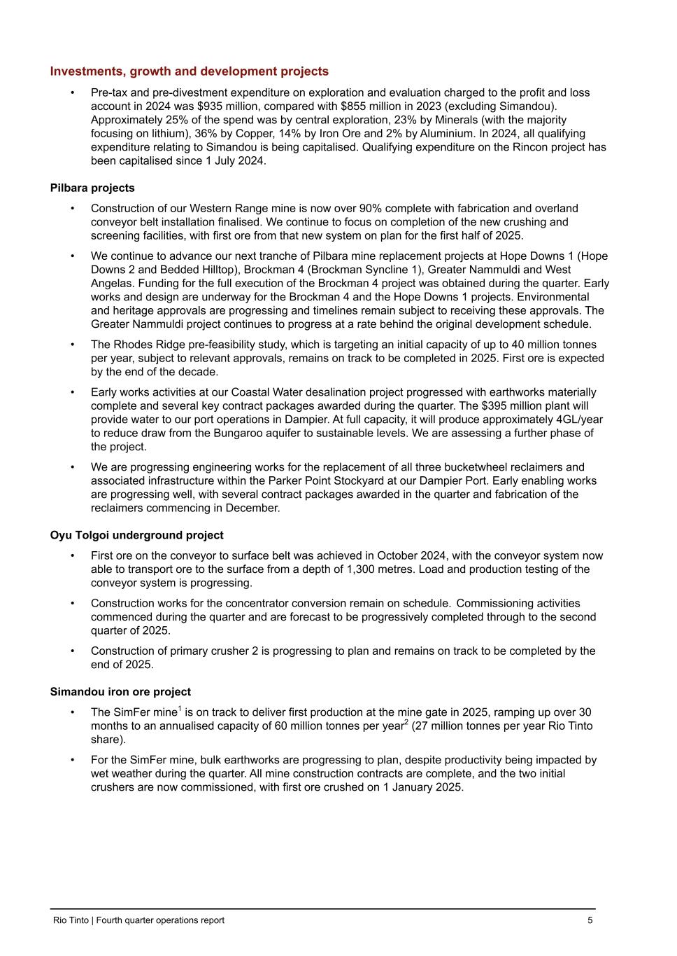 Investments, growth and development projects • Pre-tax and pre-divestment expenditure on exploration and evaluation charged to the profit and loss account in 2024 was $935 million, compared with $855 million in 2023 (excluding Simandou). Approximately 25% of the spend was by central exploration, 23% by Minerals (with the majority focusing on lithium), 36% by Copper, 14% by Iron Ore and 2% by Aluminium. In 2024, all qualifying expenditure relating to Simandou is being capitalised. Qualifying expenditure on the Rincon project has been capitalised since 1 July 2024. Pilbara projects • Construction of our Western Range mine is now over 90% complete with fabrication and overland conveyor belt installation finalised.  We continue to focus on completion of the new crushing and screening facilities, with first ore from that new system on plan for the first half of 2025. • We continue to advance our next tranche of Pilbara mine replacement projects at Hope Downs 1 (Hope Downs 2 and Bedded Hilltop), Brockman 4 (Brockman Syncline 1), Greater Nammuldi and West Angelas. Funding for the full execution of the Brockman 4 project was obtained during the quarter. Early works and design are underway for the Brockman 4 and the Hope Downs 1 projects. Environmental and heritage approvals are progressing and timelines remain subject to receiving these approvals. The Greater Nammuldi project continues to progress at a rate behind the original development schedule. • The Rhodes Ridge pre-feasibility study, which is targeting an initial capacity of up to 40 million tonnes per year, subject to relevant approvals, remains on track to be completed in 2025. First ore is expected by the end of the decade. • Early works activities at our Coastal Water desalination project progressed with earthworks materially complete and several key contract packages awarded during the quarter. The $395 million plant will provide water to our port operations in Dampier. At full capacity, it will produce approximately 4GL/year to reduce draw from the Bungaroo aquifer to sustainable levels. We are assessing a further phase of the project. • We are progressing engineering works for the replacement of all three bucketwheel reclaimers and associated infrastructure within the Parker Point Stockyard at our Dampier Port. Early enabling works are progressing well, with several contract packages awarded in the quarter and fabrication of the reclaimers commencing in December. Oyu Tolgoi underground project • First ore on the conveyor to surface belt was achieved in October 2024, with the conveyor system now able to transport ore to the surface from a depth of 1,300 metres. Load and production testing of the conveyor system is progressing. • Construction works for the concentrator conversion remain on schedule.  Commissioning activities commenced during the quarter and are forecast to be progressively completed through to the second quarter of 2025. • Construction of primary crusher 2 is progressing to plan and remains on track to be completed by the end of 2025. Simandou iron ore project • The SimFer mine1 is on track to deliver first production at the mine gate in 2025, ramping up over 30 months to an annualised capacity of 60 million tonnes per year2 (27 million tonnes per year Rio Tinto share). • For the SimFer mine, bulk earthworks are progressing to plan, despite productivity being impacted by wet weather during the quarter. All mine construction contracts are complete, and the two initial crushers are now commissioned, with first ore crushed on 1 January 2025. Rio Tinto | Fourth quarter operations report 5