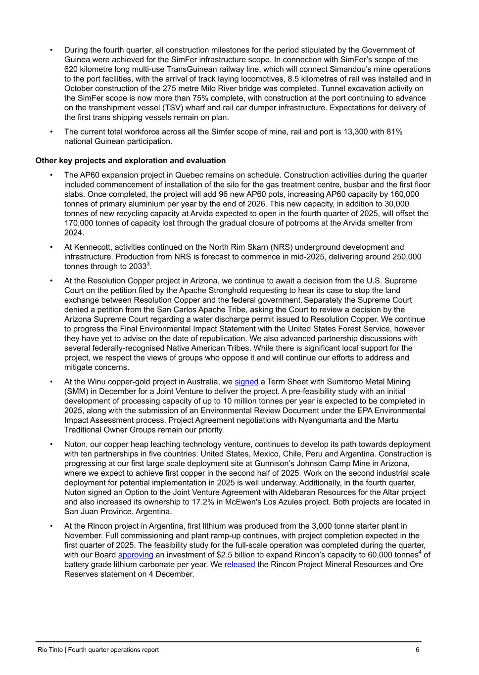 • During the fourth quarter, all construction milestones for the period stipulated by the Government of Guinea were achieved for the SimFer infrastructure scope. In connection with SimFer’s scope of the 620 kilometre long multi-use TransGuinean railway line, which will connect Simandou’s mine operations to the port facilities, with the arrival of track laying locomotives, 8.5 kilometres of rail was installed and in October construction of the 275 metre Milo River bridge was completed. Tunnel excavation activity on the SimFer scope is now more than 75% complete, with construction at the port continuing to advance on the transhipment vessel (TSV) wharf and rail car dumper infrastructure. Expectations for delivery of the first trans shipping vessels remain on plan. • The current total workforce across all the Simfer scope of mine, rail and port is 13,300 with 81% national Guinean participation. Other key projects and exploration and evaluation • The AP60 expansion project in Quebec remains on schedule. Construction activities during the quarter included commencement of installation of the silo for the gas treatment centre, busbar and the first floor slabs. Once completed, the project will add 96 new AP60 pots, increasing AP60 capacity by 160,000 tonnes of primary aluminium per year by the end of 2026. This new capacity, in addition to 30,000 tonnes of new recycling capacity at Arvida expected to open in the fourth quarter of 2025, will offset the 170,000 tonnes of capacity lost through the gradual closure of potrooms at the Arvida smelter from 2024. • At Kennecott, activities continued on the North Rim Skarn (NRS) underground development and infrastructure. Production from NRS is forecast to commence in mid-2025, delivering around 250,000 tonnes through to 20333. • At the Resolution Copper project in Arizona, we continue to await a decision from the U.S. Supreme Court on the petition filed by the Apache Stronghold requesting to hear its case to stop the land exchange between Resolution Copper and the federal government. Separately the Supreme Court denied a petition from the San Carlos Apache Tribe, asking the Court to review a decision by the Arizona Supreme Court regarding a water discharge permit issued to Resolution Copper. We continue to progress the Final Environmental Impact Statement with the United States Forest Service, however they have yet to advise on the date of republication. We also advanced partnership discussions with several federally-recognised Native American Tribes. While there is significant local support for the project, we respect the views of groups who oppose it and will continue our efforts to address and mitigate concerns. • At the Winu copper-gold project in Australia, we signed a Term Sheet with Sumitomo Metal Mining (SMM) in December for a Joint Venture to deliver the project. A pre-feasibility study with an initial development of processing capacity of up to 10 million tonnes per year is expected to be completed in 2025, along with the submission of an Environmental Review Document under the EPA Environmental Impact Assessment process. Project Agreement negotiations with Nyangumarta and the Martu Traditional Owner Groups remain our priority. • Nuton, our copper heap leaching technology venture, continues to develop its path towards deployment with ten partnerships in five countries: United States, Mexico, Chile, Peru and Argentina. Construction is progressing at our first large scale deployment site at Gunnison’s Johnson Camp Mine in Arizona, where we expect to achieve first copper in the second half of 2025. Work on the second industrial scale deployment for potential implementation in 2025 is well underway. Additionally, in the fourth quarter, Nuton signed an Option to the Joint Venture Agreement with Aldebaran Resources for the Altar project and also increased its ownership to 17.2% in McEwen's Los Azules project. Both projects are located in San Juan Province, Argentina. • At the Rincon project in Argentina, first lithium was produced from the 3,000 tonne starter plant in November. Full commissioning and plant ramp-up continues, with project completion expected in the first quarter of 2025. The feasibility study for the full-scale operation was completed during the quarter, with our Board approving an investment of $2.5 billion to expand Rincon’s capacity to 60,000 tonnes4 of battery grade lithium carbonate per year. We released the Rincon Project Mineral Resources and Ore Reserves statement on 4 December.   Rio Tinto | Fourth quarter operations report 6