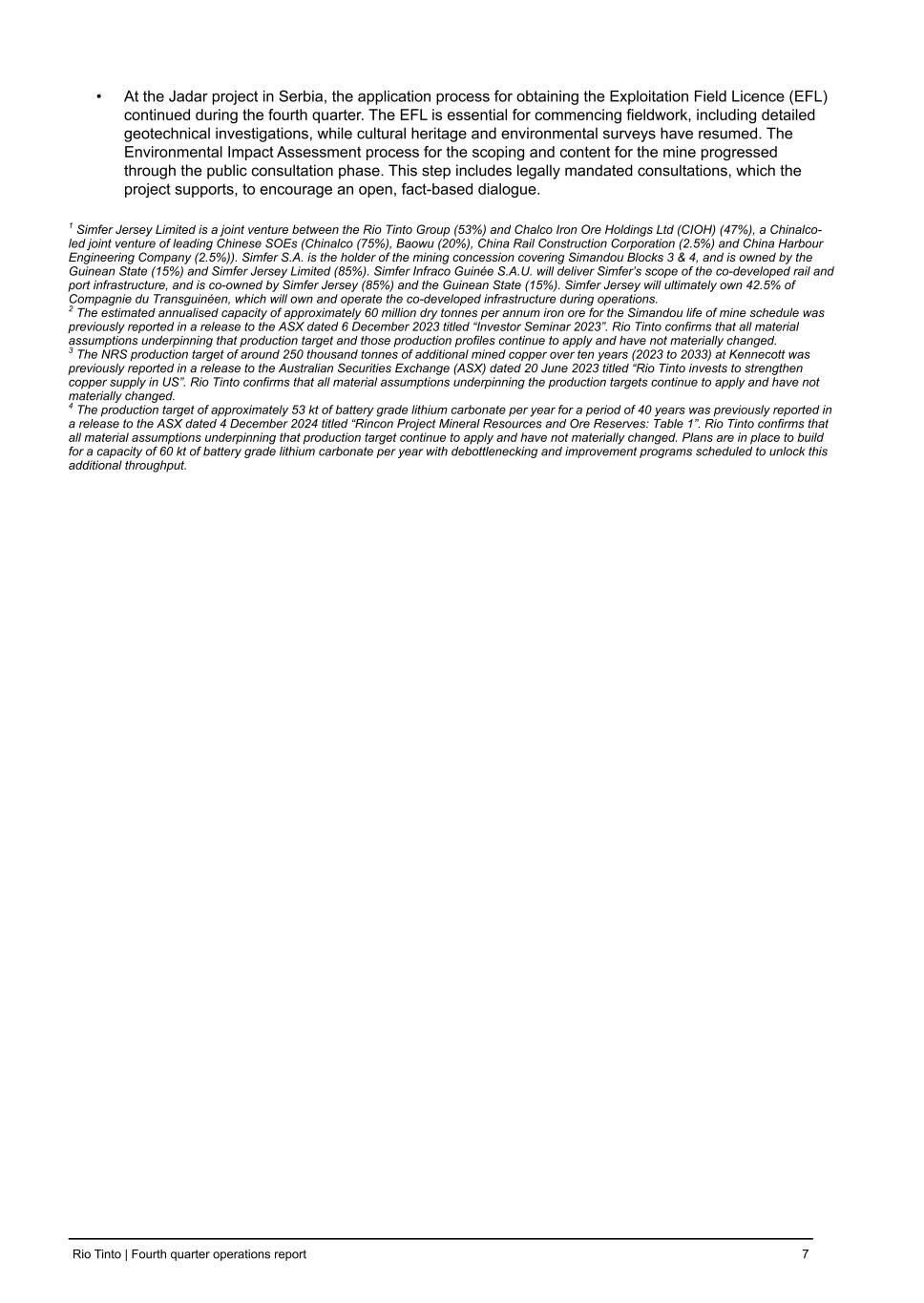 • At the Jadar project in Serbia, the application process for obtaining the Exploitation Field Licence (EFL) continued during the fourth quarter. The EFL is essential for commencing fieldwork, including detailed geotechnical investigations, while cultural heritage and environmental surveys have resumed. The Environmental Impact Assessment process for the scoping and content for the mine progressed through the public consultation phase. This step includes legally mandated consultations, which the project supports, to encourage an open, fact-based dialogue. 1 Simfer Jersey Limited is a joint venture between the Rio Tinto Group (53%) and Chalco Iron Ore Holdings Ltd (CIOH) (47%), a Chinalco- led joint venture of leading Chinese SOEs (Chinalco (75%), Baowu (20%), China Rail Construction Corporation (2.5%) and China Harbour Engineering Company (2.5%)). Simfer S.A. is the holder of the mining concession covering Simandou Blocks 3 & 4, and is owned by the Guinean State (15%) and Simfer Jersey Limited (85%). Simfer Infraco Guinée S.A.U. will deliver Simfer’s scope of the co-developed rail and port infrastructure, and is co-owned by Simfer Jersey (85%) and the Guinean State (15%). Simfer Jersey will ultimately own 42.5% of Compagnie du Transguinéen, which will own and operate the co-developed infrastructure during operations. 2 The estimated annualised capacity of approximately 60 million dry tonnes per annum iron ore for the Simandou life of mine schedule was previously reported in a release to the ASX dated 6 December 2023 titled “Investor Seminar 2023”. Rio Tinto confirms that all material assumptions underpinning that production target and those production profiles continue to apply and have not materially changed. 3 The NRS production target of around 250 thousand tonnes of additional mined copper over ten years (2023 to 2033) at Kennecott was previously reported in a release to the Australian Securities Exchange (ASX) dated 20 June 2023 titled “Rio Tinto invests to strengthen copper supply in US”. Rio Tinto confirms that all material assumptions underpinning the production targets continue to apply and have not materially changed. 4 The production target of approximately 53 kt of battery grade lithium carbonate per year for a period of 40 years was previously reported in a release to the ASX dated 4 December 2024 titled “Rincon Project Mineral Resources and Ore Reserves: Table 1”. Rio Tinto confirms that all material assumptions underpinning that production target continue to apply and have not materially changed. Plans are in place to build for a capacity of 60 kt of battery grade lithium carbonate per year with debottlenecking and improvement programs scheduled to unlock this additional throughput. Rio Tinto | Fourth quarter operations report 7