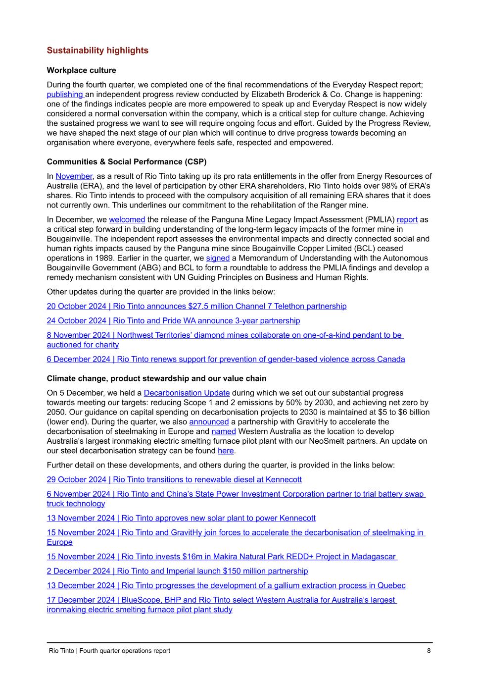 Sustainability highlights Workplace culture During the fourth quarter, we completed one of the final recommendations of the Everyday Respect report; publishing an independent progress review conducted by Elizabeth Broderick & Co. Change is happening: one of the findings indicates people are more empowered to speak up and Everyday Respect is now widely considered a normal conversation within the company, which is a critical step for culture change. Achieving the sustained progress we want to see will require ongoing focus and effort. Guided by the Progress Review, we have shaped the next stage of our plan which will continue to drive progress towards becoming an organisation where everyone, everywhere feels safe, respected and empowered. Communities & Social Performance (CSP) In November, as a result of Rio Tinto taking up its pro rata entitlements in the offer from Energy Resources of Australia (ERA), and the level of participation by other ERA shareholders, Rio Tinto holds over 98% of ERA’s shares. Rio Tinto intends to proceed with the compulsory acquisition of all remaining ERA shares that it does not currently own. This underlines our commitment to the rehabilitation of the Ranger mine. In December, we welcomed the release of the Panguna Mine Legacy Impact Assessment (PMLIA) report as a critical step forward in building understanding of the long-term legacy impacts of the former mine in Bougainville. The independent report assesses the environmental impacts and directly connected social and human rights impacts caused by the Panguna mine since Bougainville Copper Limited (BCL) ceased operations in 1989. Earlier in the quarter, we signed a Memorandum of Understanding with the Autonomous Bougainville Government (ABG) and BCL to form a roundtable to address the PMLIA findings and develop a remedy mechanism consistent with UN Guiding Principles on Business and Human Rights. Other updates during the quarter are provided in the links below: 20 October 2024 | Rio Tinto announces $27.5 million Channel 7 Telethon partnership 24 October 2024 | Rio Tinto and Pride WA announce 3-year partnership 8 November 2024 | Northwest Territories’ diamond mines collaborate on one-of-a-kind pendant to be auctioned for charity 6 December 2024 | Rio Tinto renews support for prevention of gender-based violence across Canada Climate change, product stewardship and our value chain On 5 December, we held a Decarbonisation Update during which we set out our substantial progress towards meeting our targets: reducing Scope 1 and 2 emissions by 50% by 2030, and achieving net zero by 2050. Our guidance on capital spending on decarbonisation projects to 2030 is maintained at $5 to $6 billion (lower end). During the quarter, we also announced a partnership with GravitHy to accelerate the decarbonisation of steelmaking in Europe and named Western Australia as the location to develop Australia’s largest ironmaking electric smelting furnace pilot plant with our NeoSmelt partners. An update on our steel decarbonisation strategy can be found here. Further detail on these developments, and others during the quarter, is provided in the links below: 29 October 2024 | Rio Tinto transitions to renewable diesel at Kennecott 6 November 2024 | Rio Tinto and China’s State Power Investment Corporation partner to trial battery swap truck technology 13 November 2024 | Rio Tinto approves new solar plant to power Kennecott 15 November 2024 | Rio Tinto and GravitHy join forces to accelerate the decarbonisation of steelmaking in Europe 15 November 2024 | Rio Tinto invests $16m in Makira Natural Park REDD+ Project in Madagascar 2 December 2024 | Rio Tinto and Imperial launch $150 million partnership 13 December 2024 | Rio Tinto progresses the development of a gallium extraction process in Quebec 17 December 2024 | BlueScope, BHP and Rio Tinto select Western Australia for Australia’s largest ironmaking electric smelting furnace pilot plant study Rio Tinto | Fourth quarter operations report 8