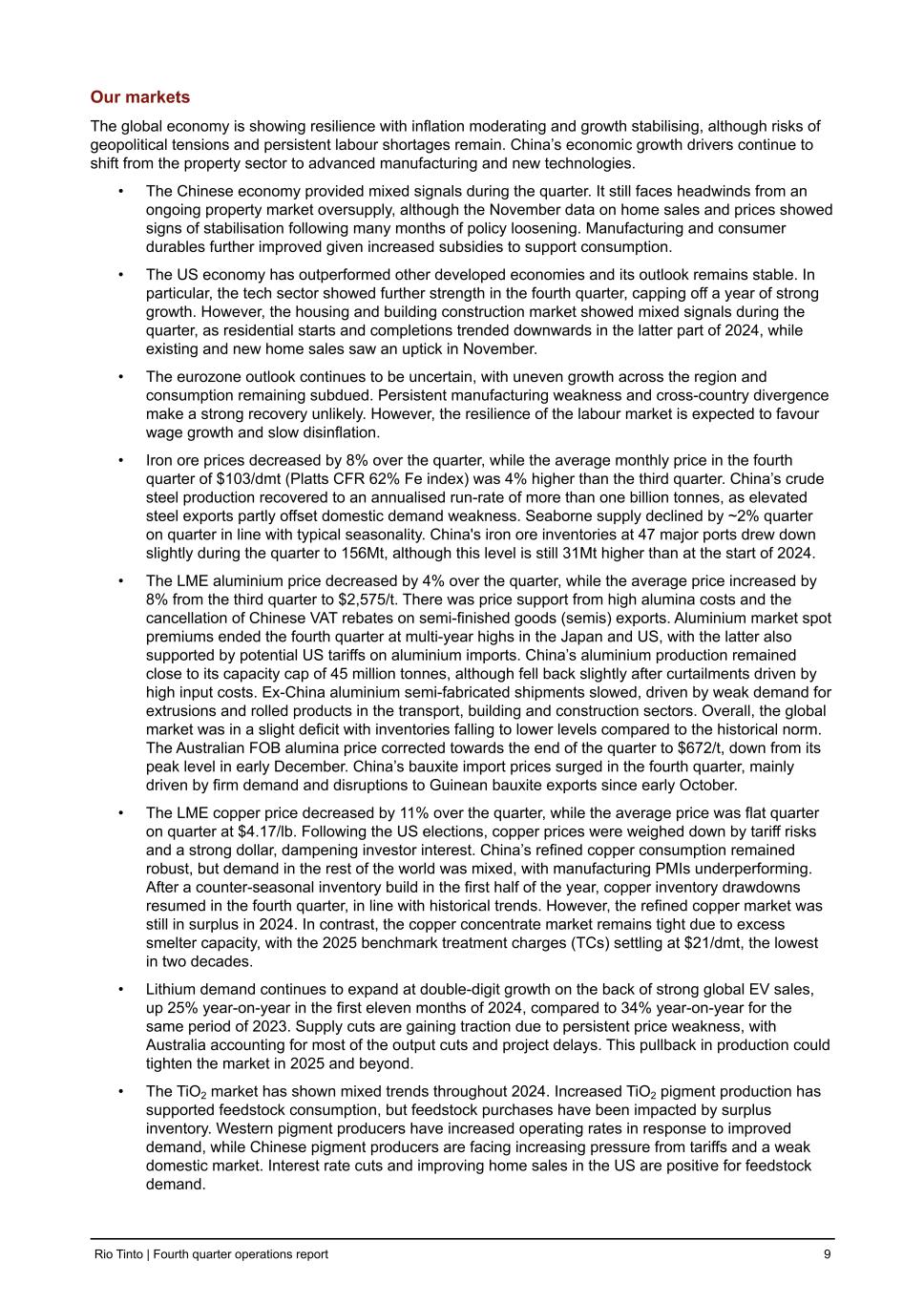 Our markets The global economy is showing resilience with inflation moderating and growth stabilising, although risks of geopolitical tensions and persistent labour shortages remain. China’s economic growth drivers continue to shift from the property sector to advanced manufacturing and new technologies. • The Chinese economy provided mixed signals during the quarter. It still faces headwinds from an ongoing property market oversupply, although the November data on home sales and prices showed signs of stabilisation following many months of policy loosening. Manufacturing and consumer durables further improved given increased subsidies to support consumption. • The US economy has outperformed other developed economies and its outlook remains stable. In particular, the tech sector showed further strength in the fourth quarter, capping off a year of strong growth. However, the housing and building construction market showed mixed signals during the quarter, as residential starts and completions trended downwards in the latter part of 2024, while existing and new home sales saw an uptick in November. • The eurozone outlook continues to be uncertain, with uneven growth across the region and consumption remaining subdued. Persistent manufacturing weakness and cross-country divergence make a strong recovery unlikely. However, the resilience of the labour market is expected to favour wage growth and slow disinflation. • Iron ore prices decreased by 8% over the quarter, while the average monthly price in the fourth quarter of $103/dmt (Platts CFR 62% Fe index) was 4% higher than the third quarter. China’s crude steel production recovered to an annualised run-rate of more than one billion tonnes, as elevated steel exports partly offset domestic demand weakness. Seaborne supply declined by ~2% quarter on quarter in line with typical seasonality. China's iron ore inventories at 47 major ports drew down slightly during the quarter to 156Mt, although this level is still 31Mt higher than at the start of 2024. • The LME aluminium price decreased by 4% over the quarter, while the average price increased by 8% from the third quarter to $2,575/t. There was price support from high alumina costs and the cancellation of Chinese VAT rebates on semi-finished goods (semis) exports. Aluminium market spot premiums ended the fourth quarter at multi-year highs in the Japan and US, with the latter also supported by potential US tariffs on aluminium imports. China’s aluminium production remained close to its capacity cap of 45 million tonnes, although fell back slightly after curtailments driven by high input costs. Ex-China aluminium semi-fabricated shipments slowed, driven by weak demand for extrusions and rolled products in the transport, building and construction sectors. Overall, the global market was in a slight deficit with inventories falling to lower levels compared to the historical norm. The Australian FOB alumina price corrected towards the end of the quarter to $672/t, down from its peak level in early December. China’s bauxite import prices surged in the fourth quarter, mainly driven by firm demand and disruptions to Guinean bauxite exports since early October. • The LME copper price decreased by 11% over the quarter, while the average price was flat quarter on quarter at $4.17/lb. Following the US elections, copper prices were weighed down by tariff risks and a strong dollar, dampening investor interest. China’s refined copper consumption remained robust, but demand in the rest of the world was mixed, with manufacturing PMIs underperforming. After a counter-seasonal inventory build in the first half of the year, copper inventory drawdowns resumed in the fourth quarter, in line with historical trends. However, the refined copper market was still in surplus in 2024. In contrast, the copper concentrate market remains tight due to excess smelter capacity, with the 2025 benchmark treatment charges (TCs) settling at $21/dmt, the lowest in two decades. • Lithium demand continues to expand at double-digit growth on the back of strong global EV sales, up 25% year-on-year in the first eleven months of 2024, compared to 34% year-on-year for the same period of 2023. Supply cuts are gaining traction due to persistent price weakness, with Australia accounting for most of the output cuts and project delays. This pullback in production could tighten the market in 2025 and beyond. • The TiO2 market has shown mixed trends throughout 2024. Increased TiO2 pigment production has supported feedstock consumption, but feedstock purchases have been impacted by surplus inventory. Western pigment producers have increased operating rates in response to improved demand, while Chinese pigment producers are facing increasing pressure from tariffs and a weak domestic market. Interest rate cuts and improving home sales in the US are positive for feedstock demand. Rio Tinto | Fourth quarter operations report 9