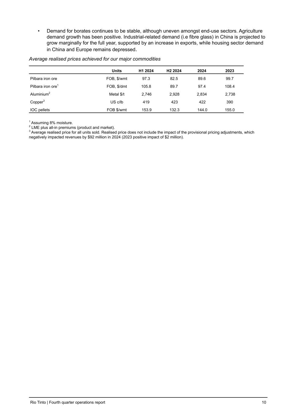 • Demand for borates continues to be stable, although uneven amongst end-use sectors. Agriculture demand growth has been positive. Industrial-related demand (i.e fibre glass) in China is projected to grow marginally for the full year, supported by an increase in exports, while housing sector demand in China and Europe remains depressed. Average realised prices achieved for our major commodities Units H1 2024 H2 2024 2024 2023 Pilbara iron ore FOB, $/wmt 97.3 82.5 89.6 99.7 Pilbara iron ore1 FOB, $/dmt 105.8 89.7 97.4 108.4 Aluminium2 Metal $/t 2,746 2,928 2,834 2,738 Copper3 US c/lb 419 423 422 390 IOC pellets FOB $/wmt 153.9 132.3 144.0 155.0 1 Assuming 8% moisture. 2 LME plus all-in premiums (product and market). 3 Average realised price for all units sold. Realised price does not include the impact of the provisional pricing adjustments, which negatively impacted revenues by $92 million in 2024 (2023 positive impact of $2 million). Rio Tinto | Fourth quarter operations report 10