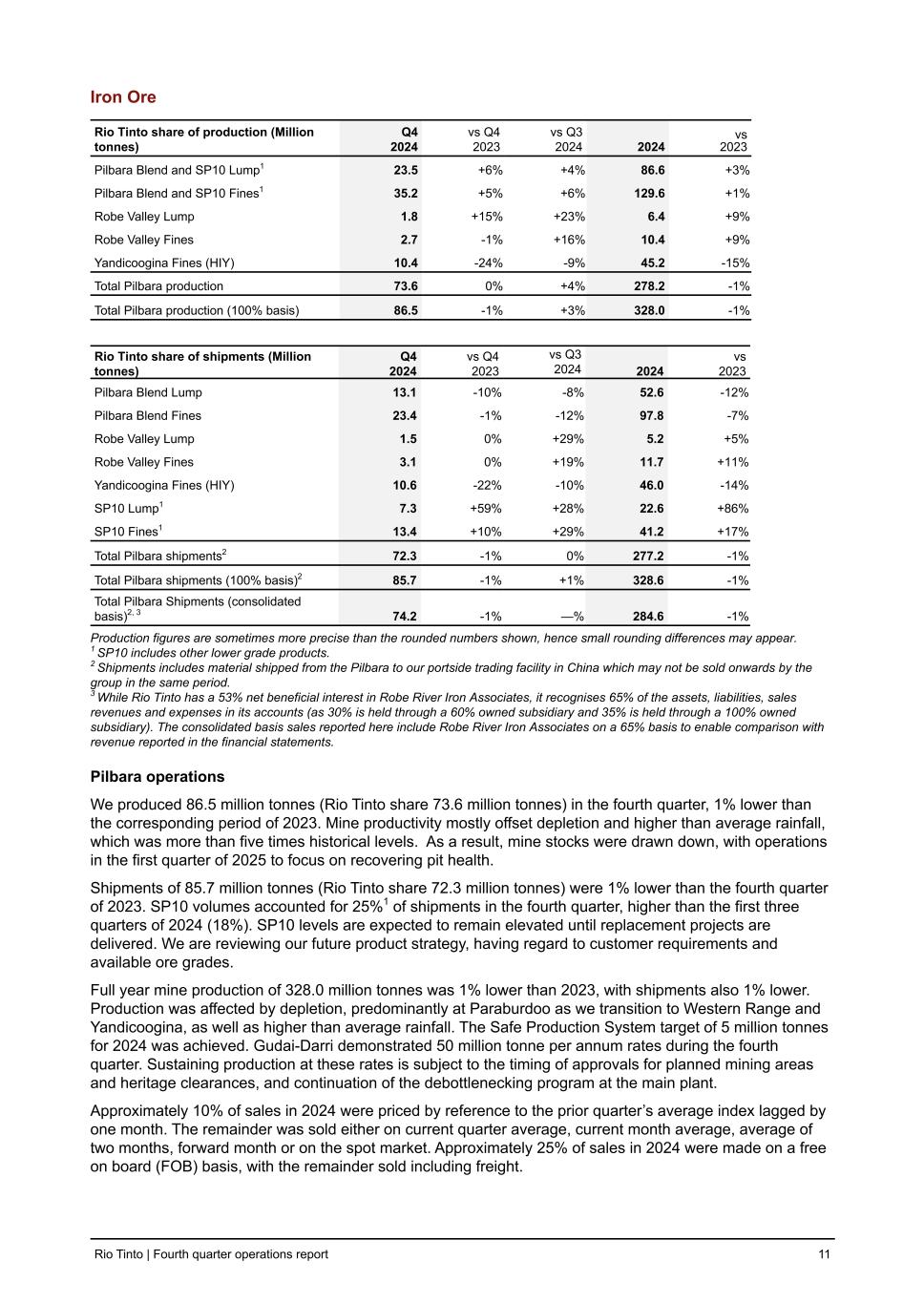 Iron Ore Rio Tinto share of production (Million tonnes) Q4 2024 vs Q4 2023 vs Q3 2024 2024 vs 2023 Pilbara Blend and SP10 Lump1 23.5 +6 % +4 % 86.6 +3 % Pilbara Blend and SP10 Fines1 35.2 +5 % +6 % 129.6 +1 % Robe Valley Lump 1.8 +15 % +23 % 6.4 +9 % Robe Valley Fines 2.7 -1 % +16 % 10.4 +9 % Yandicoogina Fines (HIY) 10.4 -24 % -9 % 45.2 -15 % Total Pilbara production 73.6 0 % +4 % 278.2 -1 % Total Pilbara production (100% basis) 86.5 -1 % +3 % 328.0 -1 % Rio Tinto share of shipments (Million tonnes) Q4 2024 vs Q4 2023 vs Q3 2024 2024 vs 2023 Pilbara Blend Lump 13.1 -10 % -8 % 52.6 -12 % Pilbara Blend Fines 23.4 -1 % -12 % 97.8 -7 % Robe Valley Lump 1.5 0 % +29 % 5.2 +5 % Robe Valley Fines 3.1 0 % +19 % 11.7 +11 % Yandicoogina Fines (HIY) 10.6 -22 % -10 % 46.0 -14 % SP10 Lump1 7.3 +59 % +28 % 22.6 +86 % SP10 Fines1 13.4 +10 % +29 % 41.2 +17 % Total Pilbara shipments2 72.3 -1 % 0 % 277.2 -1 % Total Pilbara shipments (100% basis)2 85.7 -1 % +1 % 328.6 -1 % Total Pilbara Shipments (consolidated basis)2, 3 74.2 -1 % — % 284.6 -1 % Production figures are sometimes more precise than the rounded numbers shown, hence small rounding differences may appear. 1 SP10 includes other lower grade products. 2 Shipments includes material shipped from the Pilbara to our portside trading facility in China which may not be sold onwards by the group in the same period. 3 While Rio Tinto has a 53% net beneficial interest in Robe River Iron Associates, it recognises 65% of the assets, liabilities, sales revenues and expenses in its accounts (as 30% is held through a 60% owned subsidiary and 35% is held through a 100% owned subsidiary). The consolidated basis sales reported here include Robe River Iron Associates on a 65% basis to enable comparison with revenue reported in the financial statements. Pilbara operations We produced 86.5 million tonnes (Rio Tinto share 73.6 million tonnes) in the fourth quarter, 1% lower than the corresponding period of 2023. Mine productivity mostly offset depletion and higher than average rainfall, which was more than five times historical levels. As a result, mine stocks were drawn down, with operations in the first quarter of 2025 to focus on recovering pit health. Shipments of 85.7 million tonnes (Rio Tinto share 72.3 million tonnes) were 1% lower than the fourth quarter of 2023. SP10 volumes accounted for 25%1 of shipments in the fourth quarter, higher than the first three quarters of 2024 (18%). SP10 levels are expected to remain elevated until replacement projects are delivered. We are reviewing our future product strategy, having regard to customer requirements and available ore grades. Full year mine production of 328.0 million tonnes was 1% lower than 2023, with shipments also 1% lower. Production was affected by depletion, predominantly at Paraburdoo as we transition to Western Range and Yandicoogina, as well as higher than average rainfall. The Safe Production System target of 5 million tonnes for 2024 was achieved. Gudai-Darri demonstrated 50 million tonne per annum rates during the fourth quarter. Sustaining production at these rates is subject to the timing of approvals for planned mining areas and heritage clearances, and continuation of the debottlenecking program at the main plant. Approximately 10% of sales in 2024 were priced by reference to the prior quarter’s average index lagged by one month. The remainder was sold either on current quarter average, current month average, average of two months, forward month or on the spot market. Approximately 25% of sales in 2024 were made on a free on board (FOB) basis, with the remainder sold including freight. Rio Tinto | Fourth quarter operations report 11