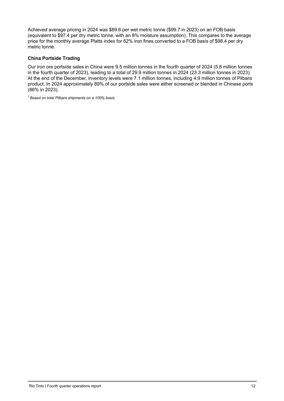 Achieved average pricing in 2024 was $89.6 per wet metric tonne ($99.7 in 2023) on an FOB basis (equivalent to $97.4 per dry metric tonne, with an 8% moisture assumption). This compares to the average price for the monthly average Platts index for 62% iron fines converted to a FOB basis of $98.4 per dry metric tonne. China Portside Trading Our iron ore portside sales in China were 9.5 million tonnes in the fourth quarter of 2024 (5.8 million tonnes in the fourth quarter of 2023), leading to a total of 29.9 million tonnes in 2024 (23.3 million tonnes in 2023). At the end of the December, inventory levels were 7.1 million tonnes, including 4.9 million tonnes of Pilbara product. In 2024 approximately 89% of our portside sales were either screened or blended in Chinese ports (86% in 2023). 1 Based on total Pilbara shipments on a 100% basis. Rio Tinto | Fourth quarter operations report 12
