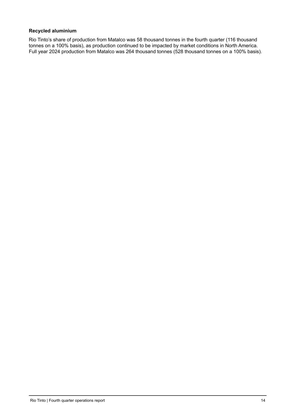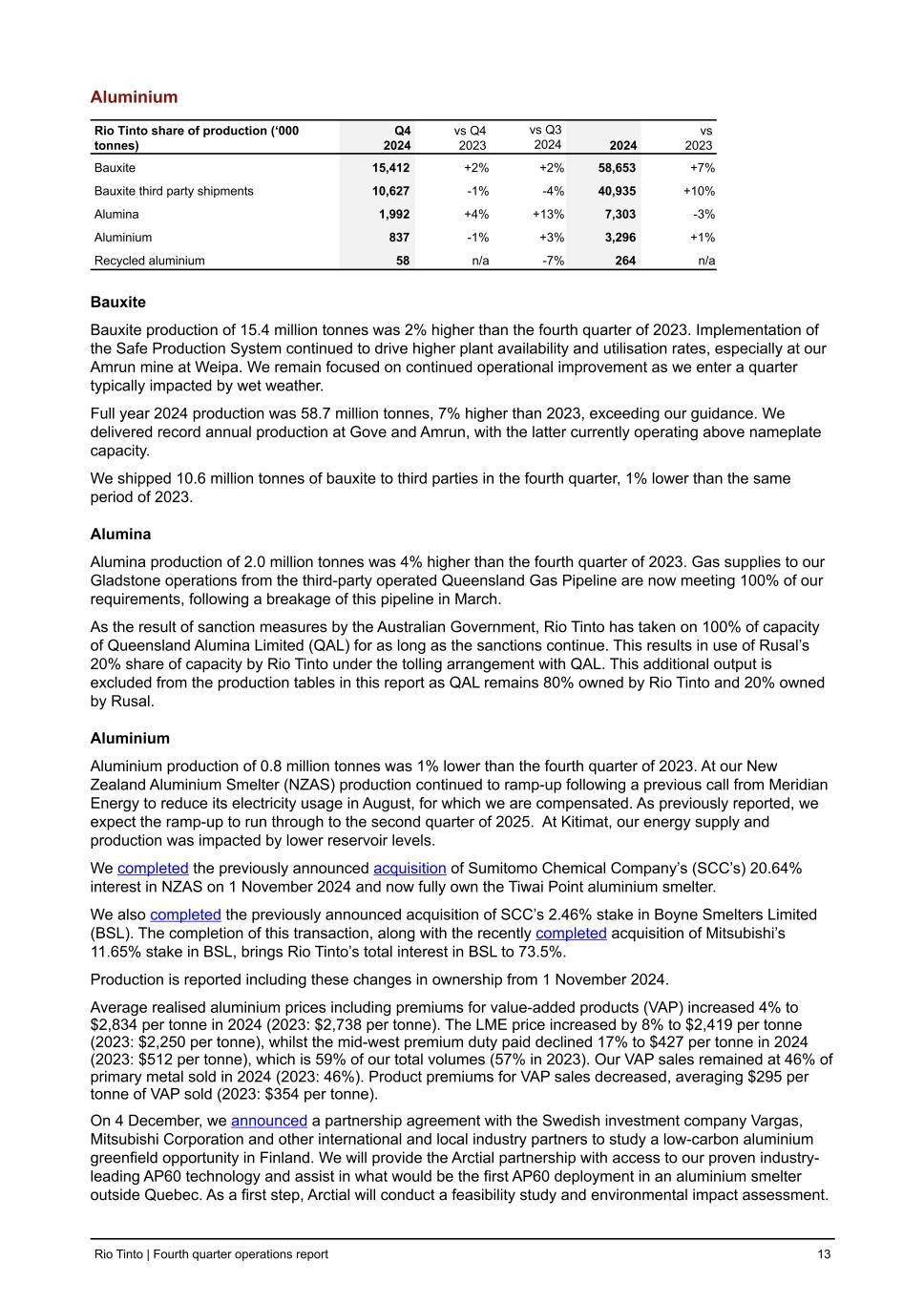 Aluminium Rio Tinto share of production (‘000 tonnes) Q4 2024 vs Q4 2023 vs Q3 2024 2024 vs 2023 Bauxite 15,412 +2 % +2 % 58,653 +7 % Bauxite third party shipments 10,627 -1 % -4 % 40,935 +10 % Alumina 1,992 +4 % +13 % 7,303 -3 % Aluminium 837 -1 % +3 % 3,296 +1 % Recycled aluminium 58 n/a -7 % 264 n/a Bauxite Bauxite production of 15.4 million tonnes was 2% higher than the fourth quarter of 2023. Implementation of the Safe Production System continued to drive higher plant availability and utilisation rates, especially at our Amrun mine at Weipa. We remain focused on continued operational improvement as we enter a quarter typically impacted by wet weather. Full year 2024 production was 58.7 million tonnes, 7% higher than 2023, exceeding our guidance. We delivered record annual production at Gove and Amrun, with the latter currently operating above nameplate capacity. We shipped 10.6 million tonnes of bauxite to third parties in the fourth quarter, 1% lower than the same period of 2023. Alumina Alumina production of 2.0 million tonnes was 4% higher than the fourth quarter of 2023. Gas supplies to our Gladstone operations from the third-party operated Queensland Gas Pipeline are now meeting 100% of our requirements, following a breakage of this pipeline in March. As the result of sanction measures by the Australian Government, Rio Tinto has taken on 100% of capacity of Queensland Alumina Limited (QAL) for as long as the sanctions continue. This results in use of Rusal’s 20% share of capacity by Rio Tinto under the tolling arrangement with QAL. This additional output is excluded from the production tables in this report as QAL remains 80% owned by Rio Tinto and 20% owned by Rusal. Aluminium Aluminium production of 0.8 million tonnes was 1% lower than the fourth quarter of 2023. At our New Zealand Aluminium Smelter (NZAS) production continued to ramp-up following a previous call from Meridian Energy to reduce its electricity usage in August, for which we are compensated. As previously reported, we expect the ramp-up to run through to the second quarter of 2025. At Kitimat, our energy supply and production was impacted by lower reservoir levels. We completed the previously announced acquisition of Sumitomo Chemical Company’s (SCC’s) 20.64% interest in NZAS on 1 November 2024 and now fully own the Tiwai Point aluminium smelter. We also completed the previously announced acquisition of SCC’s 2.46% stake in Boyne Smelters Limited (BSL). The completion of this transaction, along with the recently completed acquisition of Mitsubishi’s 11.65% stake in BSL, brings Rio Tinto’s total interest in BSL to 73.5%. Production is reported including these changes in ownership from 1 November 2024. Average realised aluminium prices including premiums for value-added products (VAP) increased 4% to $2,834 per tonne in 2024 (2023: $2,738 per tonne). The LME price increased by 8% to $2,419 per tonne (2023: $2,250 per tonne), whilst the mid-west premium duty paid declined 17% to $427 per tonne in 2024 (2023: $512 per tonne), which is 59% of our total volumes (57% in 2023). Our VAP sales remained at 46% of primary metal sold in 2024 (2023: 46%). Product premiums for VAP sales decreased, averaging $295 per tonne of VAP sold (2023: $354 per tonne). On 4 December, we announced a partnership agreement with the Swedish investment company Vargas, Mitsubishi Corporation and other international and local industry partners to study a low-carbon aluminium greenfield opportunity in Finland. We will provide the Arctial partnership with access to our proven industry- leading AP60 technology and assist in what would be the first AP60 deployment in an aluminium smelter outside Quebec. As a first step, Arctial will conduct a feasibility study and environmental impact assessment. Rio Tinto | Fourth quarter operations report 13