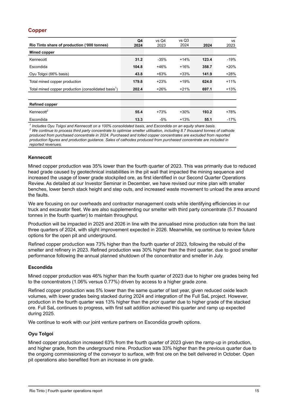 Copper Rio Tinto share of production (‘000 tonnes) Q4 2024 vs Q4 2023 vs Q3 2024 2024 vs 2023 Mined copper Kennecott 31.2 -35 % +14 % 123.4 -19 % Escondida 104.8 +46 % +16 % 358.7 +20 % Oyu Tolgoi (66% basis) 43.8 +63 % +33 % 141.9 +28 % Total mined copper production 179.8 +23 % +19 % 624.0 +11 % Total mined copper production (consolidated basis1) 202.4 +26 % +21 % 697.1 +13 % Refined copper Kennecott2 55.4 +73 % +30 % 193.2 +78 % Escondida 13.3 -5 % +13 % 55.1 -17 % 1 Includes Oyu Tolgoi and Kennecott on a 100% consolidated basis, and Escondida on an equity share basis. 2 We continue to process third party concentrate to optimise smelter utilisation, including 8.7 thousand tonnes of cathode produced from purchased concentrate in 2024. Purchased and tolled copper concentrates are excluded from reported production figures and production guidance. Sales of cathodes produced from purchased concentrate are included in reported revenues. Kennecott Mined copper production was 35% lower than the fourth quarter of 2023. This was primarily due to reduced head grade caused by geotechnical instabilities in the pit wall that impacted the mining sequence and increased the usage of lower grade stockpiled ore, as first identified in our Second Quarter Operations Review. As detailed at our Investor Seminar in December, we have revised our mine plan with smaller benches, lower bench stack height and step outs, and increased waste movement to unload the area around the faults. We are focusing on our overheads and contractor management costs while identifying efficiencies in our truck and excavator fleet. We are also supplementing our smelter with third party concentrate (5.7 thousand tonnes in the fourth quarter) to maintain throughput. Production will be impacted in 2025 and 2026 in line with the annualised mine production rate from the last three quarters of 2024, with slight improvement expected in 2026. Meanwhile, we continue to review future options for the open pit and underground. Refined copper production was 73% higher than the fourth quarter of 2023, following the rebuild of the smelter and refinery in 2023. Refined production was 30% higher than the third quarter, due to good smelter performance following the annual planned shutdown of the concentrator and smelter in July. Escondida Mined copper production was 46% higher than the fourth quarter of 2023 due to higher ore grades being fed to the concentrators (1.06% versus 0.77%) driven by access to a higher grade zone. Refined copper production was 5% lower than the same quarter of last year, given reduced oxide leach volumes, with lower grades being stacked during 2024 and integration of the Full SaL project. However, production in the fourth quarter was 13% higher than the prior quarter due to higher grade of the stacked ore. Full SaL continues to progress, with first salt addition achieved this quarter and ramp up expected during 2025. We continue to work with our joint venture partners on Escondida growth options. Oyu Tolgoi Mined copper production increased 63% from the fourth quarter of 2023 given the ramp-up in production, and higher grade, from the underground mine. Production was 33% higher than the previous quarter due to the ongoing commissioning of the conveyor to surface, with first ore on the belt delivered in October. Open pit operations also benefited from an increase in ore grade. Rio Tinto | Fourth quarter operations report 15