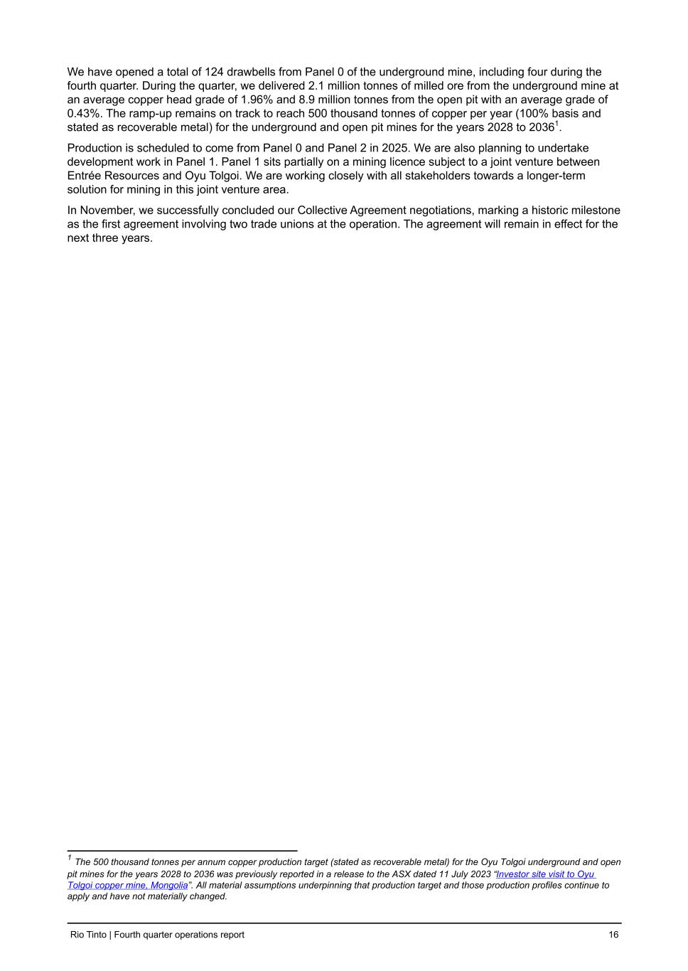 We have opened a total of 124 drawbells from Panel 0 of the underground mine, including four during the fourth quarter. During the quarter, we delivered 2.1 million tonnes of milled ore from the underground mine at an average copper head grade of 1.96% and 8.9 million tonnes from the open pit with an average grade of 0.43%. The ramp-up remains on track to reach 500 thousand tonnes of copper per year (100% basis and stated as recoverable metal) for the underground and open pit mines for the years 2028 to 20361. Production is scheduled to come from Panel 0 and Panel 2 in 2025. We are also planning to undertake development work in Panel 1. Panel 1 sits partially on a mining licence subject to a joint venture between Entrée Resources and Oyu Tolgoi. We are working closely with all stakeholders towards a longer-term solution for mining in this joint venture area. In November, we successfully concluded our Collective Agreement negotiations, marking a historic milestone as the first agreement involving two trade unions at the operation. The agreement will remain in effect for the next three years. Rio Tinto | Fourth quarter operations report 16 1 The 500 thousand tonnes per annum copper production target (stated as recoverable metal) for the Oyu Tolgoi underground and open pit mines for the years 2028 to 2036 was previously reported in a release to the ASX dated 11 July 2023 “Investor site visit to Oyu Tolgoi copper mine, Mongolia”. All material assumptions underpinning that production target and those production profiles continue to apply and have not materially changed.