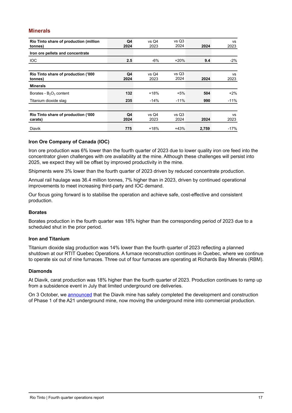 Minerals Rio Tinto share of production (million tonnes) Q4 2024 vs Q4 2023 vs Q3 2024 2024 vs 2023 Iron ore pellets and concentrate IOC 2.5 -6 % +20 % 9.4 -2 % Rio Tinto share of production (’000 tonnes) Q4 2024 vs Q4 2023 vs Q3 2024 2024 vs 2023 Minerals Borates - B2O3 content 132 +18 % +5 % 504 +2 % Titanium dioxide slag 235 -14 % -11 % 990 -11 % Rio Tinto share of production (‘000 carats) Q4 2024 vs Q4 2023 vs Q3 2024 2024 vs 2023 Diavik 775 +18 % +43 % 2,759 -17 % Iron Ore Company of Canada (IOC) Iron ore production was 6% lower than the fourth quarter of 2023 due to lower quality iron ore feed into the concentrator given challenges with ore availability at the mine. Although these challenges will persist into 2025, we expect they will be offset by improved productivity in the mine. Shipments were 3% lower than the fourth quarter of 2023 driven by reduced concentrate production. Annual rail haulage was 36.4 million tonnes, 7% higher than in 2023, driven by continued operational improvements to meet increasing third-party and IOC demand. Our focus going forward is to stabilise the operation and achieve safe, cost-effective and consistent production. Borates Borates production in the fourth quarter was 18% higher than the corresponding period of 2023 due to a scheduled shut in the prior period. Iron and Titanium Titanium dioxide slag production was 14% lower than the fourth quarter of 2023 reflecting a planned shutdown at our RTIT Quebec Operations. A furnace reconstruction continues in Quebec, where we continue to operate six out of nine furnaces. Three out of four furnaces are operating at Richards Bay Minerals (RBM). Diamonds At Diavik, carat production was 18% higher than the fourth quarter of 2023. Production continues to ramp up from a subsidence event in July that limited underground ore deliveries. On 3 October, we announced that the Diavik mine has safely completed the development and construction of Phase 1 of the A21 underground mine, now moving the underground mine into commercial production. Rio Tinto | Fourth quarter operations report 17