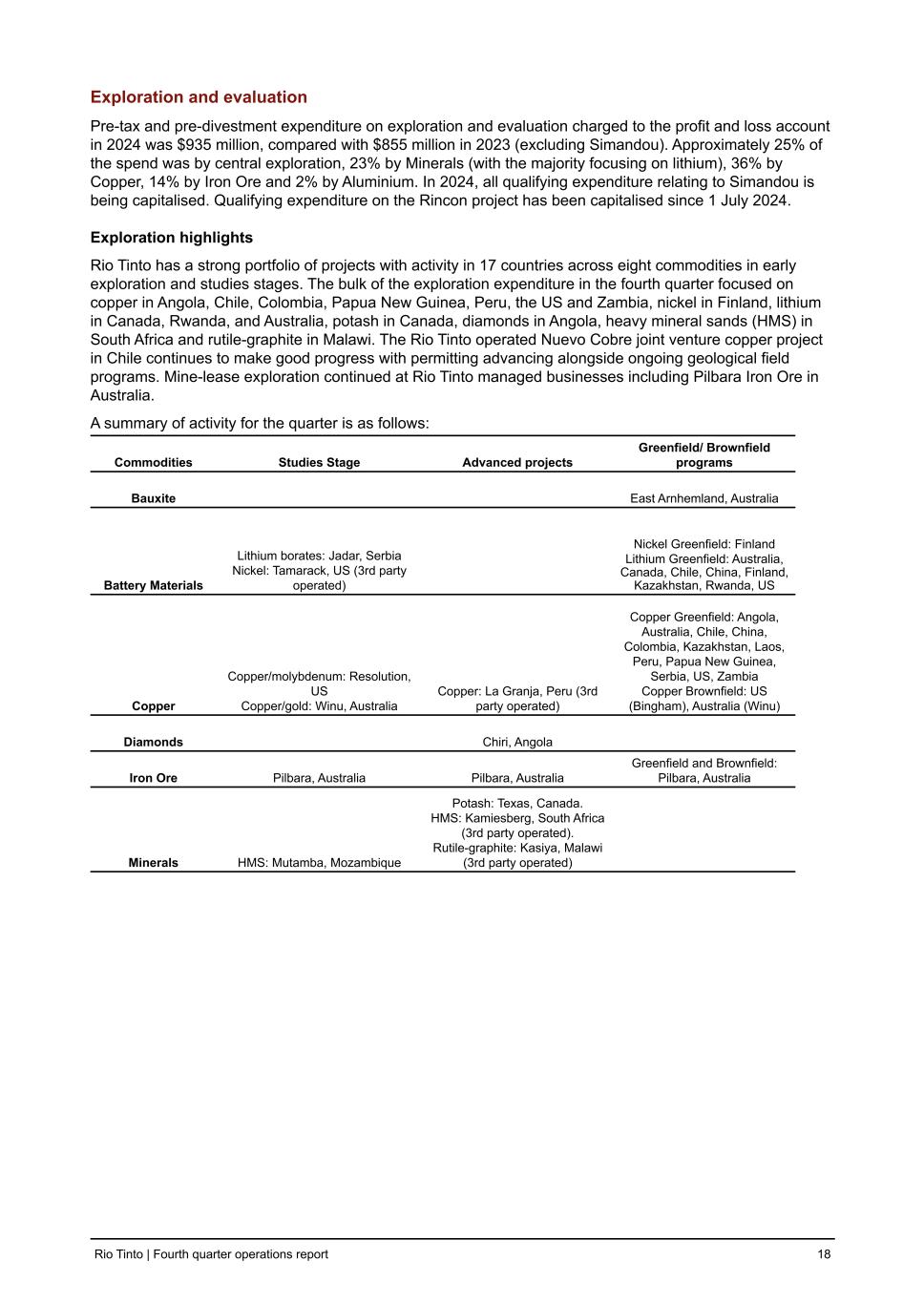 Exploration and evaluation Pre-tax and pre-divestment expenditure on exploration and evaluation charged to the profit and loss account in 2024 was $935 million, compared with $855 million in 2023 (excluding Simandou). Approximately 25% of the spend was by central exploration, 23% by Minerals (with the majority focusing on lithium), 36% by Copper, 14% by Iron Ore and 2% by Aluminium. In 2024, all qualifying expenditure relating to Simandou is being capitalised. Qualifying expenditure on the Rincon project has been capitalised since 1 July 2024. Exploration highlights Rio Tinto has a strong portfolio of projects with activity in 17 countries across eight commodities in early exploration and studies stages. The bulk of the exploration expenditure in the fourth quarter focused on copper in Angola, Chile, Colombia, Papua New Guinea, Peru, the US and Zambia, nickel in Finland, lithium in Canada, Rwanda, and Australia, potash in Canada, diamonds in Angola, heavy mineral sands (HMS) in South Africa and rutile-graphite in Malawi. The Rio Tinto operated Nuevo Cobre joint venture copper project in Chile continues to make good progress with permitting advancing alongside ongoing geological field programs. Mine-lease exploration continued at Rio Tinto managed businesses including Pilbara Iron Ore in Australia. A summary of activity for the quarter is as follows: Commodities Studies Stage Advanced projects Greenfield/ Brownfield programs Bauxite East Arnhemland, Australia Battery Materials Lithium borates: Jadar, Serbia Nickel: Tamarack, US (3rd party operated) Nickel Greenfield: Finland Lithium Greenfield: Australia, Canada, Chile, China, Finland, Kazakhstan, Rwanda, US Copper Copper/molybdenum: Resolution, US Copper/gold: Winu, Australia Copper: La Granja, Peru (3rd party operated) Copper Greenfield: Angola, Australia, Chile, China, Colombia, Kazakhstan, Laos, Peru, Papua New Guinea, Serbia, US, Zambia Copper Brownfield: US (Bingham), Australia (Winu) Diamonds Chiri, Angola Iron Ore Pilbara, Australia Pilbara, Australia Greenfield and Brownfield: Pilbara, Australia Minerals HMS: Mutamba, Mozambique Potash: Texas, Canada. HMS: Kamiesberg, South Africa (3rd party operated). Rutile-graphite: Kasiya, Malawi (3rd party operated) Rio Tinto | Fourth quarter operations report 18
