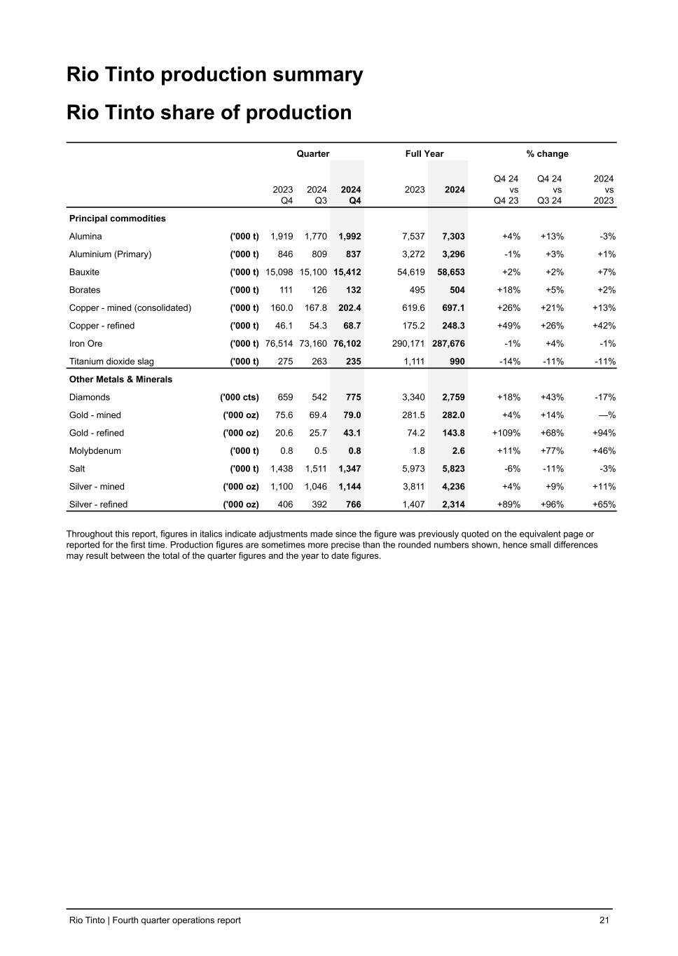 Rio Tinto production summary Rio Tinto share of production Quarter Full Year % change 2023 Q4 2024 Q3 2024 Q4 2023 2024 Q4 24 vs Q4 23 Q4 24 vs Q3 24 2024 vs 2023 Principal commodities Alumina ('000 t) 1,919 1,770 1,992 7,537 7,303 +4 % +13 % -3 % Aluminium (Primary) ('000 t) 846 809 837 3,272 3,296 -1 % +3 % +1 % Bauxite ('000 t) 15,098 15,100 15,412 54,619 58,653 +2 % +2 % +7 % Borates ('000 t) 111 126 132 495 504 +18 % +5 % +2 % Copper - mined (consolidated) ('000 t) 160.0 167.8 202.4 619.6 697.1 +26 % +21 % +13 % Copper - refined ('000 t) 46.1 54.3 68.7 175.2 248.3 +49 % +26 % +42 % Iron Ore ('000 t) 76,514 73,160 76,102 290,171 287,676 -1 % +4 % -1 % Titanium dioxide slag ('000 t) 275 263 235 1,111 990 -14 % -11 % -11 % Other Metals & Minerals Diamonds ('000 cts) 659 542 775 3,340 2,759 +18 % +43 % -17 % Gold - mined ('000 oz) 75.6 69.4 79.0 281.5 282.0 +4 % +14 % — % Gold - refined ('000 oz) 20.6 25.7 43.1 74.2 143.8 +109 % +68 % +94 % Molybdenum ('000 t) 0.8 0.5 0.8 1.8 2.6 +11 % +77 % +46 % Salt ('000 t) 1,438 1,511 1,347 5,973 5,823 -6 % -11 % -3 % Silver - mined ('000 oz) 1,100 1,046 1,144 3,811 4,236 +4 % +9 % +11 % Silver - refined ('000 oz) 406 392 766 1,407 2,314 +89 % +96 % +65 % Throughout this report, figures in italics indicate adjustments made since the figure was previously quoted on the equivalent page or reported for the first time. Production figures are sometimes more precise than the rounded numbers shown, hence small differences may result between the total of the quarter figures and the year to date figures. Rio Tinto | Fourth quarter operations report 21