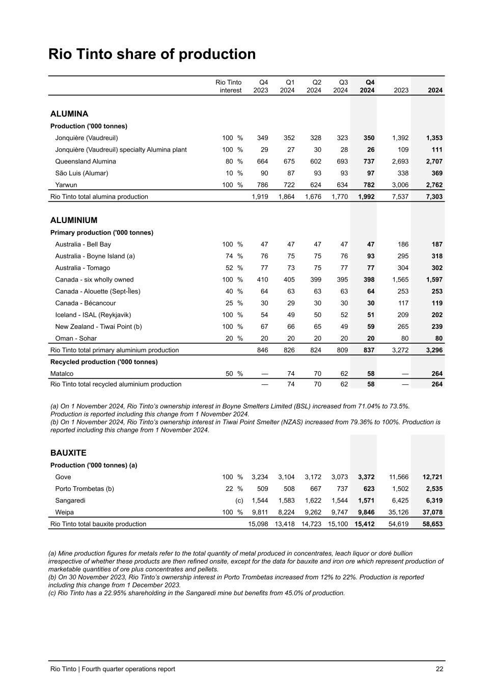 Rio Tinto share of production Rio Tinto interest Q4 2023 Q1 2024 Q2 2024 Q3 2024 Q4 2024 2023 2024 ALUMINA Production ('000 tonnes) Jonquière (Vaudreuil) 100 % 349 352 328 323 350 1,392 1,353 Jonquière (Vaudreuil) specialty Alumina plant 100 % 29 27 30 28 26 109 111 Queensland Alumina 80 % 664 675 602 693 737 2,693 2,707 São Luis (Alumar) 10 % 90 87 93 93 97 338 369 Yarwun 100 % 786 722 624 634 782 3,006 2,762 Rio Tinto total alumina production 1,919 1,864 1,676 1,770 1,992 7,537 7,303 ALUMINIUM Primary production ('000 tonnes) Australia - Bell Bay 100 % 47 47 47 47 47 186 187 Australia - Boyne Island (a) 74 % 76 75 75 76 93 295 318 Australia - Tomago 52 % 77 73 75 77 77 304 302 Canada - six wholly owned 100 % 410 405 399 395 398 1,565 1,597 Canada - Alouette (Sept-Îles) 40 % 64 63 63 63 64 253 253 Canada - Bécancour 25 % 30 29 30 30 30 117 119 Iceland - ISAL (Reykjavik) 100 % 54 49 50 52 51 209 202 New Zealand - Tiwai Point (b) 100 % 67 66 65 49 59 265 239 Oman - Sohar 20 % 20 20 20 20 20 80 80 Rio Tinto total primary aluminium production 846 826 824 809 837 3,272 3,296 Recycled production ('000 tonnes) Matalco 50 % — 74 70 62 58 — 264 Rio Tinto total recycled aluminium production — 74 70 62 58 — 264 (a) On 1 November 2024, Rio Tinto’s ownership interest in Boyne Smelters Limited (BSL) increased from 71.04% to 73.5%. Production is reported including this change from 1 November 2024. (b) On 1 November 2024, Rio Tinto’s ownership interest in Tiwai Point Smelter (NZAS) increased from 79.36% to 100%. Production is reported including this change from 1 November 2024. BAUXITE Production ('000 tonnes) (a) Gove 100 % 3,234 3,104 3,172 3,073 3,372 11,566 12,721 Porto Trombetas (b) 22 % 509 508 667 737 623 1,502 2,535 Sangaredi (c) 1,544 1,583 1,622 1,544 1,571 6,425 6,319 Weipa 100 % 9,811 8,224 9,262 9,747 9,846 35,126 37,078 Rio Tinto total bauxite production 15,098 13,418 14,723 15,100 15,412 54,619 58,653 (a) Mine production figures for metals refer to the total quantity of metal produced in concentrates, leach liquor or doré bullion irrespective of whether these products are then refined onsite, except for the data for bauxite and iron ore which represent production of marketable quantities of ore plus concentrates and pellets. (b) On 30 November 2023, Rio Tinto’s ownership interest in Porto Trombetas increased from 12% to 22%. Production is reported including this change from 1 December 2023. (c) Rio Tinto has a 22.95% shareholding in the Sangaredi mine but benefits from 45.0% of production. Rio Tinto | Fourth quarter operations report 22