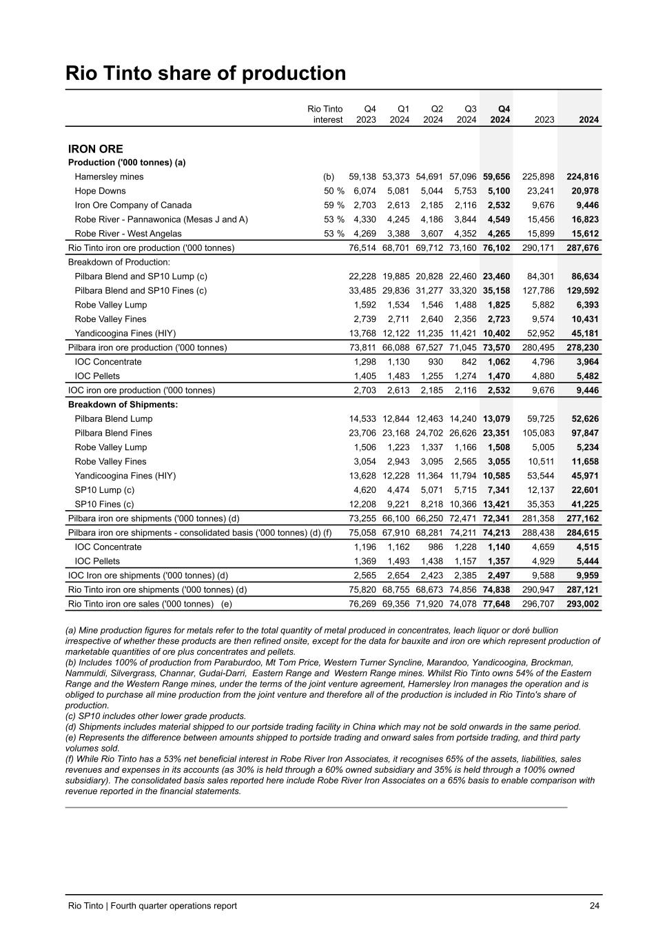 Rio Tinto share of production Rio Tinto interest Q4 2023 Q1 2024 Q2 2024 Q3 2024 Q4 2024 2023 2024 IRON ORE Production ('000 tonnes) (a) Hamersley mines (b) 59,138 53,373 54,691 57,096 59,656 225,898 224,816 Hope Downs 50 % 6,074 5,081 5,044 5,753 5,100 23,241 20,978 Iron Ore Company of Canada 59 % 2,703 2,613 2,185 2,116 2,532 9,676 9,446 Robe River - Pannawonica (Mesas J and A) 53 % 4,330 4,245 4,186 3,844 4,549 15,456 16,823 Robe River - West Angelas 53 % 4,269 3,388 3,607 4,352 4,265 15,899 15,612 Rio Tinto iron ore production ('000 tonnes) 76,514 68,701 69,712 73,160 76,102 290,171 287,676 Breakdown of Production: Pilbara Blend and SP10 Lump (c) 22,228 19,885 20,828 22,460 23,460 84,301 86,634 Pilbara Blend and SP10 Fines (c) 33,485 29,836 31,277 33,320 35,158 127,786 129,592 Robe Valley Lump 1,592 1,534 1,546 1,488 1,825 5,882 6,393 Robe Valley Fines 2,739 2,711 2,640 2,356 2,723 9,574 10,431 Yandicoogina Fines (HIY) 13,768 12,122 11,235 11,421 10,402 52,952 45,181 Pilbara iron ore production ('000 tonnes) 73,811 66,088 67,527 71,045 73,570 280,495 278,230 IOC Concentrate 1,298 1,130 930 842 1,062 4,796 3,964 IOC Pellets 1,405 1,483 1,255 1,274 1,470 4,880 5,482 IOC iron ore production ('000 tonnes) 2,703 2,613 2,185 2,116 2,532 9,676 9,446 Breakdown of Shipments: Pilbara Blend Lump 14,533 12,844 12,463 14,240 13,079 59,725 52,626 Pilbara Blend Fines 23,706 23,168 24,702 26,626 23,351 105,083 97,847 Robe Valley Lump 1,506 1,223 1,337 1,166 1,508 5,005 5,234 Robe Valley Fines 3,054 2,943 3,095 2,565 3,055 10,511 11,658 Yandicoogina Fines (HIY) 13,628 12,228 11,364 11,794 10,585 53,544 45,971 SP10 Lump (c) 4,620 4,474 5,071 5,715 7,341 12,137 22,601 SP10 Fines (c) 12,208 9,221 8,218 10,366 13,421 35,353 41,225 Pilbara iron ore shipments ('000 tonnes) (d) 73,255 66,100 66,250 72,471 72,341 281,358 277,162 Pilbara iron ore shipments - consolidated basis ('000 tonnes) (d) (f) 75,058 67,910 68,281 74,211 74,213 288,438 284,615 IOC Concentrate 1,196 1,162 986 1,228 1,140 4,659 4,515 IOC Pellets 1,369 1,493 1,438 1,157 1,357 4,929 5,444 IOC Iron ore shipments ('000 tonnes) (d) 2,565 2,654 2,423 2,385 2,497 9,588 9,959 Rio Tinto iron ore shipments ('000 tonnes) (d) 75,820 68,755 68,673 74,856 74,838 290,947 287,121 Rio Tinto iron ore sales ('000 tonnes) (e) 76,269 69,356 71,920 74,078 77,648 296,707 293,002 (a) Mine production figures for metals refer to the total quantity of metal produced in concentrates, leach liquor or doré bullion irrespective of whether these products are then refined onsite, except for the data for bauxite and iron ore which represent production of marketable quantities of ore plus concentrates and pellets. (b) Includes 100% of production from Paraburdoo, Mt Tom Price, Western Turner Syncline, Marandoo, Yandicoogina, Brockman, Nammuldi, Silvergrass, Channar, Gudai-Darri, Eastern Range and Western Range mines. Whilst Rio Tinto owns 54% of the Eastern Range and the Western Range mines, under the terms of the joint venture agreement, Hamersley Iron manages the operation and is obliged to purchase all mine production from the joint venture and therefore all of the production is included in Rio Tinto's share of production. (c) SP10 includes other lower grade products. (d) Shipments includes material shipped to our portside trading facility in China which may not be sold onwards in the same period. (e) Represents the difference between amounts shipped to portside trading and onward sales from portside trading, and third party volumes sold. (f) While Rio Tinto has a 53% net beneficial interest in Robe River Iron Associates, it recognises 65% of the assets, liabilities, sales revenues and expenses in its accounts (as 30% is held through a 60% owned subsidiary and 35% is held through a 100% owned subsidiary). The consolidated basis sales reported here include Robe River Iron Associates on a 65% basis to enable comparison with revenue reported in the financial statements. Rio Tinto | Fourth quarter operations report 24