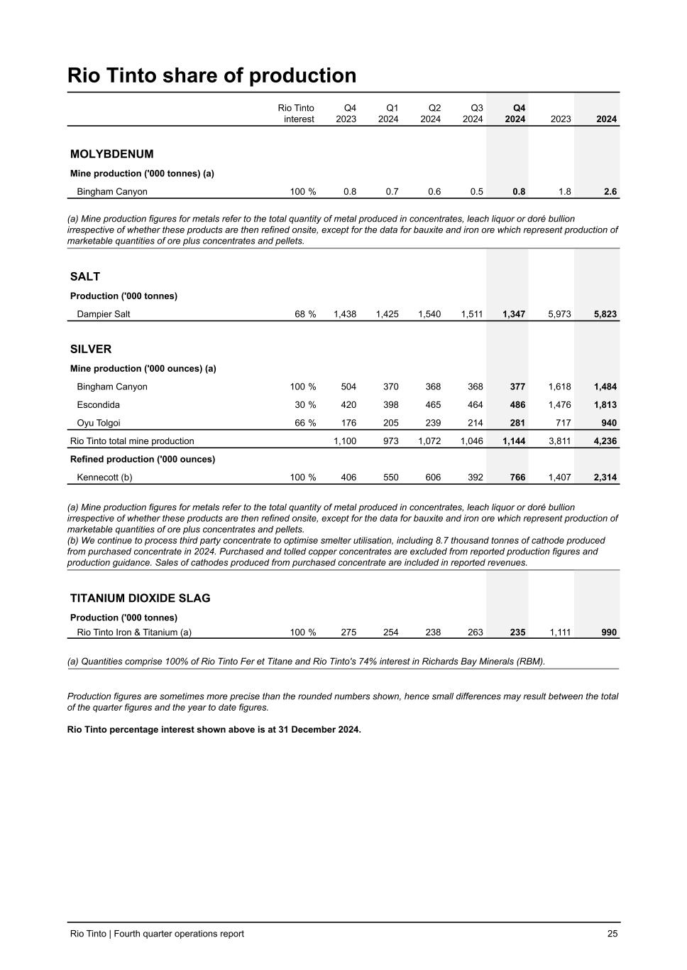 Rio Tinto share of production Rio Tinto interest Q4 2023 Q1 2024 Q2 2024 Q3 2024 Q4 2024 2023 2024 MOLYBDENUM Mine production ('000 tonnes) (a) Bingham Canyon 100 % 0.8 0.7 0.6 0.5 0.8 1.8 2.6 (a) Mine production figures for metals refer to the total quantity of metal produced in concentrates, leach liquor or doré bullion irrespective of whether these products are then refined onsite, except for the data for bauxite and iron ore which represent production of marketable quantities of ore plus concentrates and pellets. SALT Production ('000 tonnes) Dampier Salt 68 % 1,438 1,425 1,540 1,511 1,347 5,973 5,823 SILVER Mine production ('000 ounces) (a) Bingham Canyon 100 % 504 370 368 368 377 1,618 1,484 Escondida 30 % 420 398 465 464 486 1,476 1,813 Oyu Tolgoi 66 % 176 205 239 214 281 717 940 Rio Tinto total mine production 1,100 973 1,072 1,046 1,144 3,811 4,236 Refined production ('000 ounces) Kennecott (b) 100 % 406 550 606 392 766 1,407 2,314 (a) Mine production figures for metals refer to the total quantity of metal produced in concentrates, leach liquor or doré bullion irrespective of whether these products are then refined onsite, except for the data for bauxite and iron ore which represent production of marketable quantities of ore plus concentrates and pellets. (b) We continue to process third party concentrate to optimise smelter utilisation, including 8.7 thousand tonnes of cathode produced from purchased concentrate in 2024. Purchased and tolled copper concentrates are excluded from reported production figures and production guidance. Sales of cathodes produced from purchased concentrate are included in reported revenues. TITANIUM DIOXIDE SLAG Production ('000 tonnes) Rio Tinto Iron & Titanium (a) 100 % 275 254 238 263 235 1,111 990 (a) Quantities comprise 100% of Rio Tinto Fer et Titane and Rio Tinto's 74% interest in Richards Bay Minerals (RBM). Production figures are sometimes more precise than the rounded numbers shown, hence small differences may result between the total of the quarter figures and the year to date figures. Rio Tinto percentage interest shown above is at 31 December 2024. Rio Tinto | Fourth quarter operations report 25