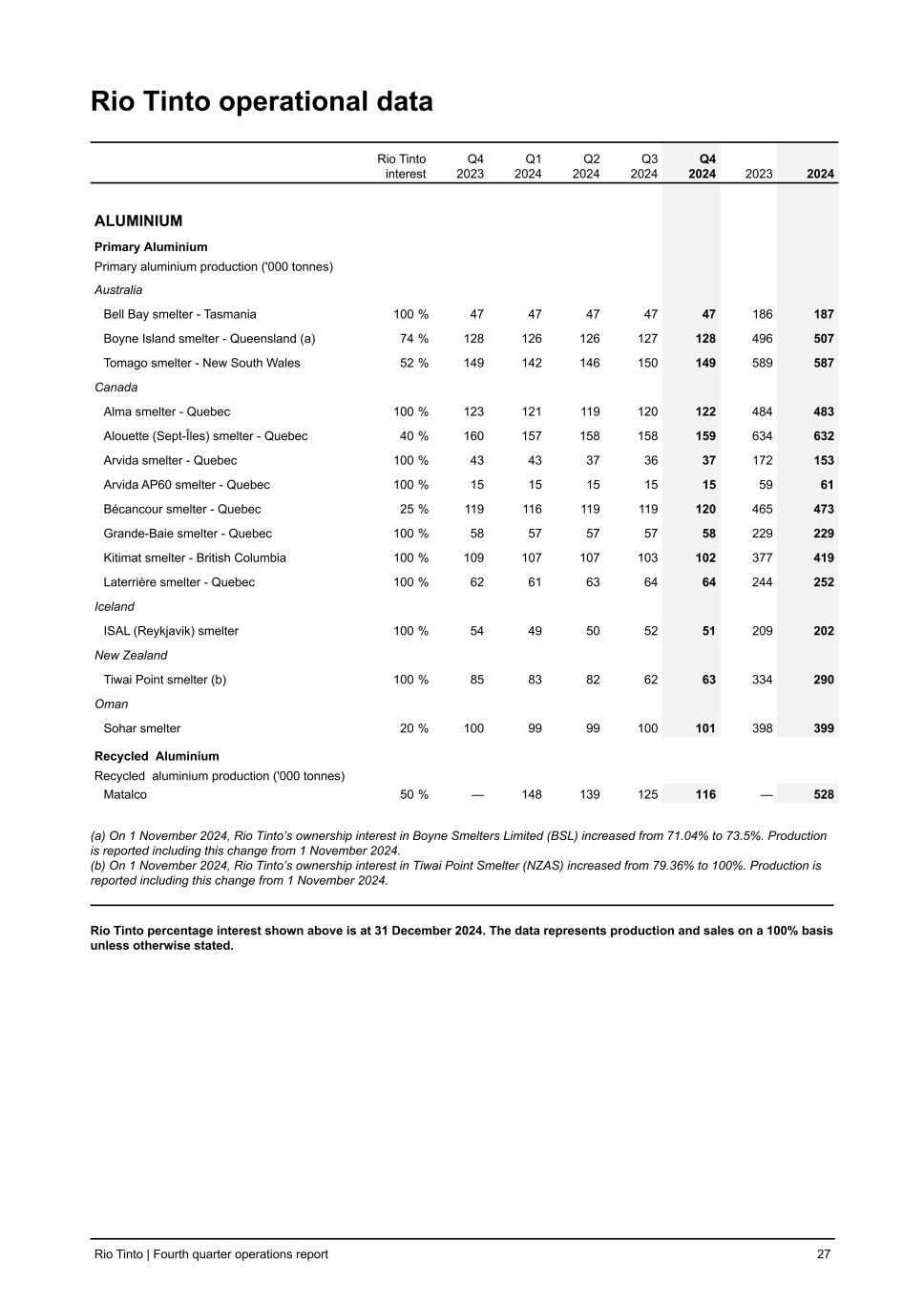 Rio Tinto operational data Rio Tinto interest Q4 2023 Q1 2024 Q2 2024 Q3 2024 Q4 2024 2023 2024 ALUMINIUM Primary Aluminium Primary aluminium production ('000 tonnes) Australia Bell Bay smelter - Tasmania 100 % 47 47 47 47 47 186 187 Boyne Island smelter - Queensland (a) 74 % 128 126 126 127 128 496 507 Tomago smelter - New South Wales 52 % 149 142 146 150 149 589 587 Canada Alma smelter - Quebec 100 % 123 121 119 120 122 484 483 Alouette (Sept-Îles) smelter - Quebec 40 % 160 157 158 158 159 634 632 Arvida smelter - Quebec 100 % 43 43 37 36 37 172 153 Arvida AP60 smelter - Quebec 100 % 15 15 15 15 15 59 61 Bécancour smelter - Quebec 25 % 119 116 119 119 120 465 473 Grande-Baie smelter - Quebec 100 % 58 57 57 57 58 229 229 Kitimat smelter - British Columbia 100 % 109 107 107 103 102 377 419 Laterrière smelter - Quebec 100 % 62 61 63 64 64 244 252 Iceland ISAL (Reykjavik) smelter 100 % 54 49 50 52 51 209 202 New Zealand Tiwai Point smelter (b) 100 % 85 83 82 62 63 334 290 Oman Sohar smelter 20 % 100 99 99 100 101 398 399 Recycled Aluminium Recycled aluminium production ('000 tonnes) Matalco 50 % — 148 139 125 116 — 528 (a) On 1 November 2024, Rio Tinto’s ownership interest in Boyne Smelters Limited (BSL) increased from 71.04% to 73.5%. Production is reported including this change from 1 November 2024. (b) On 1 November 2024, Rio Tinto’s ownership interest in Tiwai Point Smelter (NZAS) increased from 79.36% to 100%. Production is reported including this change from 1 November 2024. Rio Tinto percentage interest shown above is at 31 December 2024. The data represents production and sales on a 100% basis unless otherwise stated. Rio Tinto | Fourth quarter operations report 27
