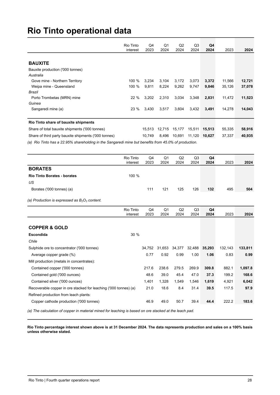 Rio Tinto operational data Rio Tinto interest Q4 2023 Q1 2024 Q2 2024 Q3 2024 Q4 2024 2023 2024 BAUXITE Bauxite production ('000 tonnes) Australia Gove mine - Northern Territory 100 % 3,234 3,104 3,172 3,073 3,372 11,566 12,721 Weipa mine - Queensland 100 % 9,811 8,224 9,262 9,747 9,846 35,126 37,078 Brazil Porto Trombetas (MRN) mine 22 % 3,202 2,310 3,034 3,348 2,831 11,472 11,523 Guinea Sangaredi mine (a) 23 % 3,430 3,517 3,604 3,432 3,491 14,278 14,043 Rio Tinto share of bauxite shipments Share of total bauxite shipments ('000 tonnes) 15,513 12,715 15,177 15,511 15,513 55,335 58,916 Share of third party bauxite shipments ('000 tonnes) 10,749 8,496 10,691 11,120 10,627 37,337 40,935 (a) Rio Tinto has a 22.95% shareholding in the Sangaredi mine but benefits from 45.0% of production. Rio Tinto interest Q4 2023 Q1 2024 Q2 2024 Q3 2024 Q4 2024 2023 2024 BORATES Rio Tinto Borates - borates 100 % US Borates ('000 tonnes) (a) 111 121 125 126 132 495 504 (a) Production is expressed as B2O3 content. Rio Tinto interest Q4 2023 Q1 2024 Q2 2024 Q3 2024 Q4 2024 2023 2024 COPPER & GOLD Escondida 30 % Chile Sulphide ore to concentrator ('000 tonnes) 34,752 31,653 34,377 32,488 35,293 132,143 133,811 Average copper grade (%) 0.77 0.92 0.99 1.00 1.06 0.83 0.99 Mill production (metals in concentrates): Contained copper ('000 tonnes) 217.6 238.6 279.5 269.9 309.8 882.1 1,097.8 Contained gold ('000 ounces) 48.6 39.0 45.4 47.0 37.3 199.2 168.6 Contained silver ('000 ounces) 1,401 1,328 1,549 1,546 1,619 4,921 6,042 Recoverable copper in ore stacked for leaching ('000 tonnes) (a) 21.0 18.6 8.4 31.4 39.5 117.5 97.9 Refined production from leach plants: Copper cathode production ('000 tonnes) 46.9 49.0 50.7 39.4 44.4 222.2 183.6 (a) The calculation of copper in material mined for leaching is based on ore stacked at the leach pad. Rio Tinto percentage interest shown above is at 31 December 2024. The data represents production and sales on a 100% basis unless otherwise stated. Rio Tinto | Fourth quarter operations report 28