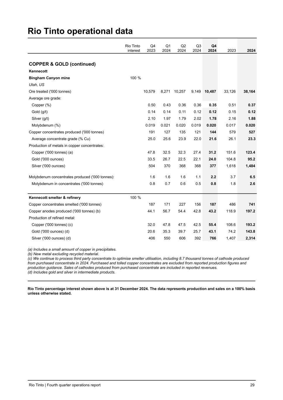 Rio Tinto operational data Rio Tinto interest Q4 2023 Q1 2024 Q2 2024 Q3 2024 Q4 2024 2023 2024 COPPER & GOLD (continued) Kennecott Bingham Canyon mine 100 % Utah, US Ore treated ('000 tonnes) 10,579 8,271 10,257 9,149 10,487 33,126 38,164 Average ore grade: Copper (%) 0.50 0.43 0.36 0.36 0.35 0.51 0.37 Gold (g/t) 0.14 0.14 0.11 0.12 0.12 0.15 0.12 Silver (g/t) 2.10 1.97 1.79 2.02 1.78 2.16 1.88 Molybdenum (%) 0.019 0.021 0.020 0.019 0.020 0.017 0.020 Copper concentrates produced ('000 tonnes) 191 127 135 121 144 579 527 Average concentrate grade (% Cu) 25.0 25.6 23.9 22.0 21.6 26.1 23.3 Production of metals in copper concentrates: Copper ('000 tonnes) (a) 47.8 32.5 32.3 27.4 31.2 151.6 123.4 Gold ('000 ounces) 33.5 26.7 22.5 22.1 24.0 104.8 95.2 Silver ('000 ounces) 504 370 368 368 377 1,618 1,484 Molybdenum concentrates produced ('000 tonnes): 1.6 1.6 1.6 1.1 2.2 3.7 6.5 Molybdenum in concentrates ('000 tonnes) 0.8 0.7 0.6 0.5 0.8 1.8 2.6 Kennecott smelter & refinery 100 % Copper concentrates smelted ('000 tonnes) 187 171 227 156 187 486 741 Copper anodes produced ('000 tonnes) (b) 44.1 56.7 54.4 42.8 43.2 118.9 197.2 Production of refined metal: Copper ('000 tonnes) (c) 32.0 47.8 47.5 42.5 55.4 108.6 193.2 Gold ('000 ounces) (d) 20.6 35.3 39.7 25.7 43.1 74.2 143.8 Silver ('000 ounces) (d) 406 550 606 392 766 1,407 2,314 (a) Includes a small amount of copper in precipitates. (b) New metal excluding recycled material. (c) We continue to process third party concentrate to optimise smelter utilisation, including 8.7 thousand tonnes of cathode produced from purchased concentrate in 2024. Purchased and tolled copper concentrates are excluded from reported production figures and production guidance. Sales of cathodes produced from purchased concentrate are included in reported revenues. (d) Includes gold and silver in intermediate products. Rio Tinto percentage interest shown above is at 31 December 2024. The data represents production and sales on a 100% basis unless otherwise stated. Rio Tinto | Fourth quarter operations report 29