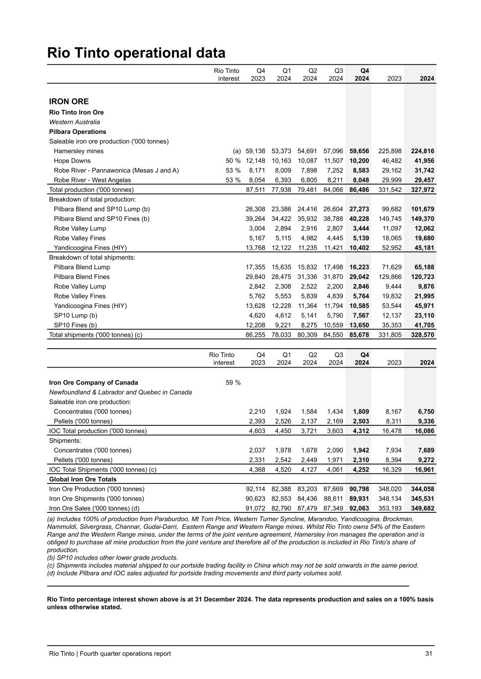 Rio Tinto operational data Rio Tinto interest Q4 2023 Q1 2024 Q2 2024 Q3 2024 Q4 2024 2023 2024 IRON ORE Rio Tinto Iron Ore Western Australia Pilbara Operations Saleable iron ore production ('000 tonnes) Hamersley mines (a) 59,138 53,373 54,691 57,096 59,656 225,898 224,816 Hope Downs 50 % 12,148 10,163 10,087 11,507 10,200 46,482 41,956 Robe River - Pannawonica (Mesas J and A) 53 % 8,171 8,009 7,898 7,252 8,583 29,162 31,742 Robe River - West Angelas 53 % 8,054 6,393 6,805 8,211 8,048 29,999 29,457 Total production ('000 tonnes) 87,511 77,938 79,481 84,066 86,486 331,542 327,972 Breakdown of total production: Pilbara Blend and SP10 Lump (b) 26,308 23,386 24,416 26,604 27,273 99,682 101,679 Pilbara Blend and SP10 Fines (b) 39,264 34,422 35,932 38,788 40,228 149,745 149,370 Robe Valley Lump 3,004 2,894 2,916 2,807 3,444 11,097 12,062 Robe Valley Fines 5,167 5,115 4,982 4,445 5,139 18,065 19,680 Yandicoogina Fines (HIY) 13,768 12,122 11,235 11,421 10,402 52,952 45,181 Breakdown of total shipments: Pilbara Blend Lump 17,355 15,635 15,832 17,498 16,223 71,629 65,188 Pilbara Blend Fines 29,840 28,475 31,336 31,870 29,042 129,866 120,723 Robe Valley Lump 2,842 2,308 2,522 2,200 2,846 9,444 9,876 Robe Valley Fines 5,762 5,553 5,839 4,839 5,764 19,832 21,995 Yandicoogina Fines (HIY) 13,628 12,228 11,364 11,794 10,585 53,544 45,971 SP10 Lump (b) 4,620 4,612 5,141 5,790 7,567 12,137 23,110 SP10 Fines (b) 12,208 9,221 8,275 10,559 13,650 35,353 41,705 Total shipments ('000 tonnes) (c) 86,255 78,033 80,309 84,550 85,678 331,805 328,570 Rio Tinto interest Q4 2023 Q1 2024 Q2 2024 Q3 2024 Q4 2024 2023 2024 Iron Ore Company of Canada 59 % Newfoundland & Labrador and Quebec in Canada Saleable iron ore production: Concentrates ('000 tonnes) 2,210 1,924 1,584 1,434 1,809 8,167 6,750 Pellets ('000 tonnes) 2,393 2,526 2,137 2,169 2,503 8,311 9,336 IOC Total production ('000 tonnes) 4,603 4,450 3,721 3,603 4,312 16,478 16,086 Shipments: Concentrates ('000 tonnes) 2,037 1,978 1,678 2,090 1,942 7,934 7,689 Pellets ('000 tonnes) 2,331 2,542 2,449 1,971 2,310 8,394 9,272 IOC Total Shipments ('000 tonnes) (c) 4,368 4,520 4,127 4,061 4,252 16,329 16,961 Global Iron Ore Totals Iron Ore Production ('000 tonnes) 92,114 82,388 83,203 87,669 90,798 348,020 344,058 Iron Ore Shipments ('000 tonnes) 90,623 82,553 84,436 88,611 89,931 348,134 345,531 Iron Ore Sales ('000 tonnes) (d) 91,072 82,790 87,479 87,349 92,063 353,193 349,682 (a) Includes 100% of production from Paraburdoo, Mt Tom Price, Western Turner Syncline, Marandoo, Yandicoogina, Brockman, Nammuldi, Silvergrass, Channar, Gudai-Darri, Eastern Range and Western Range mines. Whilst Rio Tinto owns 54% of the Eastern Range and the Western Range mines, under the terms of the joint venture agreement, Hamersley Iron manages the operation and is obliged to purchase all mine production from the joint venture and therefore all of the production is included in Rio Tinto's share of production. (b) SP10 includes other lower grade products. (c) Shipments includes material shipped to our portside trading facility in China which may not be sold onwards in the same period. (d) Include Pilbara and IOC sales adjusted for portside trading movements and third party volumes sold. Rio Tinto percentage interest shown above is at 31 December 2024. The data represents production and sales on a 100% basis unless otherwise stated. Rio Tinto | Fourth quarter operations report 31