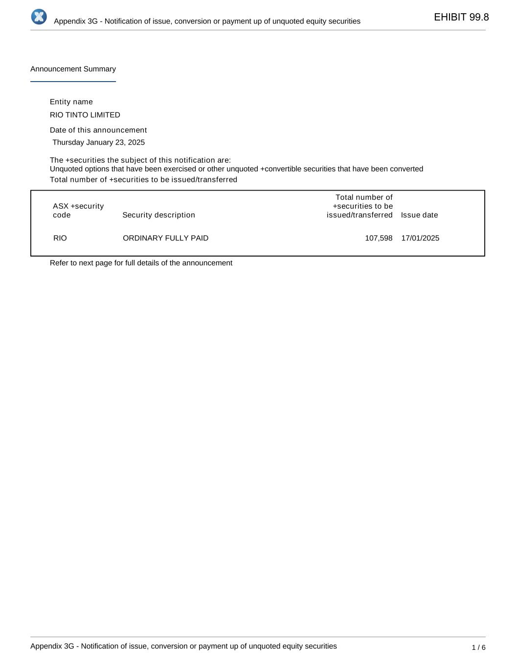 Appendix 3G - Notification of issue, conversion or payment up of unquoted equity securities Appendix 3G - Notification of issue, conversion or payment up of unquoted equity securities 1 / 6 Announcement Summary Entity name RIO TINTO LIMITED Date of this announcement Thursday January 23, 2025 The +securities the subject of this notification are: Total number of +securities to be issued/transferred ASX +security code Security description Total number of +securities to be issued/transferred Issue date RIO ORDINARY FULLY PAID 107,598 17/01/2025 Refer to next page for full details of the announcement Unquoted options that have been exercised or other unquoted +convertible securities that have been converted EHIBIT 99.8