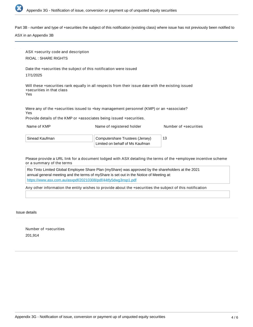 Appendix 3G - Notification of issue, conversion or payment up of unquoted equity securities Appendix 3G - Notification of issue, conversion or payment up of unquoted equity securities 4 / 6 Part 3B - number and type of +securities the subject of this notification (existing class) where issue has not previously been notified to ASX in an Appendix 3B ASX +security code and description RIOAL : SHARE RIGHTS Date the +securities the subject of this notification were issued 17/1/2025 Will these +securities rank equally in all respects from their issue date with the existing issued +securities in that class Were any of the +securities issued to +key management personnel (KMP) or an +associate? Provide details of the KMP or +associates being issued +securities. Name of KMP Name of registered holder Number of +securities Sinead Kaufman Computershare Trustees (Jersey) Limited on behalf of Ms Kaufman 13 Please provide a URL link for a document lodged with ASX detailing the terms of the +employee incentive scheme or a summary of the terms Rio Tinto Limited Global Employee Share Plan (myShare) was approved by the shareholders at the 2021 annual general meeting and the terms of myShare is set out in the Notice of Meeting at: https://www.asx.com.au/asxpdf/20210308/pdf/44tfy5dwg3nsp1.pdf Any other information the entity wishes to provide about the +securities the subject of this notification Issue details Number of +securities 201,914 Yes Yes