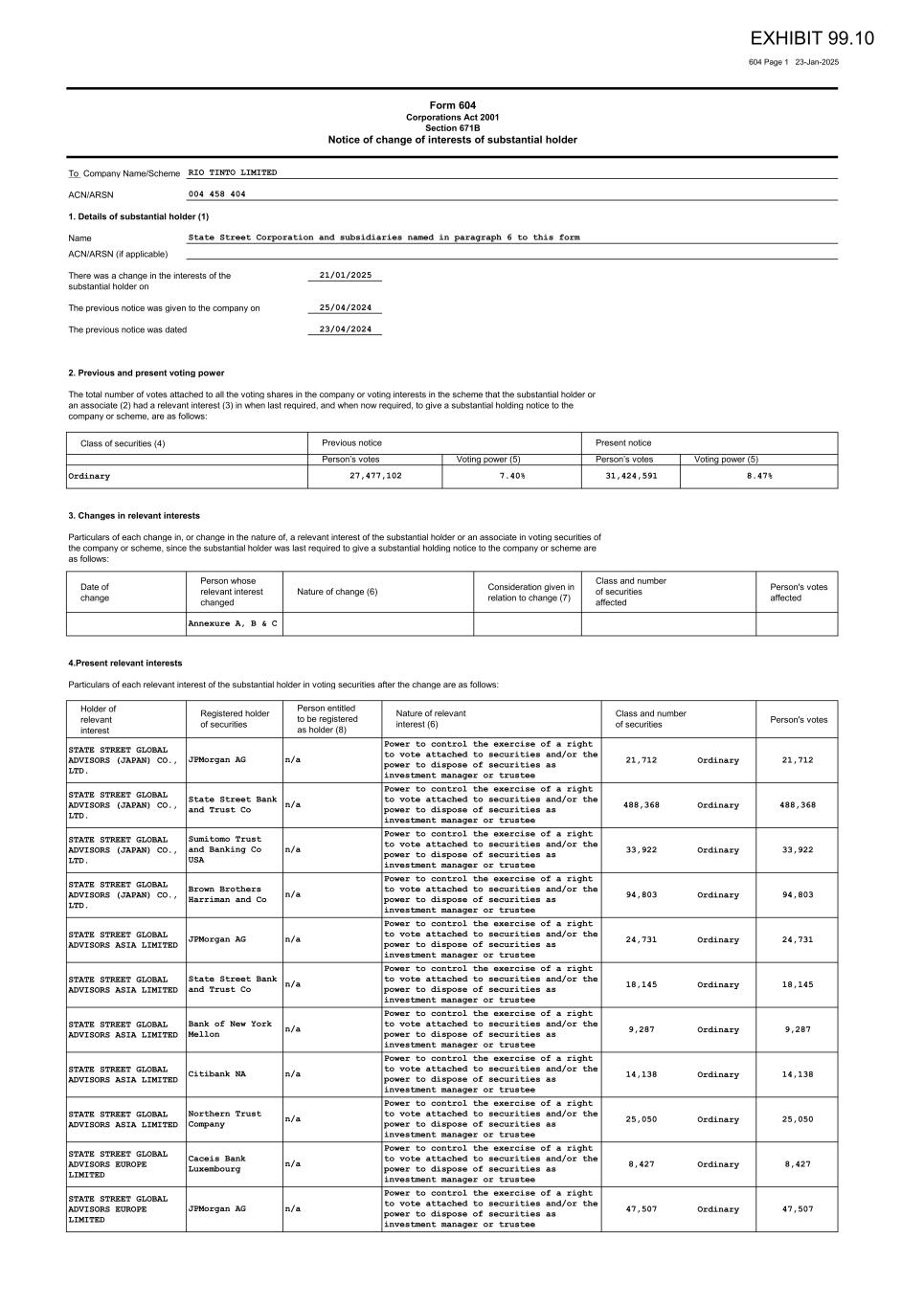 604 Page 1 23-Jan-2025 To Company Name/Scheme ACN/ARSN 1. Details of substantial holder (1) Name ACN/ARSN (if applicable) There was a change in the interests of the 21/01/2025 substantial holder on The previous notice was given to the company on 25/04/2024 The previous notice was dated 23/04/2024 2. Previous and present voting power The total number of votes attached to all the voting shares in the company or voting interests in the scheme that the substantial holder or an associate (2) had a relevant interest (3) in when last required, and when now required, to give a substantial holding notice to the company or scheme, are as follows: Class of securities (4) 3. Changes in relevant interests Particulars of each change in, or change in the nature of, a relevant interest of the substantial holder or an associate in voting securities of the company or scheme, since the substantial holder was last required to give a substantial holding notice to the company or scheme are as follows: Date of change Consideration given in relation to change (7) Person's votes affected 4.Present relevant interests Particulars of each relevant interest of the substantial holder in voting securities after the change are as follows: Holder of relevant interest Person's votes STATE STREET GLOBAL ADVISORS (JAPAN) CO., LTD. 21,712 Ordinary 21,712 STATE STREET GLOBAL ADVISORS (JAPAN) CO., LTD. 488,368 Ordinary 488,368 STATE STREET GLOBAL ADVISORS (JAPAN) CO., LTD. 33,922 Ordinary 33,922 STATE STREET GLOBAL ADVISORS (JAPAN) CO., LTD. 94,803 Ordinary 94,803 STATE STREET GLOBAL ADVISORS ASIA LIMITED 24,731 Ordinary 24,731 STATE STREET GLOBAL ADVISORS ASIA LIMITED 18,145 Ordinary 18,145 STATE STREET GLOBAL ADVISORS ASIA LIMITED 9,287 Ordinary 9,287 STATE STREET GLOBAL ADVISORS ASIA LIMITED 14,138 Ordinary 14,138 STATE STREET GLOBAL ADVISORS ASIA LIMITED 25,050 Ordinary 25,050 STATE STREET GLOBAL ADVISORS EUROPE LIMITED 8,427 Ordinary 8,427 STATE STREET GLOBAL ADVISORS EUROPE LIMITED 47,507 Ordinary 47,507 27,477,102 Nature of relevant interest (6) Power to control the exercise of a right to vote attached to securities and/or the power to dispose of securities as investment manager or trustee Annexure A, B & C Person entitled to be registered as holder (8) RIO TINTO LIMITED n/a n/a Power to control the exercise of a right to vote attached to securities and/or the power to dispose of securities as investment manager or trustee Form 604 Power to control the exercise of a right to vote attached to securities and/or the power to dispose of securities as investment manager or trustee Ordinary Registered holder of securities JPMorgan AG n/a JPMorgan AG Power to control the exercise of a right to vote attached to securities and/or the power to dispose of securities as investment manager or trustee n/a Brown Brothers Harriman and Co State Street Bank and Trust Co Caceis Bank Luxembourg n/a Power to control the exercise of a right to vote attached to securities and/or the power to dispose of securities as investment manager or trustee n/a n/a Power to control the exercise of a right to vote attached to securities and/or the power to dispose of securities as investment manager or trustee Corporations Act 2001 Voting power (5) Power to control the exercise of a right to vote attached to securities and/or the power to dispose of securities as investment manager or trustee JPMorgan AG Bank of New York Mellon Section 671B Previous notice Power to control the exercise of a right to vote attached to securities and/or the power to dispose of securities as investment manager or trustee Voting power (5) Person’s votes State Street Corporation and subsidiaries named in paragraph 6 to this form Present notice Class and number of securities affected 31,424,591 Class and number of securities 8.47% n/a State Street Bank and Trust Co n/a Power to control the exercise of a right to vote attached to securities and/or the power to dispose of securities as investment manager or trustee Notice of change of interests of substantial holder Person’s votes Power to control the exercise of a right to vote attached to securities and/or the power to dispose of securities as investment manager or trustee 004 458 404 Nature of change (6) Person whose relevant interest changed Sumitomo Trust and Banking Co USA 7.40% Power to control the exercise of a right to vote attached to securities and/or the power to dispose of securities as investment manager or trustee Citibank NA n/a Northern Trust Company n/a EXHIBIT 99.10