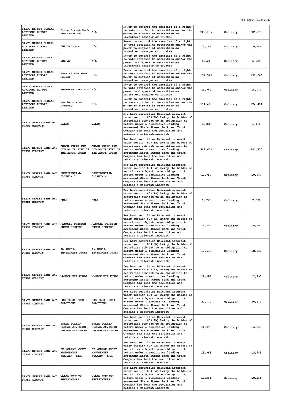 604 Page 3 23-Jan-2025 STATE STREET BANK AND TRUST COMPANY 10,276 Ordinary 10,276 STATE STREET BANK AND TRUST COMPANY 10,041 Ordinary 10,041 STATE STREET BANK AND TRUST COMPANY 2,737 Ordinary 2,737 STATE STREET BANK AND TRUST COMPANY 108,131 Ordinary 108,131 STATE STREET BANK AND TRUST COMPANY 5,926 Ordinary 5,926 STATE STREET BANK AND TRUST COMPANY 13,517 Ordinary 13,517 STATE STREET BANK AND TRUST COMPANY 3,666 Ordinary 3,666 STATE STREET BANK AND TRUST COMPANY 13,946 Ordinary 13,946 STATE STREET BANK AND TRUST COMPANY 8,840 Ordinary 8,840 STATE STREET BANK AND TRUST COMPANY 536,256 Ordinary 536,256 STATE STREET BANK AND TRUST COMPANY 96,444 Ordinary 96,444 STATE STREET BANK AND TRUST COMPANY 1,896 Ordinary 1,896 STATE STREET BANK AND TRUST COMPANY 3,754 Ordinary 3,754 STATE STREET BANK AND TRUST COMPANY 34,363 Ordinary 34,363 STATE STREET BANK AND TRUST COMPANY 142,871 Ordinary 142,871 STATE STREET BANK AND TRUST COMPANY 82,799 Ordinary 82,799 TEACHER RETIREMENT SYSTEM OF TEXAS RETIREMENT SYSTEMS OF ALABAMA LOS ANGELES COUNTY EMPLOYEES RETIREMENT ASSOCIATION CONFIDENTIAL CLIENT ASIA A For Lent securities:Relevant interest under section 608(8A) being the holder of securities subject to an obligation to return under a securities lending agreement.State Street Bank and Trust Company has lent the securities and retains a relevant interest GMO BENCHMARK FREE FUND STATE STREET BANK AND TRUST COMPANY SSGA FUNDS For Lent securities:Relevant interest under section 608(8A) being the holder of securities subject to an obligation to return under a securities lending agreement.State Street Bank and Trust Company has lent the securities and retains a relevant interest For memo pledge securities:Relevant interest under section 608(8) being the right, as lender, to dispose of shares pledged to secure a securities loan SSGA FUNDS ALBERTA INVESTMENT MANAGEMENT - ALBERTA FINANCE For memo pledge securities:Relevant interest under section 608(8) being the right, as lender, to dispose of shares pledged to secure a securities loan ALBERTA INVESTMENT MANAGEMENT - ALBERTA FINANCE STATE STREET BANK AND TRUST COMPANY For Lent securities:Relevant interest under section 608(8A) being the holder of securities subject to an obligation to return under a securities lending agreement.State Street Bank and Trust Company has lent the securities and retains a relevant interest For memo pledge securities:Relevant interest under section 608(8) being the right, as lender, to dispose of shares pledged to secure a securities loan For Lent securities:Relevant interest under section 608(8A) being the holder of securities subject to an obligation to return under a securities lending agreement.State Street Bank and Trust Company has lent the securities and retains a relevant interest CONFIDENTIAL CLIENT ASIA A SSGA SPDR ETFS EUROPE I PLC For Lent securities:Relevant interest under section 608(8A) being the holder of securities subject to an obligation to return under a securities lending agreement.State Street Bank and Trust Company has lent the securities and retains a relevant interest SSGA SPDR ETFS EUROPE I PLC For Lent securities:Relevant interest under section 608(8A) being the holder of securities subject to an obligation to return under a securities lending agreement.State Street Bank and Trust Company has lent the securities and retains a relevant interest GMO IMPLEMENTATION FUND GENERAL CONFERENCE OF SEVENTH DAY ADVENTIST For Lent securities:Relevant interest under section 608(8A) being the holder of securities subject to an obligation to return under a securities lending agreement.State Street Bank and Trust Company has lent the securities and retains a relevant interest LOS ANGELES COUNTY EMPLOYEES RETIREMENT ASSOCIATION CALVERT For borrowed securities:Relevant interest under section 608(1) being the holder of securities subject to an obligation to return under a securities lending agreement.STATE STREET BANK AND TRUST COMPANY has on-lent the securities and retains a relevant interest UNKNOWN GENERAL CONFERENCE OF SEVENTH DAY ADVENTIST CALVERT SSGA SPDR ETFS EUROPE II PLC For Lent securities:Relevant interest under section 608(8A) being the holder of securities subject to an obligation to return under a securities lending agreement.State Street Bank and Trust Company has lent the securities and retains a relevant interest STATE STREET GLOBAL ADVISORS FUNDS MANAGEMENT LIMITED For Lent securities:Relevant interest under section 608(8A) being the holder of securities subject to an obligation to return under a securities lending agreement.State Street Bank and Trust Company has lent the securities and retains a relevant interest For Lent securities:Relevant interest under section 608(8A) being the holder of securities subject to an obligation to return under a securities lending agreement.State Street Bank and Trust Company has lent the securities and retains a relevant interest RETIREMENT SYSTEMS OF ALABAMA For Lent securities:Relevant interest under section 608(8A) being the holder of securities subject to an obligation to return under a securities lending agreement.State Street Bank and Trust Company has lent the securities and retains a relevant interest M FUND, INC. M FUND, INC. STATE STREET GLOBAL ADVISORS FUNDS MANAGEMENT LIMITED CONFIDENTIAL CLIENT KK STATE STREET BANK AND TRUST COMPANY STATE STREET BANK AND TRUST COMPANY CONFIDENTIAL CLIENT KK For Lent securities:Relevant interest under section 608(8A) being the holder of securities subject to an obligation to return under a securities lending agreement.State Street Bank and Trust Company has lent the securities and retains a relevant interest SSGA SPDR ETFS EUROPE II PLC