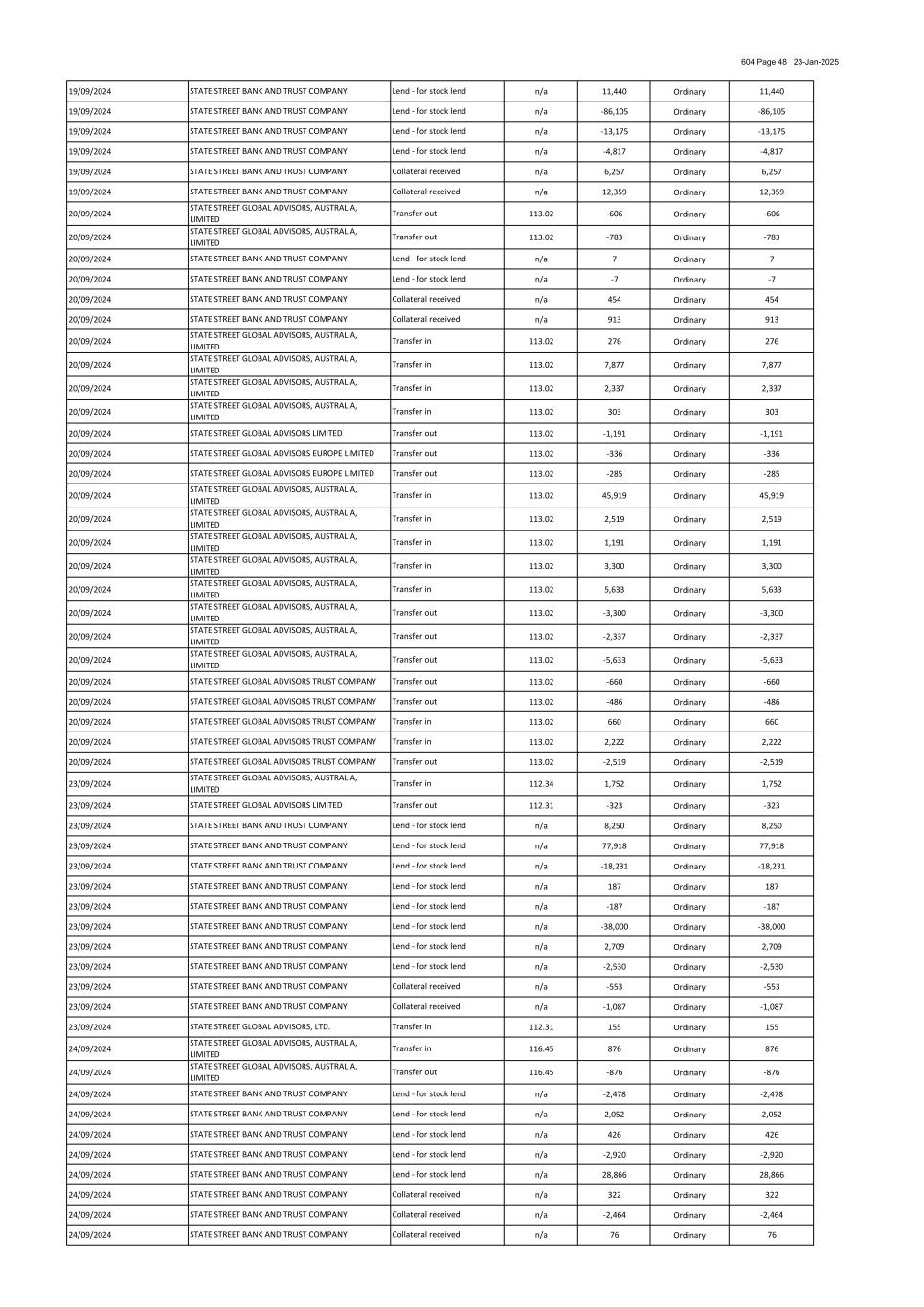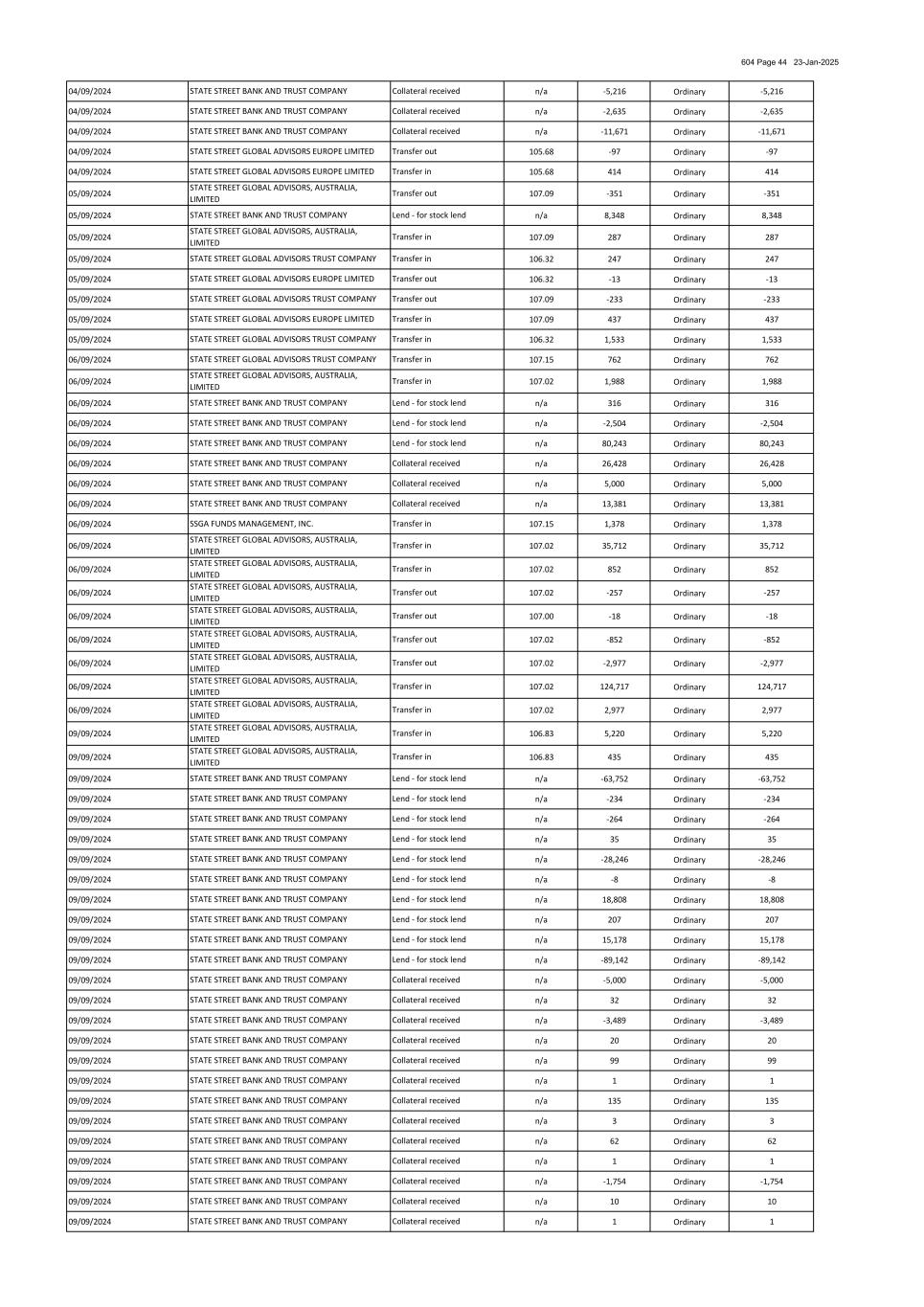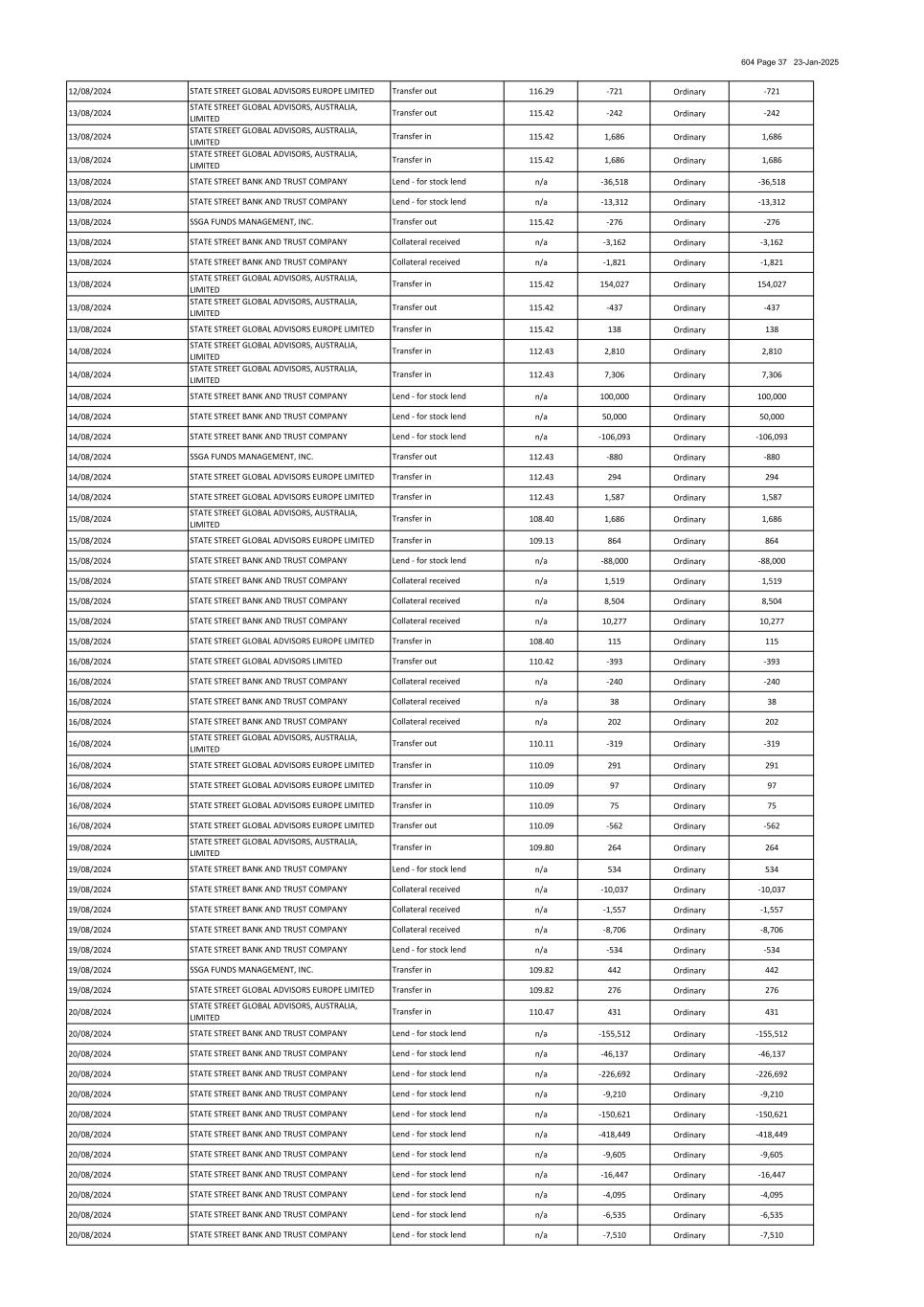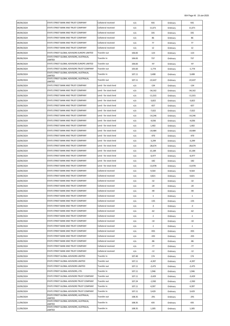 604 Page 44 23-Jan-2025 04/09/2024 n/a -5,216 Ordinary -5,216 04/09/2024 n/a -2,635 Ordinary -2,635 04/09/2024 n/a -11,671 Ordinary -11,671 04/09/2024 105.68 -97 Ordinary -97 04/09/2024 105.68 414 Ordinary 414 05/09/2024 107.09 -351 Ordinary -351 05/09/2024 n/a 8,348 Ordinary 8,348 05/09/2024 107.09 287 Ordinary 287 05/09/2024 106.32 247 Ordinary 247 05/09/2024 106.32 -13 Ordinary -13 05/09/2024 107.09 -233 Ordinary -233 05/09/2024 107.09 437 Ordinary 437 05/09/2024 106.32 1,533 Ordinary 1,533 06/09/2024 107.15 762 Ordinary 762 06/09/2024 107.02 1,988 Ordinary 1,988 06/09/2024 n/a 316 Ordinary 316 06/09/2024 n/a -2,504 Ordinary -2,504 06/09/2024 n/a 80,243 Ordinary 80,243 06/09/2024 n/a 26,428 Ordinary 26,428 06/09/2024 n/a 5,000 Ordinary 5,000 06/09/2024 n/a 13,381 Ordinary 13,381 06/09/2024 107.15 1,378 Ordinary 1,378 06/09/2024 107.02 35,712 Ordinary 35,712 06/09/2024 107.02 852 Ordinary 852 06/09/2024 107.02 -257 Ordinary -257 06/09/2024 107.00 -18 Ordinary -18 06/09/2024 107.02 -852 Ordinary -852 06/09/2024 107.02 -2,977 Ordinary -2,977 06/09/2024 107.02 124,717 Ordinary 124,717 06/09/2024 107.02 2,977 Ordinary 2,977 09/09/2024 106.83 5,220 Ordinary 5,220 09/09/2024 106.83 435 Ordinary 435 09/09/2024 n/a -63,752 Ordinary -63,752 09/09/2024 n/a -234 Ordinary -234 09/09/2024 n/a -264 Ordinary -264 09/09/2024 n/a 35 Ordinary 35 09/09/2024 n/a -28,246 Ordinary -28,246 09/09/2024 n/a -8 Ordinary -8 09/09/2024 n/a 18,808 Ordinary 18,808 09/09/2024 n/a 207 Ordinary 207 09/09/2024 n/a 15,178 Ordinary 15,178 09/09/2024 n/a -89,142 Ordinary -89,142 09/09/2024 n/a -5,000 Ordinary -5,000 09/09/2024 n/a 32 Ordinary 32 09/09/2024 n/a -3,489 Ordinary -3,489 09/09/2024 n/a 20 Ordinary 20 09/09/2024 n/a 99 Ordinary 99 09/09/2024 n/a 1 Ordinary 1 09/09/2024 n/a 135 Ordinary 135 09/09/2024 n/a 3 Ordinary 3 09/09/2024 n/a 62 Ordinary 62 09/09/2024 n/a 1 Ordinary 1 09/09/2024 n/a -1,754 Ordinary -1,754 09/09/2024 n/a 10 Ordinary 10 09/09/2024 n/a 1 Ordinary 1 Collateral received STATE STREET BANK AND TRUST COMPANY Lend - for stock lend Transfer in STATE STREET BANK AND TRUST COMPANY Transfer in STATE STREET GLOBAL ADVISORS, AUSTRALIA, LIMITED STATE STREET GLOBAL ADVISORS EUROPE LIMITED STATE STREET BANK AND TRUST COMPANY STATE STREET BANK AND TRUST COMPANY Collateral received STATE STREET GLOBAL ADVISORS, AUSTRALIA, LIMITED Collateral received Lend - for stock lend Collateral received STATE STREET BANK AND TRUST COMPANY STATE STREET BANK AND TRUST COMPANY Lend - for stock lend STATE STREET GLOBAL ADVISORS, AUSTRALIA, LIMITED Transfer in STATE STREET GLOBAL ADVISORS TRUST COMPANY Transfer in Collateral received Collateral received STATE STREET BANK AND TRUST COMPANY STATE STREET BANK AND TRUST COMPANY Transfer out STATE STREET BANK AND TRUST COMPANY STATE STREET BANK AND TRUST COMPANY Collateral received Transfer out STATE STREET GLOBAL ADVISORS, AUSTRALIA, LIMITED STATE STREET GLOBAL ADVISORS, AUSTRALIA, LIMITED Transfer out STATE STREET BANK AND TRUST COMPANY Transfer in STATE STREET BANK AND TRUST COMPANY Lend - for stock lend STATE STREET BANK AND TRUST COMPANY STATE STREET GLOBAL ADVISORS, AUSTRALIA, LIMITED Collateral received STATE STREET BANK AND TRUST COMPANY Transfer in Lend - for stock lend STATE STREET GLOBAL ADVISORS TRUST COMPANY Transfer out STATE STREET GLOBAL ADVISORS, AUSTRALIA, LIMITED Collateral received STATE STREET BANK AND TRUST COMPANY STATE STREET BANK AND TRUST COMPANY Collateral received Transfer out STATE STREET BANK AND TRUST COMPANY Collateral received STATE STREET GLOBAL ADVISORS TRUST COMPANY Transfer in STATE STREET GLOBAL ADVISORS EUROPE LIMITED Transfer in STATE STREET BANK AND TRUST COMPANY Transfer out STATE STREET BANK AND TRUST COMPANY STATE STREET BANK AND TRUST COMPANY Collateral received Lend - for stock lend STATE STREET GLOBAL ADVISORS, AUSTRALIA, LIMITED Transfer in STATE STREET GLOBAL ADVISORS, AUSTRALIA, LIMITED Collateral received STATE STREET BANK AND TRUST COMPANY Lend - for stock lend Transfer out STATE STREET GLOBAL ADVISORS, AUSTRALIA, LIMITED Collateral received STATE STREET BANK AND TRUST COMPANY Lend - for stock lend STATE STREET BANK AND TRUST COMPANY Lend - for stock lend Collateral received STATE STREET GLOBAL ADVISORS EUROPE LIMITED Transfer out STATE STREET GLOBAL ADVISORS, AUSTRALIA, LIMITED STATE STREET BANK AND TRUST COMPANY Transfer in STATE STREET GLOBAL ADVISORS TRUST COMPANY Collateral received STATE STREET BANK AND TRUST COMPANY Collateral received SSGA FUNDS MANAGEMENT, INC. Lend - for stock lend Transfer in STATE STREET BANK AND TRUST COMPANY STATE STREET BANK AND TRUST COMPANY Transfer in Lend - for stock lend STATE STREET BANK AND TRUST COMPANY Transfer in STATE STREET GLOBAL ADVISORS EUROPE LIMITED Collateral received STATE STREET BANK AND TRUST COMPANY Lend - for stock lend STATE STREET BANK AND TRUST COMPANY Transfer in STATE STREET GLOBAL ADVISORS, AUSTRALIA, LIMITED STATE STREET GLOBAL ADVISORS, AUSTRALIA, LIMITED STATE STREET BANK AND TRUST COMPANY STATE STREET BANK AND TRUST COMPANY Lend - for stock lend STATE STREET BANK AND TRUST COMPANY Collateral received Lend - for stock lend