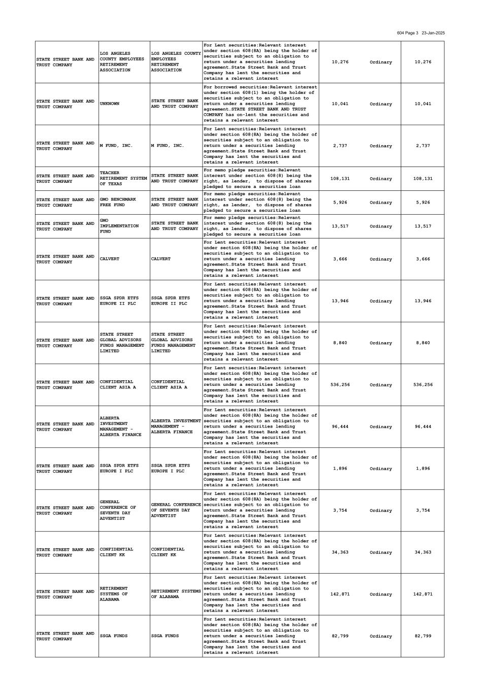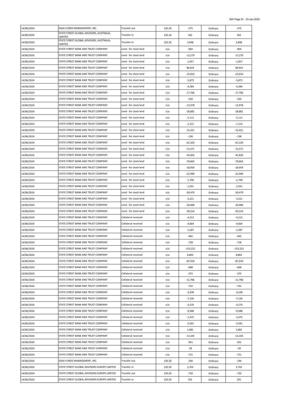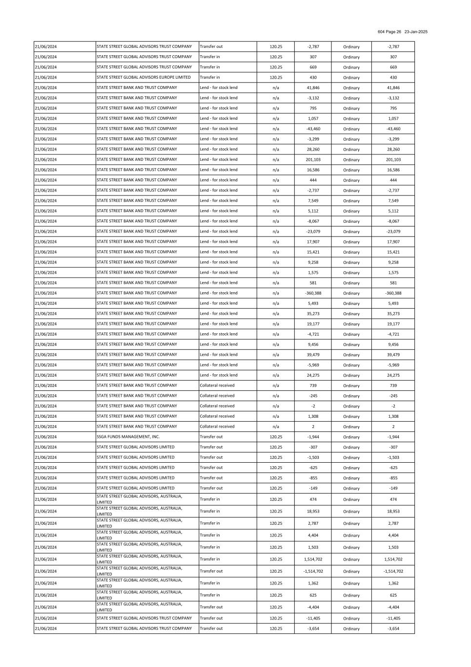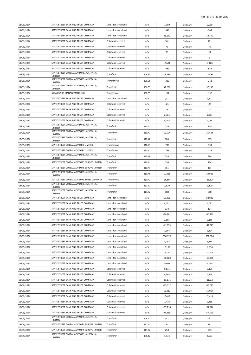 604 Page 44 23-Jan-2025 04/09/2024 n/a -5,216 Ordinary -5,216 04/09/2024 n/a -2,635 Ordinary -2,635 04/09/2024 n/a -11,671 Ordinary -11,671 04/09/2024 105.68 -97 Ordinary -97 04/09/2024 105.68 414 Ordinary 414 05/09/2024 107.09 -351 Ordinary -351 05/09/2024 n/a 8,348 Ordinary 8,348 05/09/2024 107.09 287 Ordinary 287 05/09/2024 106.32 247 Ordinary 247 05/09/2024 106.32 -13 Ordinary -13 05/09/2024 107.09 -233 Ordinary -233 05/09/2024 107.09 437 Ordinary 437 05/09/2024 106.32 1,533 Ordinary 1,533 06/09/2024 107.15 762 Ordinary 762 06/09/2024 107.02 1,988 Ordinary 1,988 06/09/2024 n/a 316 Ordinary 316 06/09/2024 n/a -2,504 Ordinary -2,504 06/09/2024 n/a 80,243 Ordinary 80,243 06/09/2024 n/a 26,428 Ordinary 26,428 06/09/2024 n/a 5,000 Ordinary 5,000 06/09/2024 n/a 13,381 Ordinary 13,381 06/09/2024 107.15 1,378 Ordinary 1,378 06/09/2024 107.02 35,712 Ordinary 35,712 06/09/2024 107.02 852 Ordinary 852 06/09/2024 107.02 -257 Ordinary -257 06/09/2024 107.00 -18 Ordinary -18 06/09/2024 107.02 -852 Ordinary -852 06/09/2024 107.02 -2,977 Ordinary -2,977 06/09/2024 107.02 124,717 Ordinary 124,717 06/09/2024 107.02 2,977 Ordinary 2,977 09/09/2024 106.83 5,220 Ordinary 5,220 09/09/2024 106.83 435 Ordinary 435 09/09/2024 n/a -63,752 Ordinary -63,752 09/09/2024 n/a -234 Ordinary -234 09/09/2024 n/a -264 Ordinary -264 09/09/2024 n/a 35 Ordinary 35 09/09/2024 n/a -28,246 Ordinary -28,246 09/09/2024 n/a -8 Ordinary -8 09/09/2024 n/a 18,808 Ordinary 18,808 09/09/2024 n/a 207 Ordinary 207 09/09/2024 n/a 15,178 Ordinary 15,178 09/09/2024 n/a -89,142 Ordinary -89,142 09/09/2024 n/a -5,000 Ordinary -5,000 09/09/2024 n/a 32 Ordinary 32 09/09/2024 n/a -3,489 Ordinary -3,489 09/09/2024 n/a 20 Ordinary 20 09/09/2024 n/a 99 Ordinary 99 09/09/2024 n/a 1 Ordinary 1 09/09/2024 n/a 135 Ordinary 135 09/09/2024 n/a 3 Ordinary 3 09/09/2024 n/a 62 Ordinary 62 09/09/2024 n/a 1 Ordinary 1 09/09/2024 n/a -1,754 Ordinary -1,754 09/09/2024 n/a 10 Ordinary 10 09/09/2024 n/a 1 Ordinary 1 Collateral received STATE STREET BANK AND TRUST COMPANY Lend - for stock lend Transfer in STATE STREET BANK AND TRUST COMPANY Transfer in STATE STREET GLOBAL ADVISORS, AUSTRALIA, LIMITED STATE STREET GLOBAL ADVISORS EUROPE LIMITED STATE STREET BANK AND TRUST COMPANY STATE STREET BANK AND TRUST COMPANY Collateral received STATE STREET GLOBAL ADVISORS, AUSTRALIA, LIMITED Collateral received Lend - for stock lend Collateral received STATE STREET BANK AND TRUST COMPANY STATE STREET BANK AND TRUST COMPANY Lend - for stock lend STATE STREET GLOBAL ADVISORS, AUSTRALIA, LIMITED Transfer in STATE STREET GLOBAL ADVISORS TRUST COMPANY Transfer in Collateral received Collateral received STATE STREET BANK AND TRUST COMPANY STATE STREET BANK AND TRUST COMPANY Transfer out STATE STREET BANK AND TRUST COMPANY STATE STREET BANK AND TRUST COMPANY Collateral received Transfer out STATE STREET GLOBAL ADVISORS, AUSTRALIA, LIMITED STATE STREET GLOBAL ADVISORS, AUSTRALIA, LIMITED Transfer out STATE STREET BANK AND TRUST COMPANY Transfer in STATE STREET BANK AND TRUST COMPANY Lend - for stock lend STATE STREET BANK AND TRUST COMPANY STATE STREET GLOBAL ADVISORS, AUSTRALIA, LIMITED Collateral received STATE STREET BANK AND TRUST COMPANY Transfer in Lend - for stock lend STATE STREET GLOBAL ADVISORS TRUST COMPANY Transfer out STATE STREET GLOBAL ADVISORS, AUSTRALIA, LIMITED Collateral received STATE STREET BANK AND TRUST COMPANY STATE STREET BANK AND TRUST COMPANY Collateral received Transfer out STATE STREET BANK AND TRUST COMPANY Collateral received STATE STREET GLOBAL ADVISORS TRUST COMPANY Transfer in STATE STREET GLOBAL ADVISORS EUROPE LIMITED Transfer in STATE STREET BANK AND TRUST COMPANY Transfer out STATE STREET BANK AND TRUST COMPANY STATE STREET BANK AND TRUST COMPANY Collateral received Lend - for stock lend STATE STREET GLOBAL ADVISORS, AUSTRALIA, LIMITED Transfer in STATE STREET GLOBAL ADVISORS, AUSTRALIA, LIMITED Collateral received STATE STREET BANK AND TRUST COMPANY Lend - for stock lend Transfer out STATE STREET GLOBAL ADVISORS, AUSTRALIA, LIMITED Collateral received STATE STREET BANK AND TRUST COMPANY Lend - for stock lend STATE STREET BANK AND TRUST COMPANY Lend - for stock lend Collateral received STATE STREET GLOBAL ADVISORS EUROPE LIMITED Transfer out STATE STREET GLOBAL ADVISORS, AUSTRALIA, LIMITED STATE STREET BANK AND TRUST COMPANY Transfer in STATE STREET GLOBAL ADVISORS TRUST COMPANY Collateral received STATE STREET BANK AND TRUST COMPANY Collateral received SSGA FUNDS MANAGEMENT, INC. Lend - for stock lend Transfer in STATE STREET BANK AND TRUST COMPANY STATE STREET BANK AND TRUST COMPANY Transfer in Lend - for stock lend STATE STREET BANK AND TRUST COMPANY Transfer in STATE STREET GLOBAL ADVISORS EUROPE LIMITED Collateral received STATE STREET BANK AND TRUST COMPANY Lend - for stock lend STATE STREET BANK AND TRUST COMPANY Transfer in STATE STREET GLOBAL ADVISORS, AUSTRALIA, LIMITED STATE STREET GLOBAL ADVISORS, AUSTRALIA, LIMITED STATE STREET BANK AND TRUST COMPANY STATE STREET BANK AND TRUST COMPANY Lend - for stock lend STATE STREET BANK AND TRUST COMPANY Collateral received Lend - for stock lend