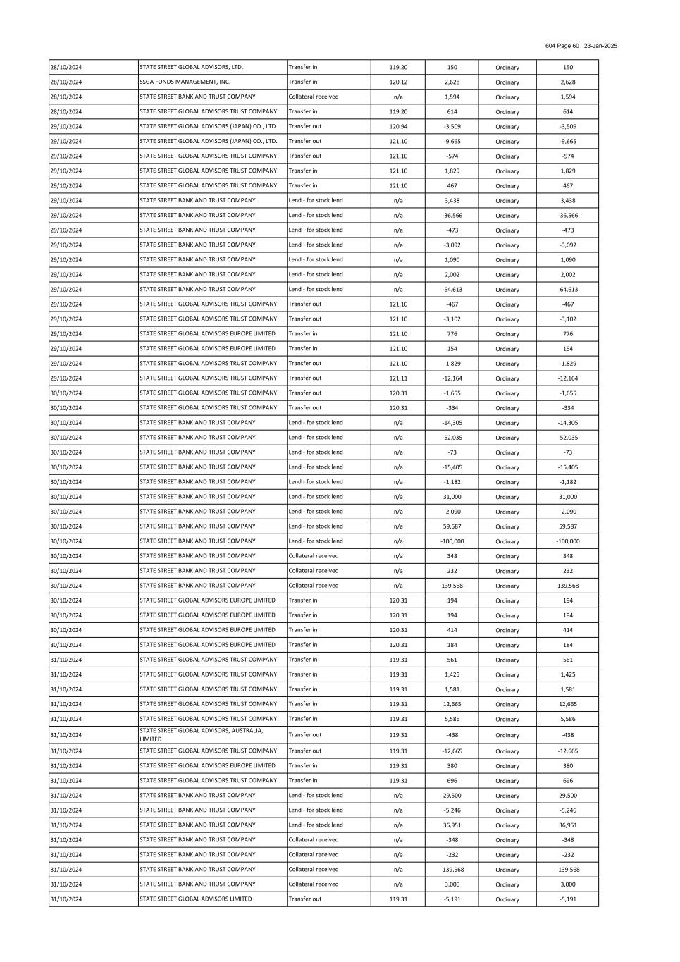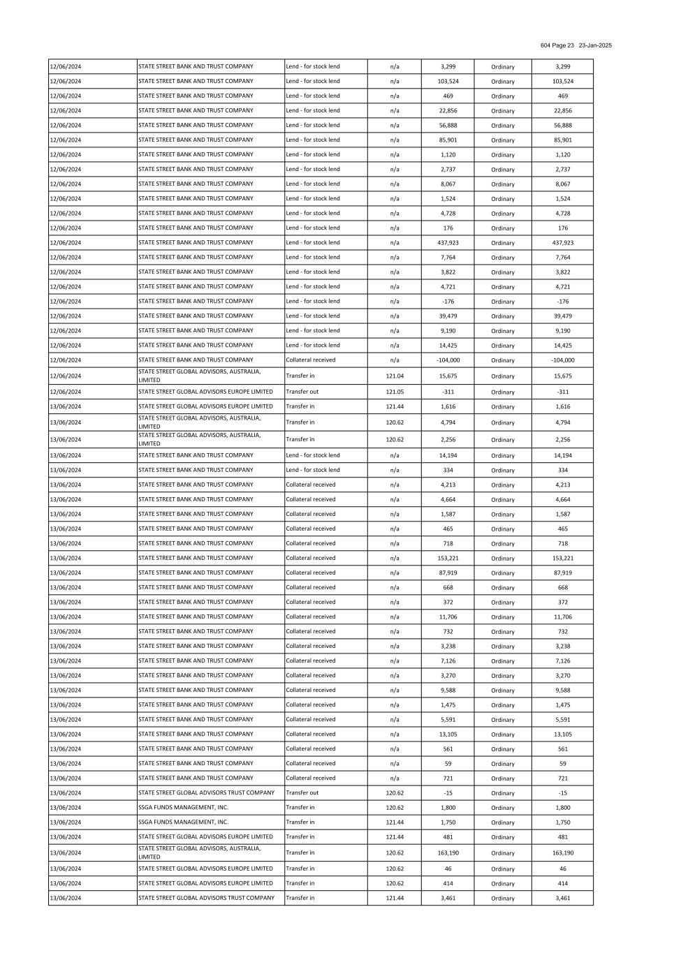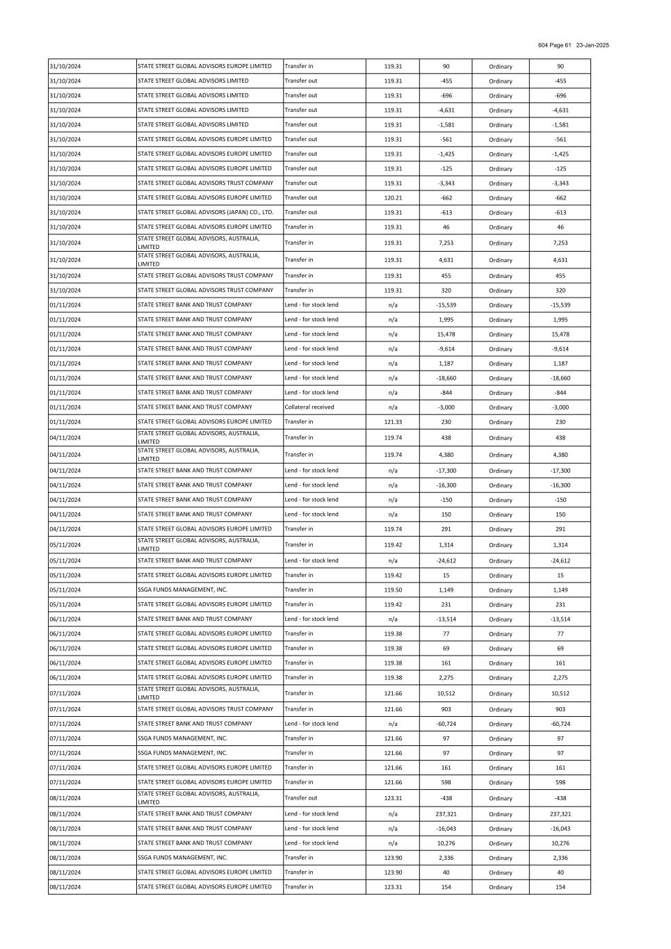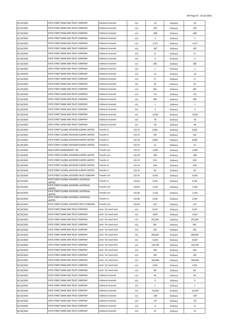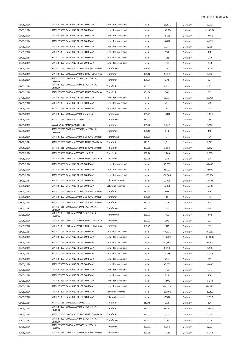 604 Page 52 23-Jan-2025 01/10/2024 n/a -16 Ordinary -16 01/10/2024 n/a -287 Ordinary -287 01/10/2024 n/a -468 Ordinary -468 01/10/2024 n/a -1 Ordinary -1 01/10/2024 n/a -2,317 Ordinary -2,317 01/10/2024 n/a -187 Ordinary -187 01/10/2024 n/a 11 Ordinary 11 01/10/2024 n/a -4 Ordinary -4 01/10/2024 n/a 200 Ordinary 200 01/10/2024 n/a -1 Ordinary -1 01/10/2024 n/a -12 Ordinary -12 01/10/2024 n/a 17 Ordinary 17 01/10/2024 n/a 20 Ordinary 20 01/10/2024 n/a 565 Ordinary 565 01/10/2024 n/a -43 Ordinary -43 01/10/2024 n/a 438 Ordinary 438 01/10/2024 n/a -1 Ordinary -1 01/10/2024 n/a -2 Ordinary -2 01/10/2024 n/a -4,556 Ordinary -4,556 01/10/2024 n/a -70 Ordinary -70 01/10/2024 n/a -40 Ordinary -40 01/10/2024 125.74 9,392 Ordinary 9,392 01/10/2024 125.74 744 Ordinary 744 01/10/2024 125.70 4,099 Ordinary 4,099 01/10/2024 125.74 15 Ordinary 15 01/10/2024 125.74 -1,095 Ordinary -1,095 01/10/2024 125.70 -506 Ordinary -506 01/10/2024 125.74 874 Ordinary 874 01/10/2024 125.74 230 Ordinary 230 01/10/2024 125.74 69 Ordinary 69 01/10/2024 125.74 -9,392 Ordinary -9,392 02/10/2024 125.96 2,256 Ordinary 2,256 02/10/2024 125.96 -3,102 Ordinary -3,102 02/10/2024 125.96 -1,314 Ordinary -1,314 02/10/2024 125.96 2,259 Ordinary 2,259 02/10/2024 125.96 -617 Ordinary -617 02/10/2024 n/a 6,167 Ordinary 6,167 02/10/2024 n/a -3,647 Ordinary -3,647 02/10/2024 n/a 167,030 Ordinary 167,030 02/10/2024 n/a 961 Ordinary 961 02/10/2024 n/a 204 Ordinary 204 02/10/2024 n/a 200,000 Ordinary 200,000 02/10/2024 n/a -6,202 Ordinary -6,202 02/10/2024 n/a -142,329 Ordinary -142,329 02/10/2024 n/a -961 Ordinary -961 02/10/2024 n/a 109 Ordinary 109 02/10/2024 n/a -169,460 Ordinary -169,460 02/10/2024 n/a 1,422 Ordinary 1,422 02/10/2024 n/a 68 Ordinary 68 02/10/2024 n/a 46 Ordinary 46 02/10/2024 n/a -5 Ordinary -5 02/10/2024 n/a 1 Ordinary 1 02/10/2024 n/a -10,104 Ordinary -10,104 02/10/2024 n/a -148 Ordinary -148 02/10/2024 n/a -39 Ordinary -39 02/10/2024 n/a -8 Ordinary -8 02/10/2024 n/a 13 Ordinary 13 STATE STREET GLOBAL ADVISORS EUROPE LIMITED Collateral received Lend - for stock lend STATE STREET GLOBAL ADVISORS, AUSTRALIA, LIMITED Collateral received STATE STREET BANK AND TRUST COMPANY Transfer in STATE STREET BANK AND TRUST COMPANY Transfer in STATE STREET GLOBAL ADVISORS EUROPE LIMITED Lend - for stock lend STATE STREET BANK AND TRUST COMPANY Transfer in STATE STREET BANK AND TRUST COMPANY STATE STREET BANK AND TRUST COMPANY STATE STREET BANK AND TRUST COMPANY STATE STREET BANK AND TRUST COMPANY Collateral received Lend - for stock lend STATE STREET GLOBAL ADVISORS EUROPE LIMITED STATE STREET BANK AND TRUST COMPANY Transfer out STATE STREET BANK AND TRUST COMPANY Collateral received Transfer in STATE STREET BANK AND TRUST COMPANY Collateral received STATE STREET BANK AND TRUST COMPANY STATE STREET BANK AND TRUST COMPANY Collateral received Lend - for stock lend STATE STREET GLOBAL ADVISORS EUROPE LIMITED STATE STREET BANK AND TRUST COMPANY STATE STREET BANK AND TRUST COMPANY STATE STREET BANK AND TRUST COMPANY Collateral received STATE STREET GLOBAL ADVISORS EUROPE LIMITED Lend - for stock lend Collateral received Transfer out Collateral received STATE STREET GLOBAL ADVISORS, AUSTRALIA, LIMITED Collateral received Lend - for stock lend Transfer in Collateral received STATE STREET BANK AND TRUST COMPANY STATE STREET GLOBAL ADVISORS EUROPE LIMITED Collateral received Transfer out STATE STREET BANK AND TRUST COMPANY STATE STREET GLOBAL ADVISORS TRUST COMPANY STATE STREET BANK AND TRUST COMPANY STATE STREET BANK AND TRUST COMPANY STATE STREET BANK AND TRUST COMPANY STATE STREET BANK AND TRUST COMPANY Lend - for stock lend Collateral received STATE STREET BANK AND TRUST COMPANY STATE STREET BANK AND TRUST COMPANY Lend - for stock lend Transfer out Collateral received STATE STREET GLOBAL ADVISORS TRUST COMPANY Lend - for stock lend STATE STREET BANK AND TRUST COMPANY Collateral received STATE STREET BANK AND TRUST COMPANY STATE STREET GLOBAL ADVISORS, AUSTRALIA, LIMITED STATE STREET BANK AND TRUST COMPANY Collateral received STATE STREET BANK AND TRUST COMPANY Collateral received Transfer in STATE STREET BANK AND TRUST COMPANY STATE STREET BANK AND TRUST COMPANY Collateral received STATE STREET BANK AND TRUST COMPANY Transfer out Collateral received STATE STREET BANK AND TRUST COMPANY Collateral received SSGA FUNDS MANAGEMENT, INC. Lend - for stock lend Transfer out STATE STREET BANK AND TRUST COMPANY STATE STREET BANK AND TRUST COMPANY STATE STREET BANK AND TRUST COMPANY Transfer in STATE STREET GLOBAL ADVISORS EUROPE LIMITED Collateral received Collateral received Lend - for stock lend STATE STREET BANK AND TRUST COMPANY Collateral received STATE STREET BANK AND TRUST COMPANY Lend - for stock lend Transfer in STATE STREET BANK AND TRUST COMPANY STATE STREET BANK AND TRUST COMPANY Collateral received Collateral received Collateral received STATE STREET BANK AND TRUST COMPANY STATE STREET BANK AND TRUST COMPANY Collateral received STATE STREET BANK AND TRUST COMPANY Transfer in STATE STREET GLOBAL ADVISORS, AUSTRALIA, LIMITED Collateral received STATE STREET GLOBAL ADVISORS EUROPE LIMITED Lend - for stock lend STATE STREET BANK AND TRUST COMPANY Collateral received