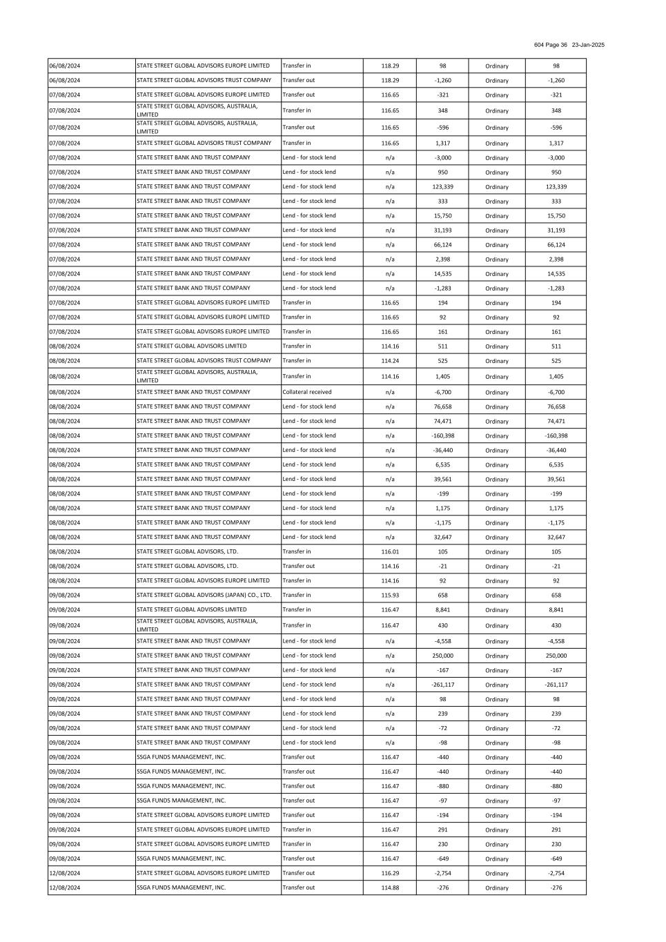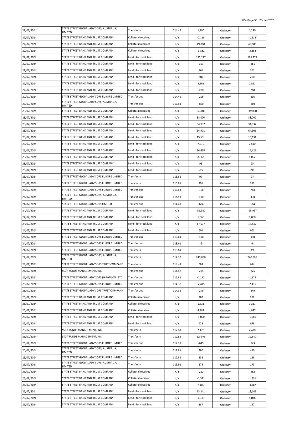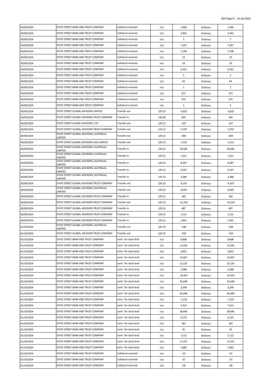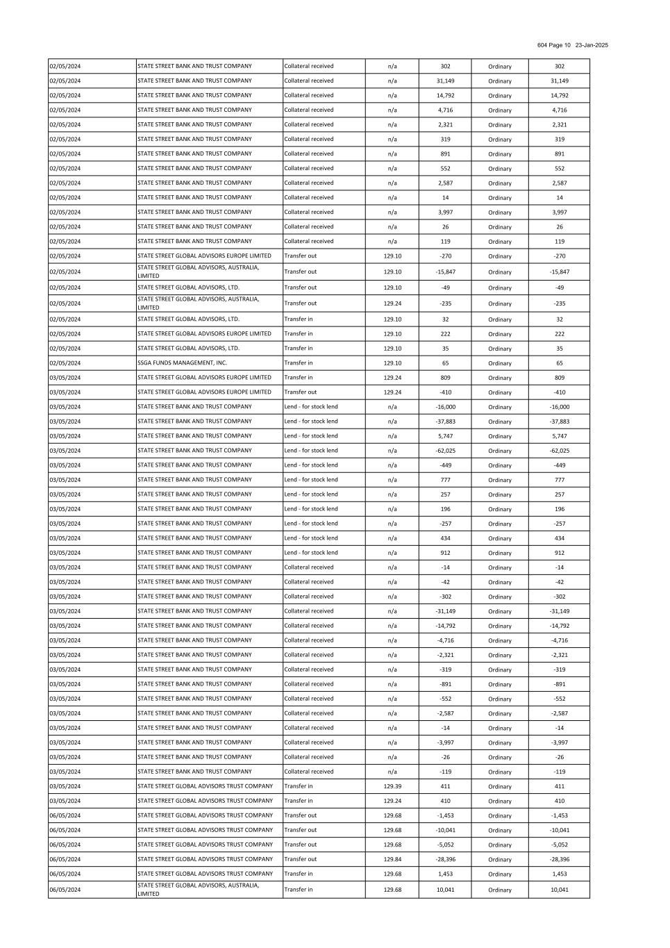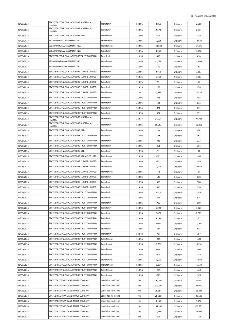 604 Page 52 23-Jan-2025 01/10/2024 n/a -16 Ordinary -16 01/10/2024 n/a -287 Ordinary -287 01/10/2024 n/a -468 Ordinary -468 01/10/2024 n/a -1 Ordinary -1 01/10/2024 n/a -2,317 Ordinary -2,317 01/10/2024 n/a -187 Ordinary -187 01/10/2024 n/a 11 Ordinary 11 01/10/2024 n/a -4 Ordinary -4 01/10/2024 n/a 200 Ordinary 200 01/10/2024 n/a -1 Ordinary -1 01/10/2024 n/a -12 Ordinary -12 01/10/2024 n/a 17 Ordinary 17 01/10/2024 n/a 20 Ordinary 20 01/10/2024 n/a 565 Ordinary 565 01/10/2024 n/a -43 Ordinary -43 01/10/2024 n/a 438 Ordinary 438 01/10/2024 n/a -1 Ordinary -1 01/10/2024 n/a -2 Ordinary -2 01/10/2024 n/a -4,556 Ordinary -4,556 01/10/2024 n/a -70 Ordinary -70 01/10/2024 n/a -40 Ordinary -40 01/10/2024 125.74 9,392 Ordinary 9,392 01/10/2024 125.74 744 Ordinary 744 01/10/2024 125.70 4,099 Ordinary 4,099 01/10/2024 125.74 15 Ordinary 15 01/10/2024 125.74 -1,095 Ordinary -1,095 01/10/2024 125.70 -506 Ordinary -506 01/10/2024 125.74 874 Ordinary 874 01/10/2024 125.74 230 Ordinary 230 01/10/2024 125.74 69 Ordinary 69 01/10/2024 125.74 -9,392 Ordinary -9,392 02/10/2024 125.96 2,256 Ordinary 2,256 02/10/2024 125.96 -3,102 Ordinary -3,102 02/10/2024 125.96 -1,314 Ordinary -1,314 02/10/2024 125.96 2,259 Ordinary 2,259 02/10/2024 125.96 -617 Ordinary -617 02/10/2024 n/a 6,167 Ordinary 6,167 02/10/2024 n/a -3,647 Ordinary -3,647 02/10/2024 n/a 167,030 Ordinary 167,030 02/10/2024 n/a 961 Ordinary 961 02/10/2024 n/a 204 Ordinary 204 02/10/2024 n/a 200,000 Ordinary 200,000 02/10/2024 n/a -6,202 Ordinary -6,202 02/10/2024 n/a -142,329 Ordinary -142,329 02/10/2024 n/a -961 Ordinary -961 02/10/2024 n/a 109 Ordinary 109 02/10/2024 n/a -169,460 Ordinary -169,460 02/10/2024 n/a 1,422 Ordinary 1,422 02/10/2024 n/a 68 Ordinary 68 02/10/2024 n/a 46 Ordinary 46 02/10/2024 n/a -5 Ordinary -5 02/10/2024 n/a 1 Ordinary 1 02/10/2024 n/a -10,104 Ordinary -10,104 02/10/2024 n/a -148 Ordinary -148 02/10/2024 n/a -39 Ordinary -39 02/10/2024 n/a -8 Ordinary -8 02/10/2024 n/a 13 Ordinary 13 STATE STREET GLOBAL ADVISORS EUROPE LIMITED Collateral received Lend - for stock lend STATE STREET GLOBAL ADVISORS, AUSTRALIA, LIMITED Collateral received STATE STREET BANK AND TRUST COMPANY Transfer in STATE STREET BANK AND TRUST COMPANY Transfer in STATE STREET GLOBAL ADVISORS EUROPE LIMITED Lend - for stock lend STATE STREET BANK AND TRUST COMPANY Transfer in STATE STREET BANK AND TRUST COMPANY STATE STREET BANK AND TRUST COMPANY STATE STREET BANK AND TRUST COMPANY STATE STREET BANK AND TRUST COMPANY Collateral received Lend - for stock lend STATE STREET GLOBAL ADVISORS EUROPE LIMITED STATE STREET BANK AND TRUST COMPANY Transfer out STATE STREET BANK AND TRUST COMPANY Collateral received Transfer in STATE STREET BANK AND TRUST COMPANY Collateral received STATE STREET BANK AND TRUST COMPANY STATE STREET BANK AND TRUST COMPANY Collateral received Lend - for stock lend STATE STREET GLOBAL ADVISORS EUROPE LIMITED STATE STREET BANK AND TRUST COMPANY STATE STREET BANK AND TRUST COMPANY STATE STREET BANK AND TRUST COMPANY Collateral received STATE STREET GLOBAL ADVISORS EUROPE LIMITED Lend - for stock lend Collateral received Transfer out Collateral received STATE STREET GLOBAL ADVISORS, AUSTRALIA, LIMITED Collateral received Lend - for stock lend Transfer in Collateral received STATE STREET BANK AND TRUST COMPANY STATE STREET GLOBAL ADVISORS EUROPE LIMITED Collateral received Transfer out STATE STREET BANK AND TRUST COMPANY STATE STREET GLOBAL ADVISORS TRUST COMPANY STATE STREET BANK AND TRUST COMPANY STATE STREET BANK AND TRUST COMPANY STATE STREET BANK AND TRUST COMPANY STATE STREET BANK AND TRUST COMPANY Lend - for stock lend Collateral received STATE STREET BANK AND TRUST COMPANY STATE STREET BANK AND TRUST COMPANY Lend - for stock lend Transfer out Collateral received STATE STREET GLOBAL ADVISORS TRUST COMPANY Lend - for stock lend STATE STREET BANK AND TRUST COMPANY Collateral received STATE STREET BANK AND TRUST COMPANY STATE STREET GLOBAL ADVISORS, AUSTRALIA, LIMITED STATE STREET BANK AND TRUST COMPANY Collateral received STATE STREET BANK AND TRUST COMPANY Collateral received Transfer in STATE STREET BANK AND TRUST COMPANY STATE STREET BANK AND TRUST COMPANY Collateral received STATE STREET BANK AND TRUST COMPANY Transfer out Collateral received STATE STREET BANK AND TRUST COMPANY Collateral received SSGA FUNDS MANAGEMENT, INC. Lend - for stock lend Transfer out STATE STREET BANK AND TRUST COMPANY STATE STREET BANK AND TRUST COMPANY STATE STREET BANK AND TRUST COMPANY Transfer in STATE STREET GLOBAL ADVISORS EUROPE LIMITED Collateral received Collateral received Lend - for stock lend STATE STREET BANK AND TRUST COMPANY Collateral received STATE STREET BANK AND TRUST COMPANY Lend - for stock lend Transfer in STATE STREET BANK AND TRUST COMPANY STATE STREET BANK AND TRUST COMPANY Collateral received Collateral received Collateral received STATE STREET BANK AND TRUST COMPANY STATE STREET BANK AND TRUST COMPANY Collateral received STATE STREET BANK AND TRUST COMPANY Transfer in STATE STREET GLOBAL ADVISORS, AUSTRALIA, LIMITED Collateral received STATE STREET GLOBAL ADVISORS EUROPE LIMITED Lend - for stock lend STATE STREET BANK AND TRUST COMPANY Collateral received