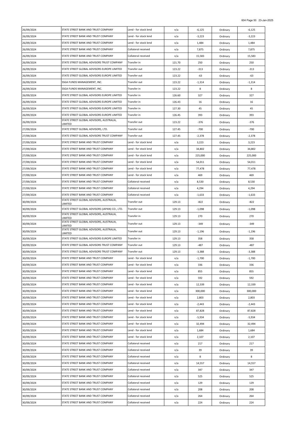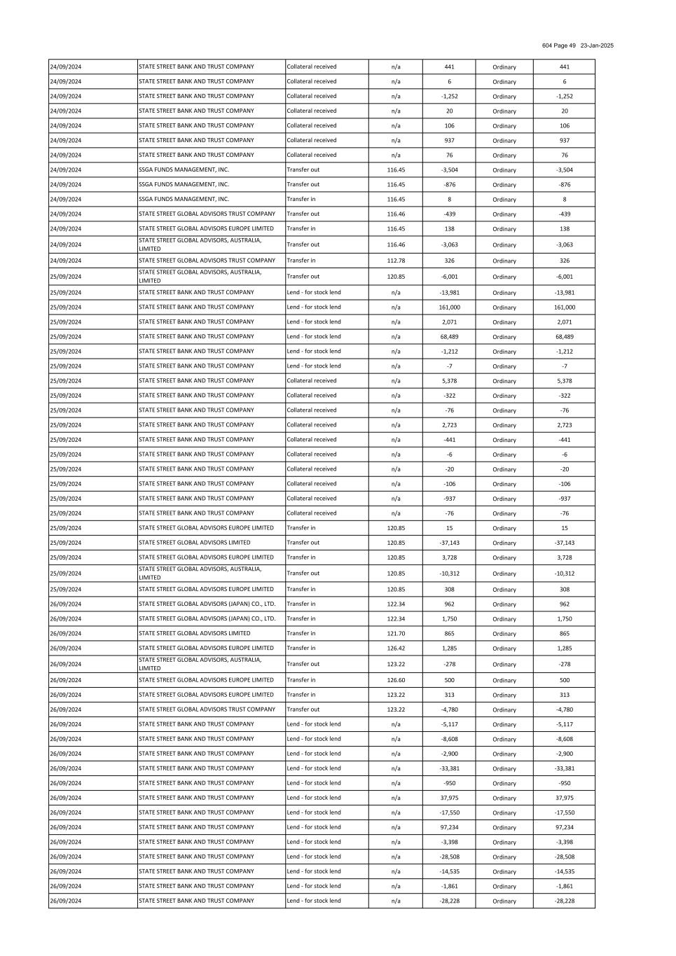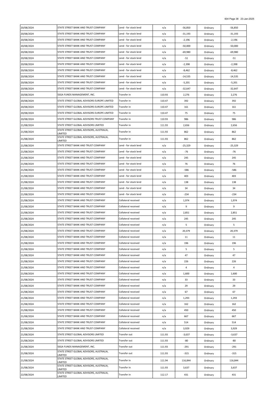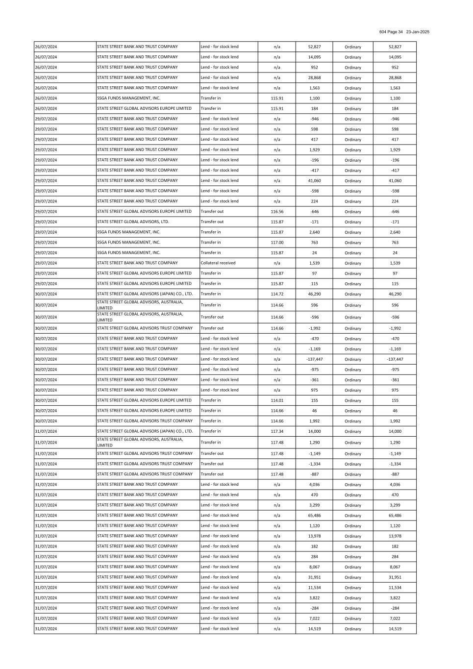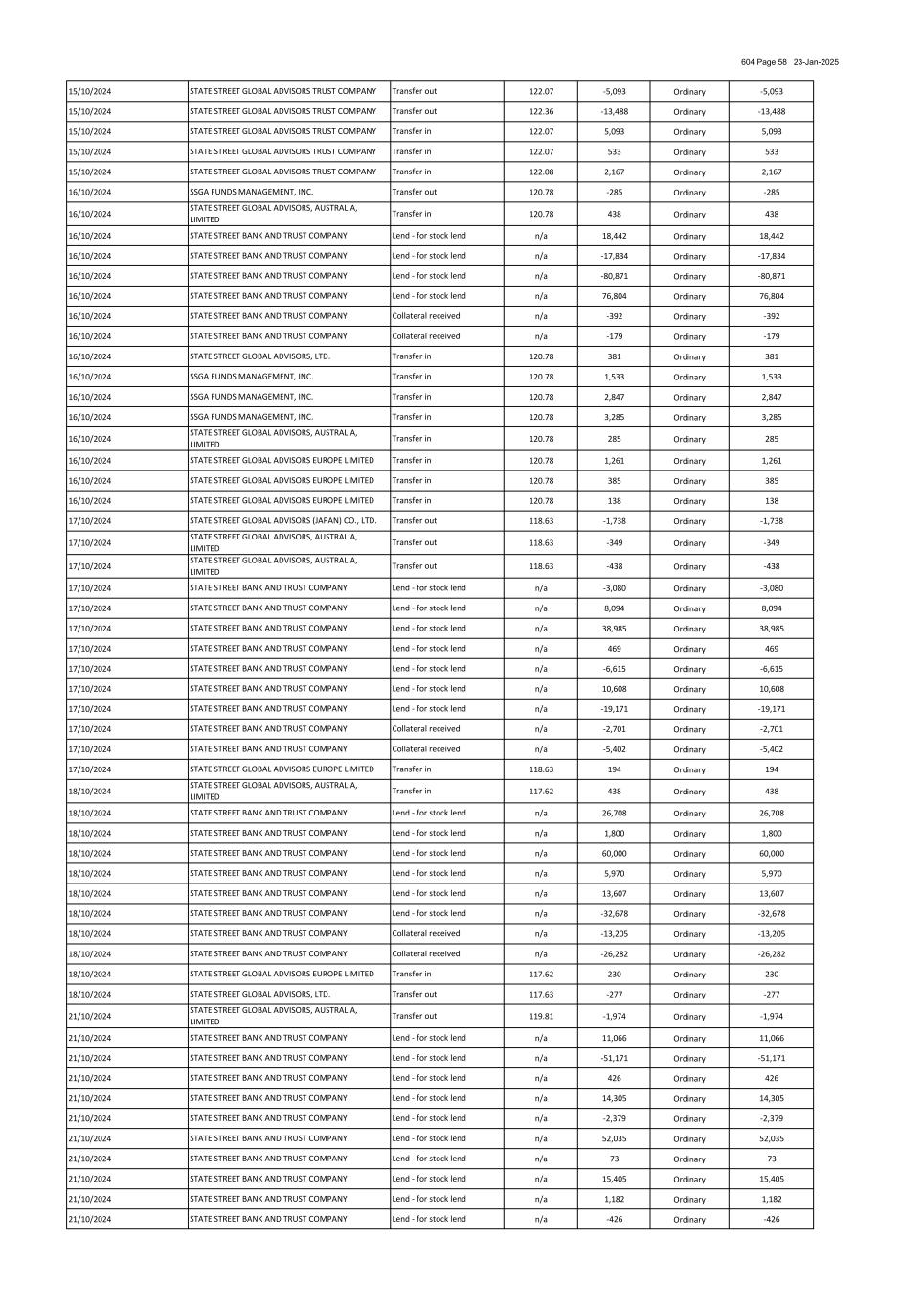 604 Page 52 23-Jan-2025 01/10/2024 n/a -16 Ordinary -16 01/10/2024 n/a -287 Ordinary -287 01/10/2024 n/a -468 Ordinary -468 01/10/2024 n/a -1 Ordinary -1 01/10/2024 n/a -2,317 Ordinary -2,317 01/10/2024 n/a -187 Ordinary -187 01/10/2024 n/a 11 Ordinary 11 01/10/2024 n/a -4 Ordinary -4 01/10/2024 n/a 200 Ordinary 200 01/10/2024 n/a -1 Ordinary -1 01/10/2024 n/a -12 Ordinary -12 01/10/2024 n/a 17 Ordinary 17 01/10/2024 n/a 20 Ordinary 20 01/10/2024 n/a 565 Ordinary 565 01/10/2024 n/a -43 Ordinary -43 01/10/2024 n/a 438 Ordinary 438 01/10/2024 n/a -1 Ordinary -1 01/10/2024 n/a -2 Ordinary -2 01/10/2024 n/a -4,556 Ordinary -4,556 01/10/2024 n/a -70 Ordinary -70 01/10/2024 n/a -40 Ordinary -40 01/10/2024 125.74 9,392 Ordinary 9,392 01/10/2024 125.74 744 Ordinary 744 01/10/2024 125.70 4,099 Ordinary 4,099 01/10/2024 125.74 15 Ordinary 15 01/10/2024 125.74 -1,095 Ordinary -1,095 01/10/2024 125.70 -506 Ordinary -506 01/10/2024 125.74 874 Ordinary 874 01/10/2024 125.74 230 Ordinary 230 01/10/2024 125.74 69 Ordinary 69 01/10/2024 125.74 -9,392 Ordinary -9,392 02/10/2024 125.96 2,256 Ordinary 2,256 02/10/2024 125.96 -3,102 Ordinary -3,102 02/10/2024 125.96 -1,314 Ordinary -1,314 02/10/2024 125.96 2,259 Ordinary 2,259 02/10/2024 125.96 -617 Ordinary -617 02/10/2024 n/a 6,167 Ordinary 6,167 02/10/2024 n/a -3,647 Ordinary -3,647 02/10/2024 n/a 167,030 Ordinary 167,030 02/10/2024 n/a 961 Ordinary 961 02/10/2024 n/a 204 Ordinary 204 02/10/2024 n/a 200,000 Ordinary 200,000 02/10/2024 n/a -6,202 Ordinary -6,202 02/10/2024 n/a -142,329 Ordinary -142,329 02/10/2024 n/a -961 Ordinary -961 02/10/2024 n/a 109 Ordinary 109 02/10/2024 n/a -169,460 Ordinary -169,460 02/10/2024 n/a 1,422 Ordinary 1,422 02/10/2024 n/a 68 Ordinary 68 02/10/2024 n/a 46 Ordinary 46 02/10/2024 n/a -5 Ordinary -5 02/10/2024 n/a 1 Ordinary 1 02/10/2024 n/a -10,104 Ordinary -10,104 02/10/2024 n/a -148 Ordinary -148 02/10/2024 n/a -39 Ordinary -39 02/10/2024 n/a -8 Ordinary -8 02/10/2024 n/a 13 Ordinary 13 STATE STREET GLOBAL ADVISORS EUROPE LIMITED Collateral received Lend - for stock lend STATE STREET GLOBAL ADVISORS, AUSTRALIA, LIMITED Collateral received STATE STREET BANK AND TRUST COMPANY Transfer in STATE STREET BANK AND TRUST COMPANY Transfer in STATE STREET GLOBAL ADVISORS EUROPE LIMITED Lend - for stock lend STATE STREET BANK AND TRUST COMPANY Transfer in STATE STREET BANK AND TRUST COMPANY STATE STREET BANK AND TRUST COMPANY STATE STREET BANK AND TRUST COMPANY STATE STREET BANK AND TRUST COMPANY Collateral received Lend - for stock lend STATE STREET GLOBAL ADVISORS EUROPE LIMITED STATE STREET BANK AND TRUST COMPANY Transfer out STATE STREET BANK AND TRUST COMPANY Collateral received Transfer in STATE STREET BANK AND TRUST COMPANY Collateral received STATE STREET BANK AND TRUST COMPANY STATE STREET BANK AND TRUST COMPANY Collateral received Lend - for stock lend STATE STREET GLOBAL ADVISORS EUROPE LIMITED STATE STREET BANK AND TRUST COMPANY STATE STREET BANK AND TRUST COMPANY STATE STREET BANK AND TRUST COMPANY Collateral received STATE STREET GLOBAL ADVISORS EUROPE LIMITED Lend - for stock lend Collateral received Transfer out Collateral received STATE STREET GLOBAL ADVISORS, AUSTRALIA, LIMITED Collateral received Lend - for stock lend Transfer in Collateral received STATE STREET BANK AND TRUST COMPANY STATE STREET GLOBAL ADVISORS EUROPE LIMITED Collateral received Transfer out STATE STREET BANK AND TRUST COMPANY STATE STREET GLOBAL ADVISORS TRUST COMPANY STATE STREET BANK AND TRUST COMPANY STATE STREET BANK AND TRUST COMPANY STATE STREET BANK AND TRUST COMPANY STATE STREET BANK AND TRUST COMPANY Lend - for stock lend Collateral received STATE STREET BANK AND TRUST COMPANY STATE STREET BANK AND TRUST COMPANY Lend - for stock lend Transfer out Collateral received STATE STREET GLOBAL ADVISORS TRUST COMPANY Lend - for stock lend STATE STREET BANK AND TRUST COMPANY Collateral received STATE STREET BANK AND TRUST COMPANY STATE STREET GLOBAL ADVISORS, AUSTRALIA, LIMITED STATE STREET BANK AND TRUST COMPANY Collateral received STATE STREET BANK AND TRUST COMPANY Collateral received Transfer in STATE STREET BANK AND TRUST COMPANY STATE STREET BANK AND TRUST COMPANY Collateral received STATE STREET BANK AND TRUST COMPANY Transfer out Collateral received STATE STREET BANK AND TRUST COMPANY Collateral received SSGA FUNDS MANAGEMENT, INC. Lend - for stock lend Transfer out STATE STREET BANK AND TRUST COMPANY STATE STREET BANK AND TRUST COMPANY STATE STREET BANK AND TRUST COMPANY Transfer in STATE STREET GLOBAL ADVISORS EUROPE LIMITED Collateral received Collateral received Lend - for stock lend STATE STREET BANK AND TRUST COMPANY Collateral received STATE STREET BANK AND TRUST COMPANY Lend - for stock lend Transfer in STATE STREET BANK AND TRUST COMPANY STATE STREET BANK AND TRUST COMPANY Collateral received Collateral received Collateral received STATE STREET BANK AND TRUST COMPANY STATE STREET BANK AND TRUST COMPANY Collateral received STATE STREET BANK AND TRUST COMPANY Transfer in STATE STREET GLOBAL ADVISORS, AUSTRALIA, LIMITED Collateral received STATE STREET GLOBAL ADVISORS EUROPE LIMITED Lend - for stock lend STATE STREET BANK AND TRUST COMPANY Collateral received