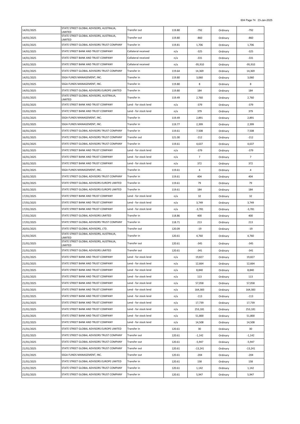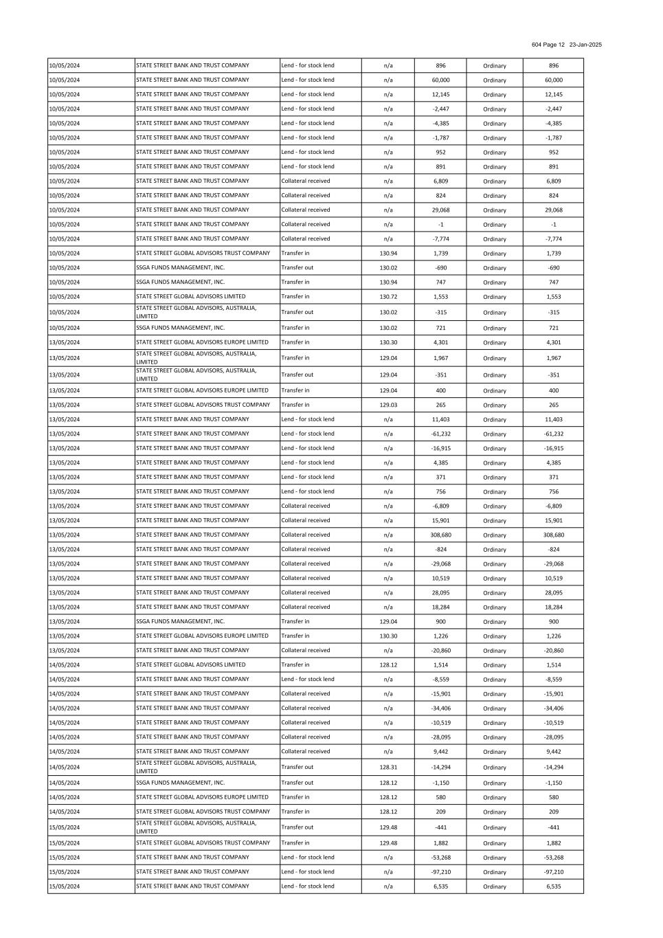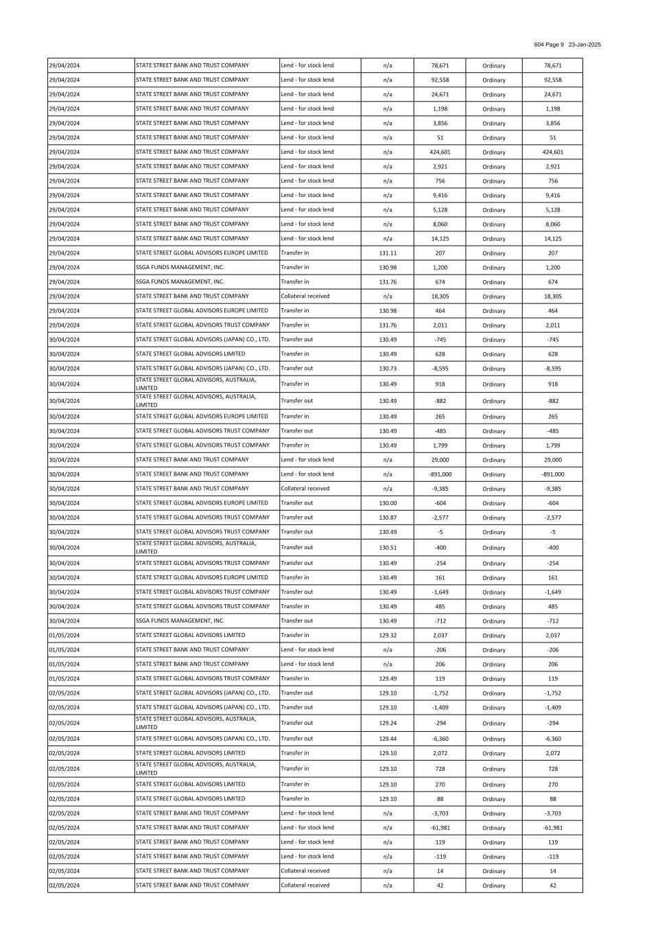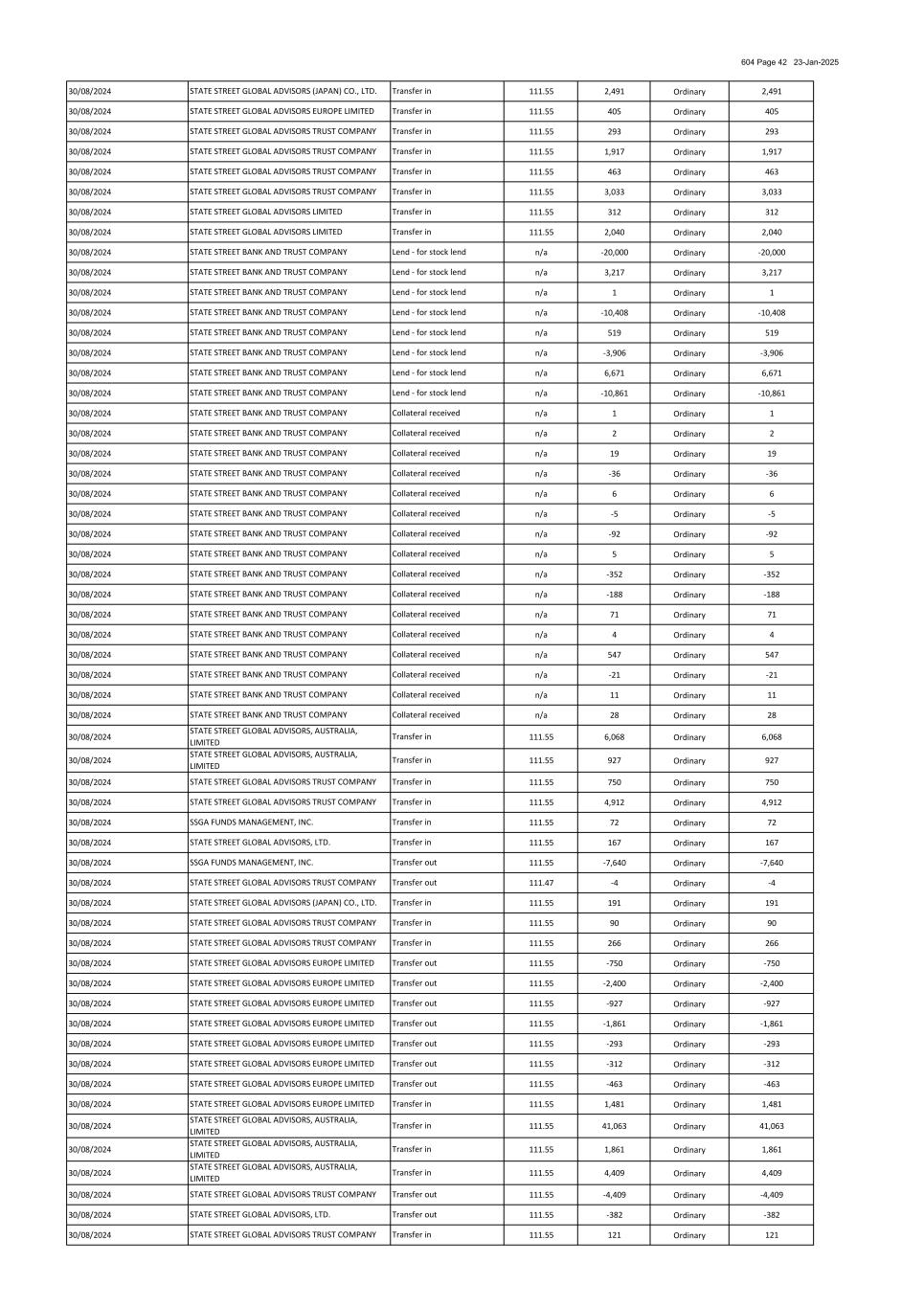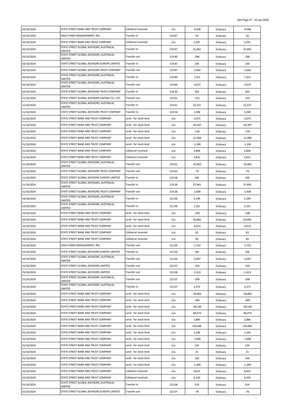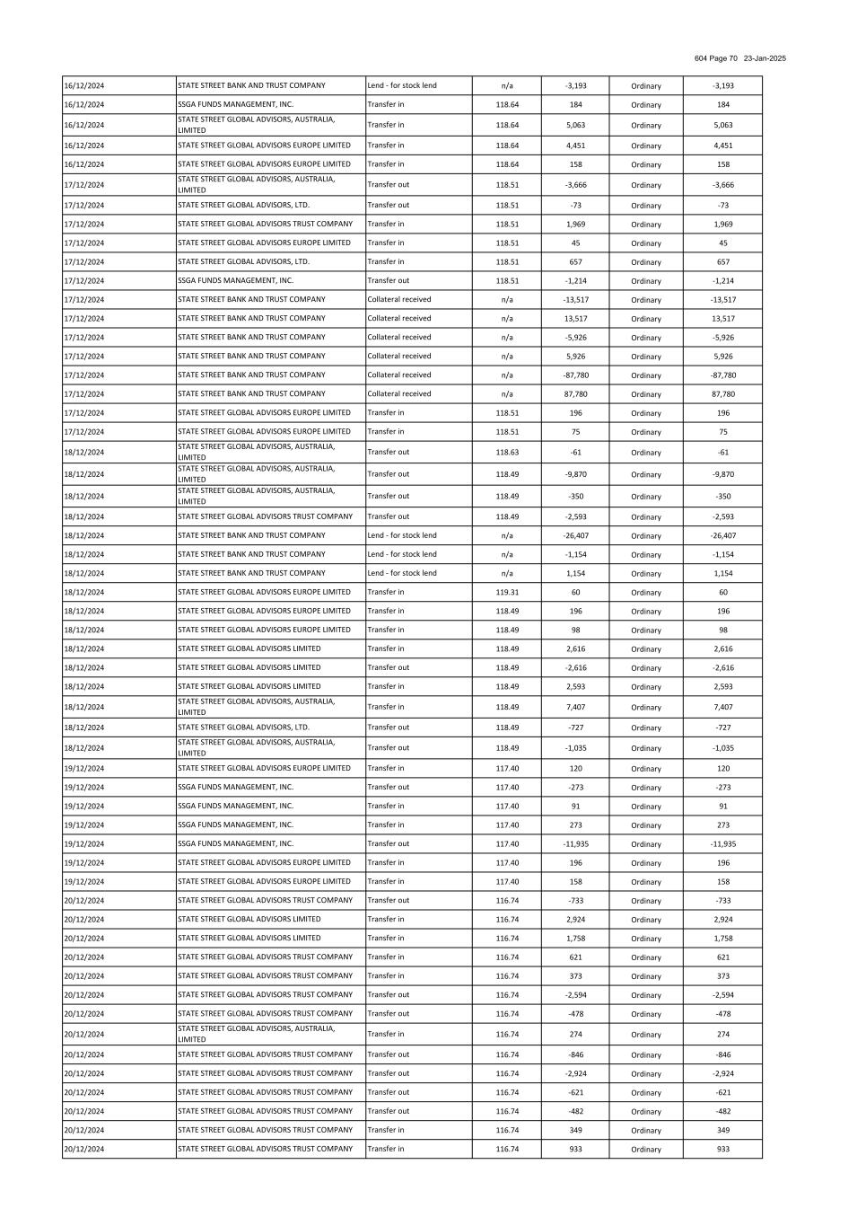 604 Page 52 23-Jan-2025 01/10/2024 n/a -16 Ordinary -16 01/10/2024 n/a -287 Ordinary -287 01/10/2024 n/a -468 Ordinary -468 01/10/2024 n/a -1 Ordinary -1 01/10/2024 n/a -2,317 Ordinary -2,317 01/10/2024 n/a -187 Ordinary -187 01/10/2024 n/a 11 Ordinary 11 01/10/2024 n/a -4 Ordinary -4 01/10/2024 n/a 200 Ordinary 200 01/10/2024 n/a -1 Ordinary -1 01/10/2024 n/a -12 Ordinary -12 01/10/2024 n/a 17 Ordinary 17 01/10/2024 n/a 20 Ordinary 20 01/10/2024 n/a 565 Ordinary 565 01/10/2024 n/a -43 Ordinary -43 01/10/2024 n/a 438 Ordinary 438 01/10/2024 n/a -1 Ordinary -1 01/10/2024 n/a -2 Ordinary -2 01/10/2024 n/a -4,556 Ordinary -4,556 01/10/2024 n/a -70 Ordinary -70 01/10/2024 n/a -40 Ordinary -40 01/10/2024 125.74 9,392 Ordinary 9,392 01/10/2024 125.74 744 Ordinary 744 01/10/2024 125.70 4,099 Ordinary 4,099 01/10/2024 125.74 15 Ordinary 15 01/10/2024 125.74 -1,095 Ordinary -1,095 01/10/2024 125.70 -506 Ordinary -506 01/10/2024 125.74 874 Ordinary 874 01/10/2024 125.74 230 Ordinary 230 01/10/2024 125.74 69 Ordinary 69 01/10/2024 125.74 -9,392 Ordinary -9,392 02/10/2024 125.96 2,256 Ordinary 2,256 02/10/2024 125.96 -3,102 Ordinary -3,102 02/10/2024 125.96 -1,314 Ordinary -1,314 02/10/2024 125.96 2,259 Ordinary 2,259 02/10/2024 125.96 -617 Ordinary -617 02/10/2024 n/a 6,167 Ordinary 6,167 02/10/2024 n/a -3,647 Ordinary -3,647 02/10/2024 n/a 167,030 Ordinary 167,030 02/10/2024 n/a 961 Ordinary 961 02/10/2024 n/a 204 Ordinary 204 02/10/2024 n/a 200,000 Ordinary 200,000 02/10/2024 n/a -6,202 Ordinary -6,202 02/10/2024 n/a -142,329 Ordinary -142,329 02/10/2024 n/a -961 Ordinary -961 02/10/2024 n/a 109 Ordinary 109 02/10/2024 n/a -169,460 Ordinary -169,460 02/10/2024 n/a 1,422 Ordinary 1,422 02/10/2024 n/a 68 Ordinary 68 02/10/2024 n/a 46 Ordinary 46 02/10/2024 n/a -5 Ordinary -5 02/10/2024 n/a 1 Ordinary 1 02/10/2024 n/a -10,104 Ordinary -10,104 02/10/2024 n/a -148 Ordinary -148 02/10/2024 n/a -39 Ordinary -39 02/10/2024 n/a -8 Ordinary -8 02/10/2024 n/a 13 Ordinary 13 STATE STREET GLOBAL ADVISORS EUROPE LIMITED Collateral received Lend - for stock lend STATE STREET GLOBAL ADVISORS, AUSTRALIA, LIMITED Collateral received STATE STREET BANK AND TRUST COMPANY Transfer in STATE STREET BANK AND TRUST COMPANY Transfer in STATE STREET GLOBAL ADVISORS EUROPE LIMITED Lend - for stock lend STATE STREET BANK AND TRUST COMPANY Transfer in STATE STREET BANK AND TRUST COMPANY STATE STREET BANK AND TRUST COMPANY STATE STREET BANK AND TRUST COMPANY STATE STREET BANK AND TRUST COMPANY Collateral received Lend - for stock lend STATE STREET GLOBAL ADVISORS EUROPE LIMITED STATE STREET BANK AND TRUST COMPANY Transfer out STATE STREET BANK AND TRUST COMPANY Collateral received Transfer in STATE STREET BANK AND TRUST COMPANY Collateral received STATE STREET BANK AND TRUST COMPANY STATE STREET BANK AND TRUST COMPANY Collateral received Lend - for stock lend STATE STREET GLOBAL ADVISORS EUROPE LIMITED STATE STREET BANK AND TRUST COMPANY STATE STREET BANK AND TRUST COMPANY STATE STREET BANK AND TRUST COMPANY Collateral received STATE STREET GLOBAL ADVISORS EUROPE LIMITED Lend - for stock lend Collateral received Transfer out Collateral received STATE STREET GLOBAL ADVISORS, AUSTRALIA, LIMITED Collateral received Lend - for stock lend Transfer in Collateral received STATE STREET BANK AND TRUST COMPANY STATE STREET GLOBAL ADVISORS EUROPE LIMITED Collateral received Transfer out STATE STREET BANK AND TRUST COMPANY STATE STREET GLOBAL ADVISORS TRUST COMPANY STATE STREET BANK AND TRUST COMPANY STATE STREET BANK AND TRUST COMPANY STATE STREET BANK AND TRUST COMPANY STATE STREET BANK AND TRUST COMPANY Lend - for stock lend Collateral received STATE STREET BANK AND TRUST COMPANY STATE STREET BANK AND TRUST COMPANY Lend - for stock lend Transfer out Collateral received STATE STREET GLOBAL ADVISORS TRUST COMPANY Lend - for stock lend STATE STREET BANK AND TRUST COMPANY Collateral received STATE STREET BANK AND TRUST COMPANY STATE STREET GLOBAL ADVISORS, AUSTRALIA, LIMITED STATE STREET BANK AND TRUST COMPANY Collateral received STATE STREET BANK AND TRUST COMPANY Collateral received Transfer in STATE STREET BANK AND TRUST COMPANY STATE STREET BANK AND TRUST COMPANY Collateral received STATE STREET BANK AND TRUST COMPANY Transfer out Collateral received STATE STREET BANK AND TRUST COMPANY Collateral received SSGA FUNDS MANAGEMENT, INC. Lend - for stock lend Transfer out STATE STREET BANK AND TRUST COMPANY STATE STREET BANK AND TRUST COMPANY STATE STREET BANK AND TRUST COMPANY Transfer in STATE STREET GLOBAL ADVISORS EUROPE LIMITED Collateral received Collateral received Lend - for stock lend STATE STREET BANK AND TRUST COMPANY Collateral received STATE STREET BANK AND TRUST COMPANY Lend - for stock lend Transfer in STATE STREET BANK AND TRUST COMPANY STATE STREET BANK AND TRUST COMPANY Collateral received Collateral received Collateral received STATE STREET BANK AND TRUST COMPANY STATE STREET BANK AND TRUST COMPANY Collateral received STATE STREET BANK AND TRUST COMPANY Transfer in STATE STREET GLOBAL ADVISORS, AUSTRALIA, LIMITED Collateral received STATE STREET GLOBAL ADVISORS EUROPE LIMITED Lend - for stock lend STATE STREET BANK AND TRUST COMPANY Collateral received