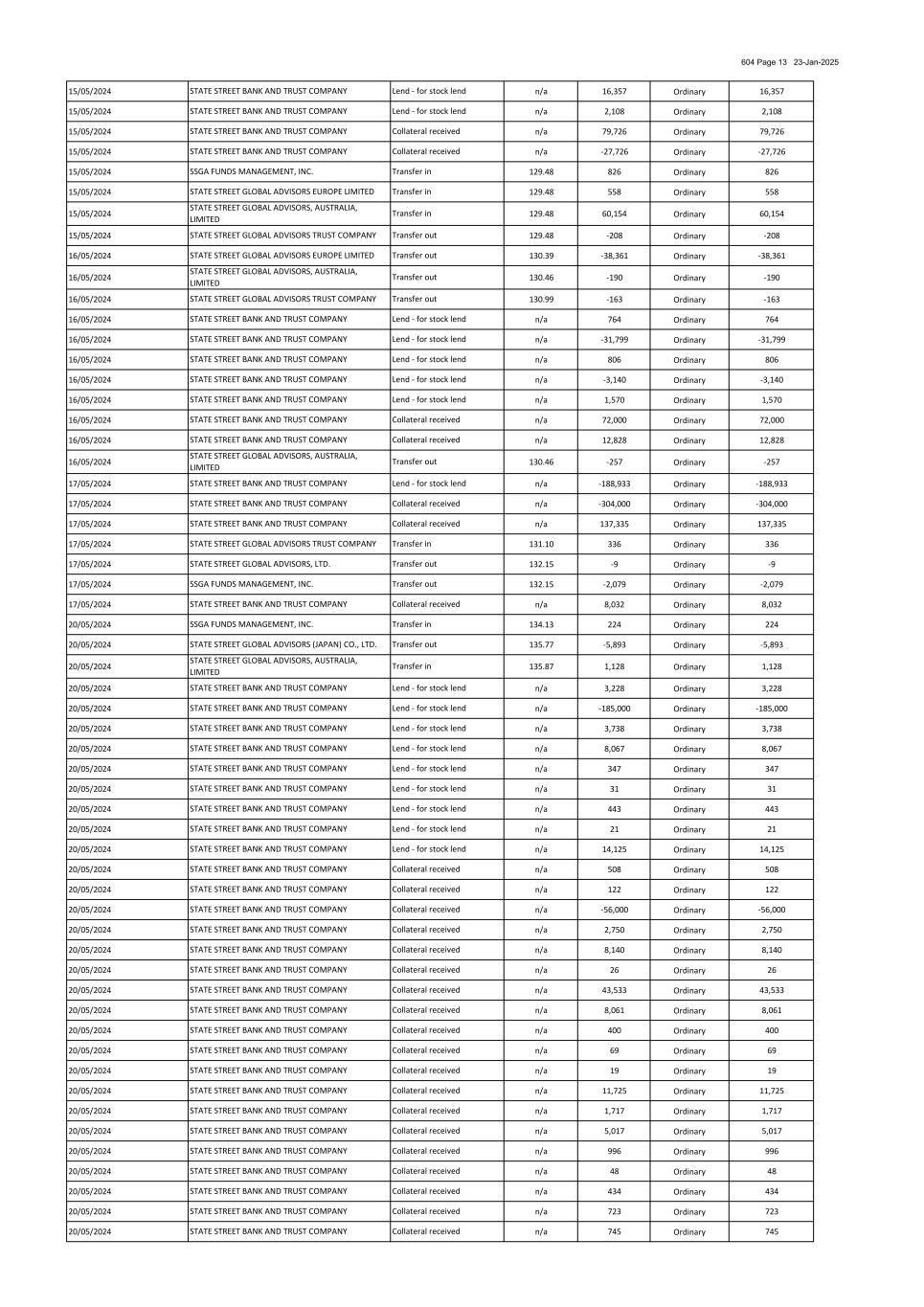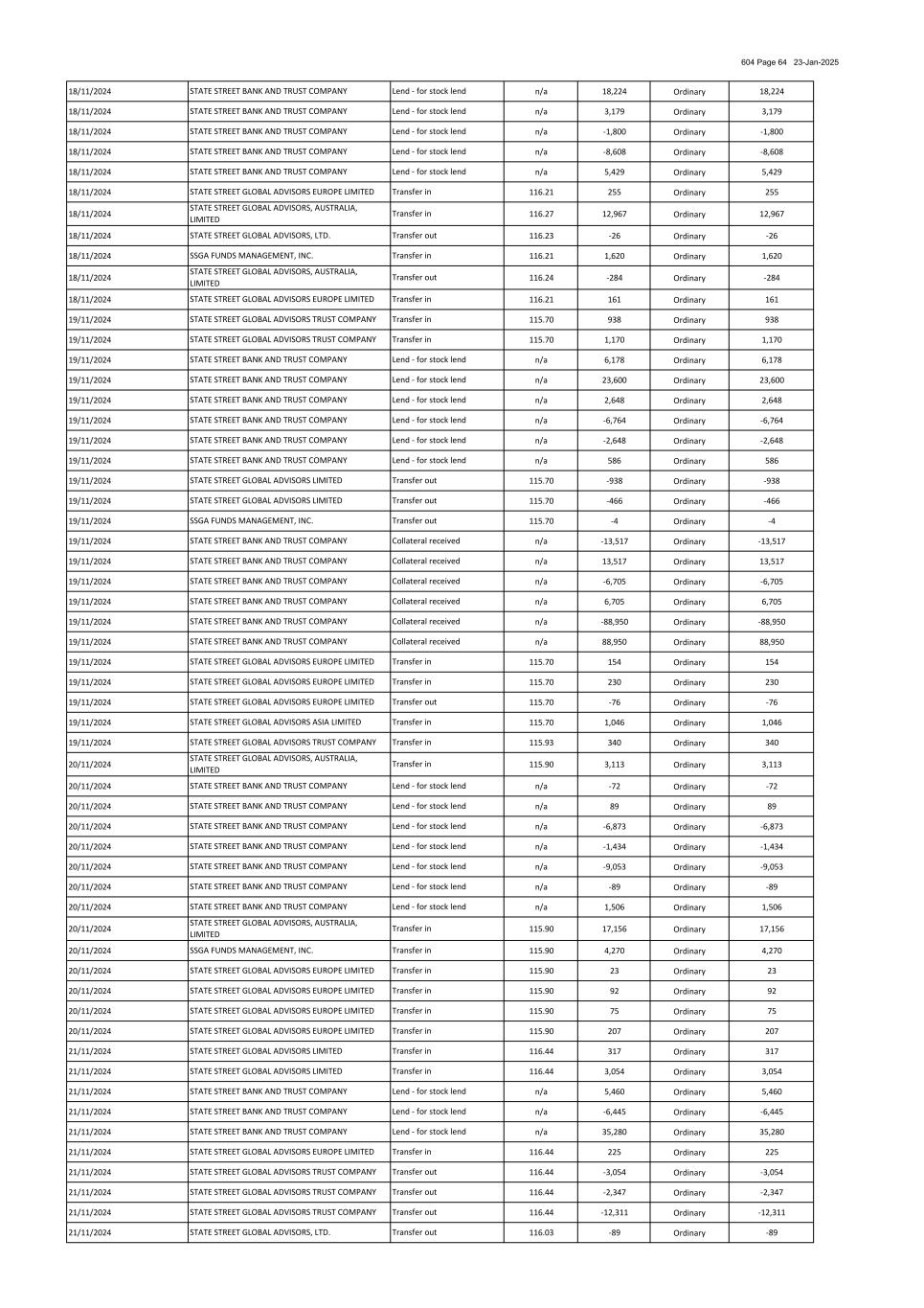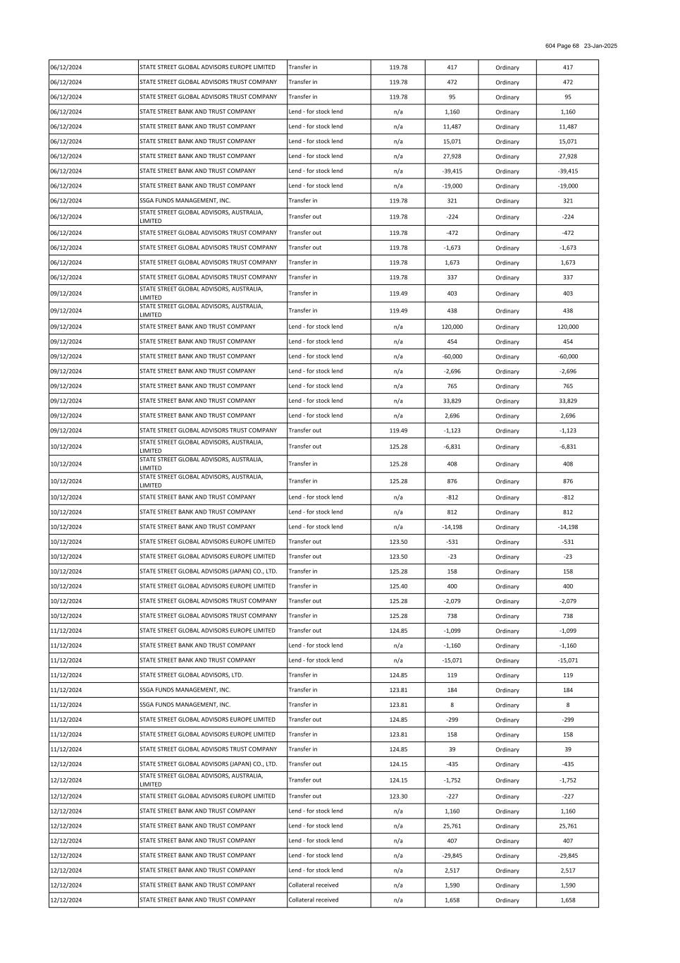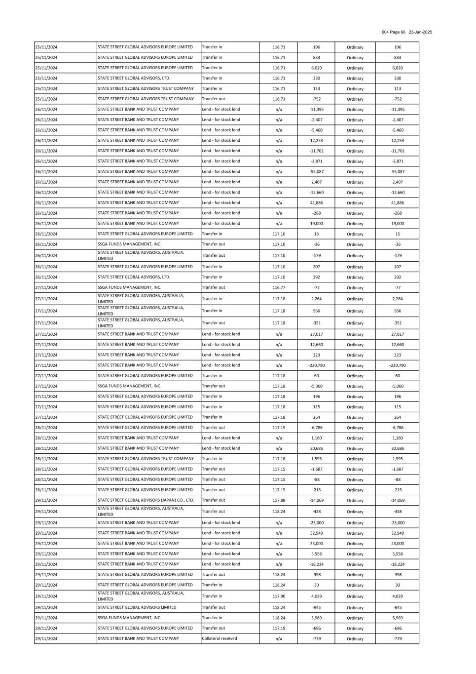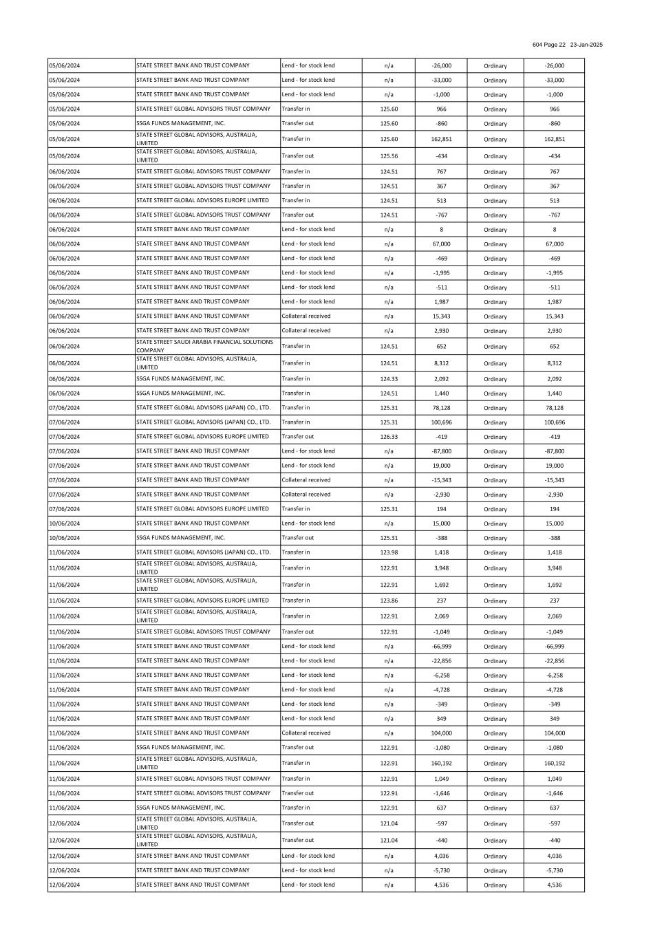 604 Page 52 23-Jan-2025 01/10/2024 n/a -16 Ordinary -16 01/10/2024 n/a -287 Ordinary -287 01/10/2024 n/a -468 Ordinary -468 01/10/2024 n/a -1 Ordinary -1 01/10/2024 n/a -2,317 Ordinary -2,317 01/10/2024 n/a -187 Ordinary -187 01/10/2024 n/a 11 Ordinary 11 01/10/2024 n/a -4 Ordinary -4 01/10/2024 n/a 200 Ordinary 200 01/10/2024 n/a -1 Ordinary -1 01/10/2024 n/a -12 Ordinary -12 01/10/2024 n/a 17 Ordinary 17 01/10/2024 n/a 20 Ordinary 20 01/10/2024 n/a 565 Ordinary 565 01/10/2024 n/a -43 Ordinary -43 01/10/2024 n/a 438 Ordinary 438 01/10/2024 n/a -1 Ordinary -1 01/10/2024 n/a -2 Ordinary -2 01/10/2024 n/a -4,556 Ordinary -4,556 01/10/2024 n/a -70 Ordinary -70 01/10/2024 n/a -40 Ordinary -40 01/10/2024 125.74 9,392 Ordinary 9,392 01/10/2024 125.74 744 Ordinary 744 01/10/2024 125.70 4,099 Ordinary 4,099 01/10/2024 125.74 15 Ordinary 15 01/10/2024 125.74 -1,095 Ordinary -1,095 01/10/2024 125.70 -506 Ordinary -506 01/10/2024 125.74 874 Ordinary 874 01/10/2024 125.74 230 Ordinary 230 01/10/2024 125.74 69 Ordinary 69 01/10/2024 125.74 -9,392 Ordinary -9,392 02/10/2024 125.96 2,256 Ordinary 2,256 02/10/2024 125.96 -3,102 Ordinary -3,102 02/10/2024 125.96 -1,314 Ordinary -1,314 02/10/2024 125.96 2,259 Ordinary 2,259 02/10/2024 125.96 -617 Ordinary -617 02/10/2024 n/a 6,167 Ordinary 6,167 02/10/2024 n/a -3,647 Ordinary -3,647 02/10/2024 n/a 167,030 Ordinary 167,030 02/10/2024 n/a 961 Ordinary 961 02/10/2024 n/a 204 Ordinary 204 02/10/2024 n/a 200,000 Ordinary 200,000 02/10/2024 n/a -6,202 Ordinary -6,202 02/10/2024 n/a -142,329 Ordinary -142,329 02/10/2024 n/a -961 Ordinary -961 02/10/2024 n/a 109 Ordinary 109 02/10/2024 n/a -169,460 Ordinary -169,460 02/10/2024 n/a 1,422 Ordinary 1,422 02/10/2024 n/a 68 Ordinary 68 02/10/2024 n/a 46 Ordinary 46 02/10/2024 n/a -5 Ordinary -5 02/10/2024 n/a 1 Ordinary 1 02/10/2024 n/a -10,104 Ordinary -10,104 02/10/2024 n/a -148 Ordinary -148 02/10/2024 n/a -39 Ordinary -39 02/10/2024 n/a -8 Ordinary -8 02/10/2024 n/a 13 Ordinary 13 STATE STREET GLOBAL ADVISORS EUROPE LIMITED Collateral received Lend - for stock lend STATE STREET GLOBAL ADVISORS, AUSTRALIA, LIMITED Collateral received STATE STREET BANK AND TRUST COMPANY Transfer in STATE STREET BANK AND TRUST COMPANY Transfer in STATE STREET GLOBAL ADVISORS EUROPE LIMITED Lend - for stock lend STATE STREET BANK AND TRUST COMPANY Transfer in STATE STREET BANK AND TRUST COMPANY STATE STREET BANK AND TRUST COMPANY STATE STREET BANK AND TRUST COMPANY STATE STREET BANK AND TRUST COMPANY Collateral received Lend - for stock lend STATE STREET GLOBAL ADVISORS EUROPE LIMITED STATE STREET BANK AND TRUST COMPANY Transfer out STATE STREET BANK AND TRUST COMPANY Collateral received Transfer in STATE STREET BANK AND TRUST COMPANY Collateral received STATE STREET BANK AND TRUST COMPANY STATE STREET BANK AND TRUST COMPANY Collateral received Lend - for stock lend STATE STREET GLOBAL ADVISORS EUROPE LIMITED STATE STREET BANK AND TRUST COMPANY STATE STREET BANK AND TRUST COMPANY STATE STREET BANK AND TRUST COMPANY Collateral received STATE STREET GLOBAL ADVISORS EUROPE LIMITED Lend - for stock lend Collateral received Transfer out Collateral received STATE STREET GLOBAL ADVISORS, AUSTRALIA, LIMITED Collateral received Lend - for stock lend Transfer in Collateral received STATE STREET BANK AND TRUST COMPANY STATE STREET GLOBAL ADVISORS EUROPE LIMITED Collateral received Transfer out STATE STREET BANK AND TRUST COMPANY STATE STREET GLOBAL ADVISORS TRUST COMPANY STATE STREET BANK AND TRUST COMPANY STATE STREET BANK AND TRUST COMPANY STATE STREET BANK AND TRUST COMPANY STATE STREET BANK AND TRUST COMPANY Lend - for stock lend Collateral received STATE STREET BANK AND TRUST COMPANY STATE STREET BANK AND TRUST COMPANY Lend - for stock lend Transfer out Collateral received STATE STREET GLOBAL ADVISORS TRUST COMPANY Lend - for stock lend STATE STREET BANK AND TRUST COMPANY Collateral received STATE STREET BANK AND TRUST COMPANY STATE STREET GLOBAL ADVISORS, AUSTRALIA, LIMITED STATE STREET BANK AND TRUST COMPANY Collateral received STATE STREET BANK AND TRUST COMPANY Collateral received Transfer in STATE STREET BANK AND TRUST COMPANY STATE STREET BANK AND TRUST COMPANY Collateral received STATE STREET BANK AND TRUST COMPANY Transfer out Collateral received STATE STREET BANK AND TRUST COMPANY Collateral received SSGA FUNDS MANAGEMENT, INC. Lend - for stock lend Transfer out STATE STREET BANK AND TRUST COMPANY STATE STREET BANK AND TRUST COMPANY STATE STREET BANK AND TRUST COMPANY Transfer in STATE STREET GLOBAL ADVISORS EUROPE LIMITED Collateral received Collateral received Lend - for stock lend STATE STREET BANK AND TRUST COMPANY Collateral received STATE STREET BANK AND TRUST COMPANY Lend - for stock lend Transfer in STATE STREET BANK AND TRUST COMPANY STATE STREET BANK AND TRUST COMPANY Collateral received Collateral received Collateral received STATE STREET BANK AND TRUST COMPANY STATE STREET BANK AND TRUST COMPANY Collateral received STATE STREET BANK AND TRUST COMPANY Transfer in STATE STREET GLOBAL ADVISORS, AUSTRALIA, LIMITED Collateral received STATE STREET GLOBAL ADVISORS EUROPE LIMITED Lend - for stock lend STATE STREET BANK AND TRUST COMPANY Collateral received