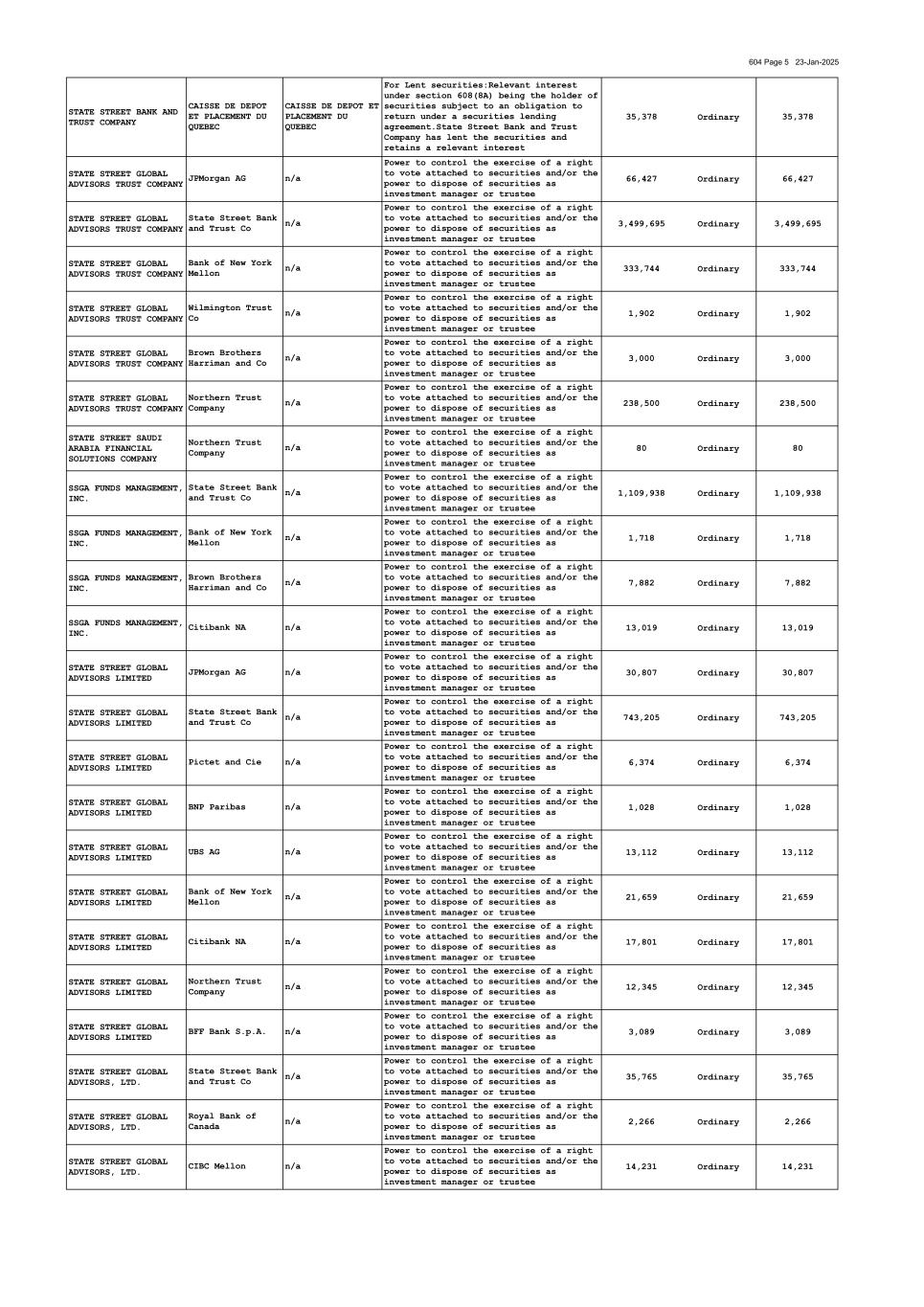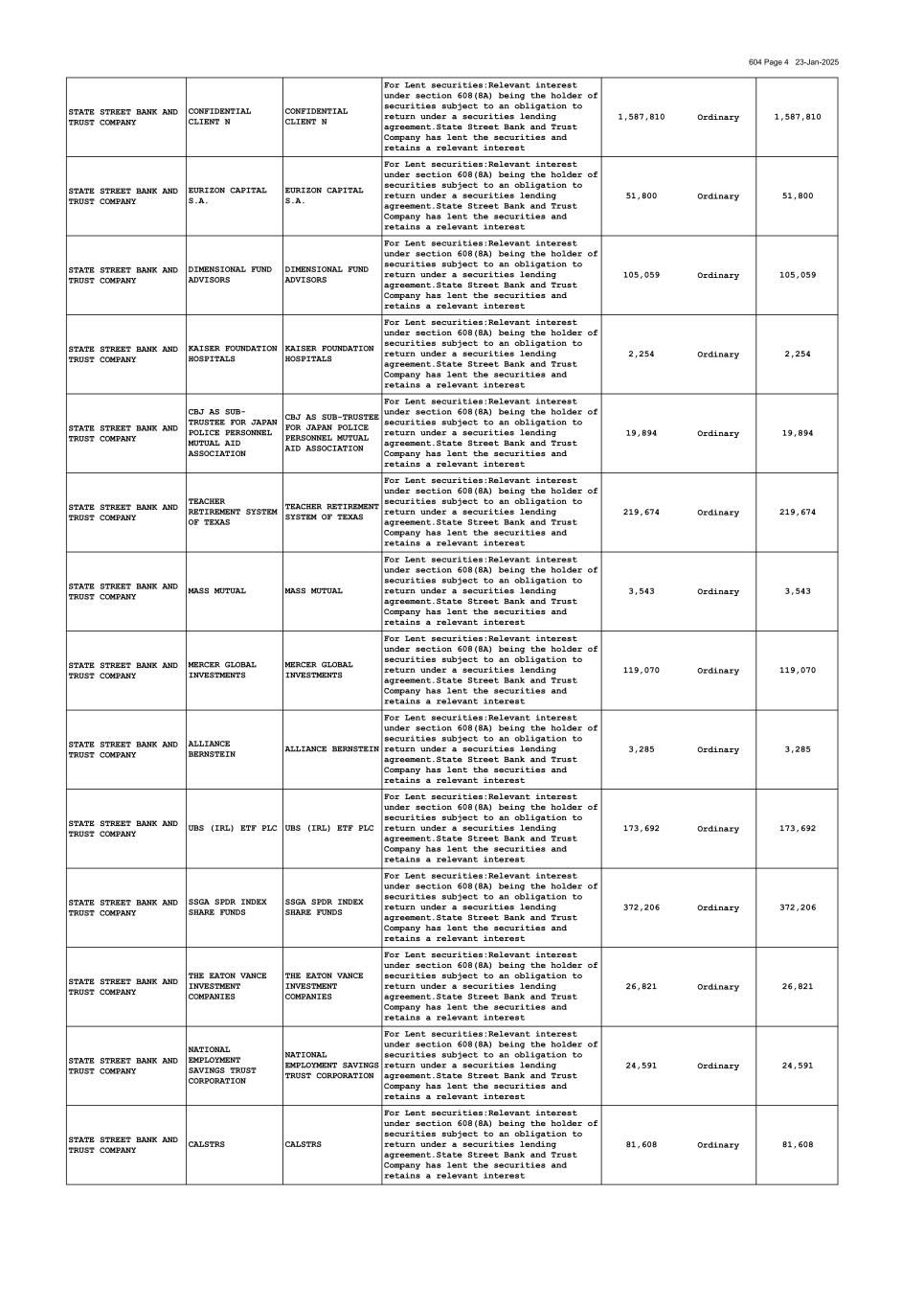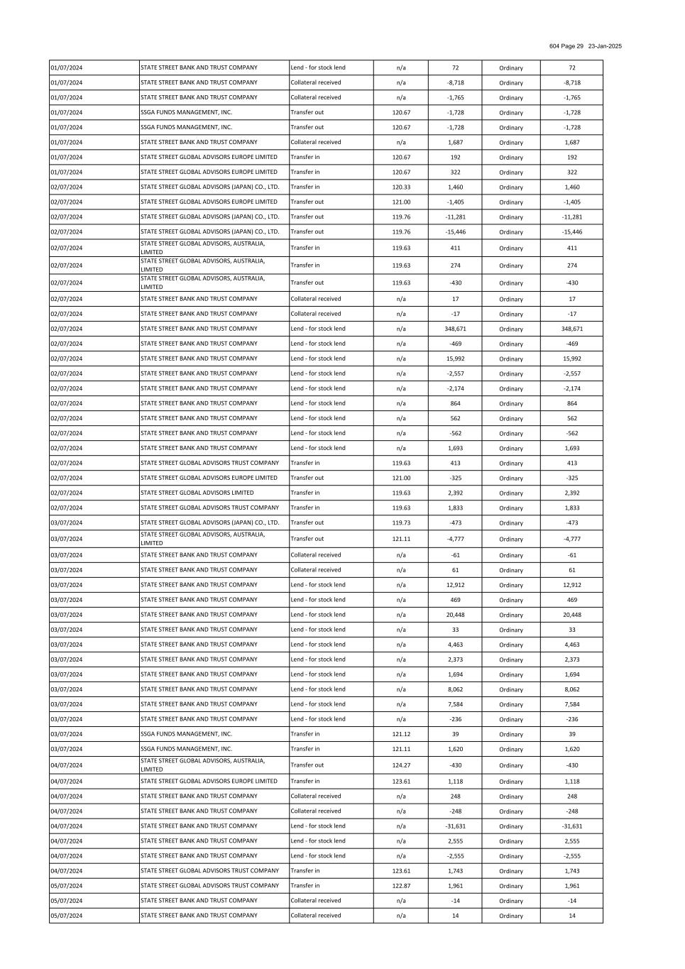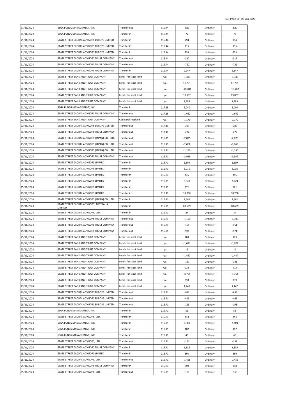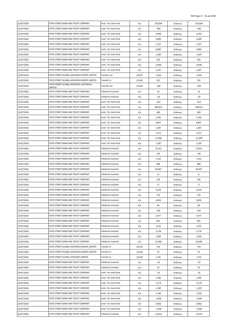 604 Page 52 23-Jan-2025 01/10/2024 n/a -16 Ordinary -16 01/10/2024 n/a -287 Ordinary -287 01/10/2024 n/a -468 Ordinary -468 01/10/2024 n/a -1 Ordinary -1 01/10/2024 n/a -2,317 Ordinary -2,317 01/10/2024 n/a -187 Ordinary -187 01/10/2024 n/a 11 Ordinary 11 01/10/2024 n/a -4 Ordinary -4 01/10/2024 n/a 200 Ordinary 200 01/10/2024 n/a -1 Ordinary -1 01/10/2024 n/a -12 Ordinary -12 01/10/2024 n/a 17 Ordinary 17 01/10/2024 n/a 20 Ordinary 20 01/10/2024 n/a 565 Ordinary 565 01/10/2024 n/a -43 Ordinary -43 01/10/2024 n/a 438 Ordinary 438 01/10/2024 n/a -1 Ordinary -1 01/10/2024 n/a -2 Ordinary -2 01/10/2024 n/a -4,556 Ordinary -4,556 01/10/2024 n/a -70 Ordinary -70 01/10/2024 n/a -40 Ordinary -40 01/10/2024 125.74 9,392 Ordinary 9,392 01/10/2024 125.74 744 Ordinary 744 01/10/2024 125.70 4,099 Ordinary 4,099 01/10/2024 125.74 15 Ordinary 15 01/10/2024 125.74 -1,095 Ordinary -1,095 01/10/2024 125.70 -506 Ordinary -506 01/10/2024 125.74 874 Ordinary 874 01/10/2024 125.74 230 Ordinary 230 01/10/2024 125.74 69 Ordinary 69 01/10/2024 125.74 -9,392 Ordinary -9,392 02/10/2024 125.96 2,256 Ordinary 2,256 02/10/2024 125.96 -3,102 Ordinary -3,102 02/10/2024 125.96 -1,314 Ordinary -1,314 02/10/2024 125.96 2,259 Ordinary 2,259 02/10/2024 125.96 -617 Ordinary -617 02/10/2024 n/a 6,167 Ordinary 6,167 02/10/2024 n/a -3,647 Ordinary -3,647 02/10/2024 n/a 167,030 Ordinary 167,030 02/10/2024 n/a 961 Ordinary 961 02/10/2024 n/a 204 Ordinary 204 02/10/2024 n/a 200,000 Ordinary 200,000 02/10/2024 n/a -6,202 Ordinary -6,202 02/10/2024 n/a -142,329 Ordinary -142,329 02/10/2024 n/a -961 Ordinary -961 02/10/2024 n/a 109 Ordinary 109 02/10/2024 n/a -169,460 Ordinary -169,460 02/10/2024 n/a 1,422 Ordinary 1,422 02/10/2024 n/a 68 Ordinary 68 02/10/2024 n/a 46 Ordinary 46 02/10/2024 n/a -5 Ordinary -5 02/10/2024 n/a 1 Ordinary 1 02/10/2024 n/a -10,104 Ordinary -10,104 02/10/2024 n/a -148 Ordinary -148 02/10/2024 n/a -39 Ordinary -39 02/10/2024 n/a -8 Ordinary -8 02/10/2024 n/a 13 Ordinary 13 STATE STREET GLOBAL ADVISORS EUROPE LIMITED Collateral received Lend - for stock lend STATE STREET GLOBAL ADVISORS, AUSTRALIA, LIMITED Collateral received STATE STREET BANK AND TRUST COMPANY Transfer in STATE STREET BANK AND TRUST COMPANY Transfer in STATE STREET GLOBAL ADVISORS EUROPE LIMITED Lend - for stock lend STATE STREET BANK AND TRUST COMPANY Transfer in STATE STREET BANK AND TRUST COMPANY STATE STREET BANK AND TRUST COMPANY STATE STREET BANK AND TRUST COMPANY STATE STREET BANK AND TRUST COMPANY Collateral received Lend - for stock lend STATE STREET GLOBAL ADVISORS EUROPE LIMITED STATE STREET BANK AND TRUST COMPANY Transfer out STATE STREET BANK AND TRUST COMPANY Collateral received Transfer in STATE STREET BANK AND TRUST COMPANY Collateral received STATE STREET BANK AND TRUST COMPANY STATE STREET BANK AND TRUST COMPANY Collateral received Lend - for stock lend STATE STREET GLOBAL ADVISORS EUROPE LIMITED STATE STREET BANK AND TRUST COMPANY STATE STREET BANK AND TRUST COMPANY STATE STREET BANK AND TRUST COMPANY Collateral received STATE STREET GLOBAL ADVISORS EUROPE LIMITED Lend - for stock lend Collateral received Transfer out Collateral received STATE STREET GLOBAL ADVISORS, AUSTRALIA, LIMITED Collateral received Lend - for stock lend Transfer in Collateral received STATE STREET BANK AND TRUST COMPANY STATE STREET GLOBAL ADVISORS EUROPE LIMITED Collateral received Transfer out STATE STREET BANK AND TRUST COMPANY STATE STREET GLOBAL ADVISORS TRUST COMPANY STATE STREET BANK AND TRUST COMPANY STATE STREET BANK AND TRUST COMPANY STATE STREET BANK AND TRUST COMPANY STATE STREET BANK AND TRUST COMPANY Lend - for stock lend Collateral received STATE STREET BANK AND TRUST COMPANY STATE STREET BANK AND TRUST COMPANY Lend - for stock lend Transfer out Collateral received STATE STREET GLOBAL ADVISORS TRUST COMPANY Lend - for stock lend STATE STREET BANK AND TRUST COMPANY Collateral received STATE STREET BANK AND TRUST COMPANY STATE STREET GLOBAL ADVISORS, AUSTRALIA, LIMITED STATE STREET BANK AND TRUST COMPANY Collateral received STATE STREET BANK AND TRUST COMPANY Collateral received Transfer in STATE STREET BANK AND TRUST COMPANY STATE STREET BANK AND TRUST COMPANY Collateral received STATE STREET BANK AND TRUST COMPANY Transfer out Collateral received STATE STREET BANK AND TRUST COMPANY Collateral received SSGA FUNDS MANAGEMENT, INC. Lend - for stock lend Transfer out STATE STREET BANK AND TRUST COMPANY STATE STREET BANK AND TRUST COMPANY STATE STREET BANK AND TRUST COMPANY Transfer in STATE STREET GLOBAL ADVISORS EUROPE LIMITED Collateral received Collateral received Lend - for stock lend STATE STREET BANK AND TRUST COMPANY Collateral received STATE STREET BANK AND TRUST COMPANY Lend - for stock lend Transfer in STATE STREET BANK AND TRUST COMPANY STATE STREET BANK AND TRUST COMPANY Collateral received Collateral received Collateral received STATE STREET BANK AND TRUST COMPANY STATE STREET BANK AND TRUST COMPANY Collateral received STATE STREET BANK AND TRUST COMPANY Transfer in STATE STREET GLOBAL ADVISORS, AUSTRALIA, LIMITED Collateral received STATE STREET GLOBAL ADVISORS EUROPE LIMITED Lend - for stock lend STATE STREET BANK AND TRUST COMPANY Collateral received